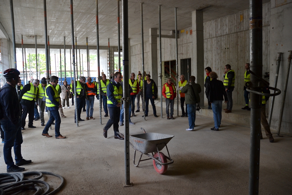 Wo die Stadträte bei der letzten Baustellentour noch in ein tiefes Loch blickten, ist inzwischen ein neues Gebäude entstanden. Schulleiterin Bärbel Kößler-Finkenzeller – erst seit wenigen Wochen im Amt – begrüßte die Gäste auf der Baustelle und meinte: „Ich merke jetzt erst, welche Aufgabe ich auf mich genommen habe.“ Gero Hofmann beruhigte sie: „Es wird alles gut“ und packte ein paar Zahlen aus: 36,1 Millionen Euro werden in diesem Projekt verbaut und der Ostflügel als das zentrale Neubauteil soll im Dezember 2022 vollendet sein. Im Untergrund entsteht eine neue Sporthalle: „Wir sind 70 Zentimeter tief im Grundwasser und außer der Archäologie hatten wir dort alles, was Spaß macht“. Gebaut wurde im Untergrund mit Beton: „Das Tragwerk trägt nicht nur die Gebäude darüber, sondern auch die Nachbargebäude. Diese stützen sich auf der Halle ab,“ so Hofmann. Über dem Betonbau wurde in Holzbauweise gearbeitet, was nicht unbedingt billiger, aber deutlich schneller ist.