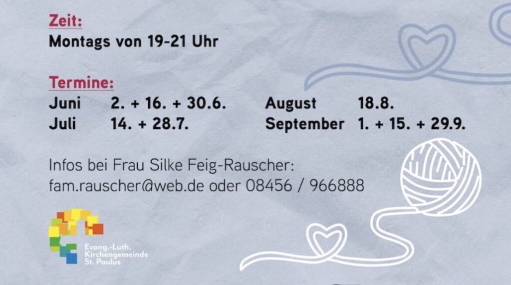 Der offene Handarbeitsgruppe Garn & Seele trifft sich am 01.09., 15. sowie am 29. September von 19.00 bis 21.00 Uhr im Dietrich-Bonhoeffer-Gemeindezentrum in Kösching. (Handarbeits-)Interessierte sind herzlich willkommen. Kontaktaufnahme über fam.rauscher@web.de