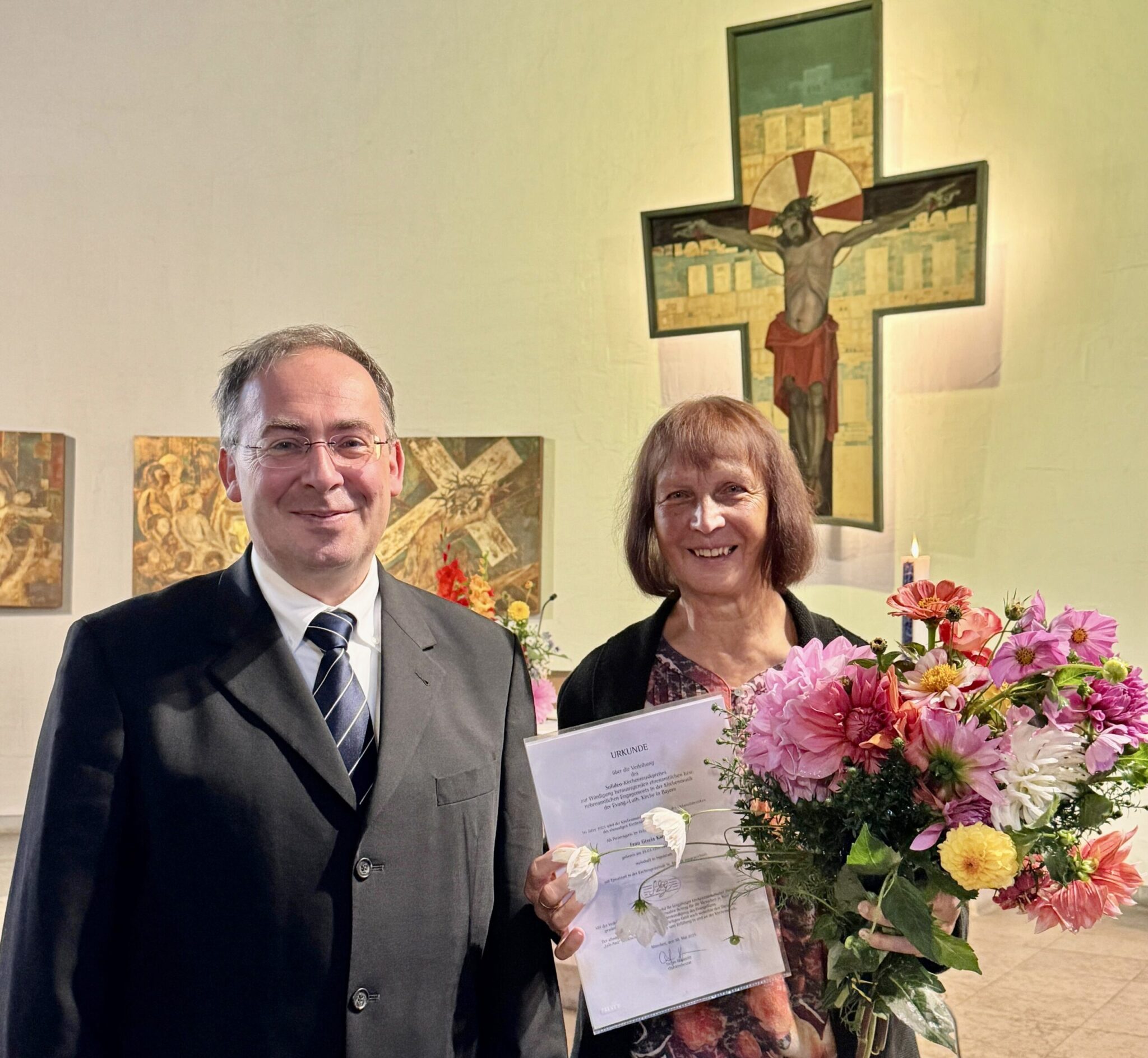 In diesem Jahr wurde der Preis am 14.9.2025 beim Gottesdienst in der Markuskirche an Gisela Karlin verliehen. Sie konnte bereits am Neujahrstag 2025 ihr 50-jähriges Dienstjubiläum in der Kirchengemeinde St. Markus feiern. Die Laudatio hielt Kirchenmusikdirektor Oliver Scheffels, der Frau Karlin bereits vor 35 Jahren kennlernte und schon damals von ihrem frischen und fröhlichen Orgelspiel begeistert war. Im Laufe der Jahre leitete sie mit Freude und viel Engagement etliche Flötenensembles und Chöre. Generationen von Kindern haben bei ihr Flöte und Klavier gelernt.