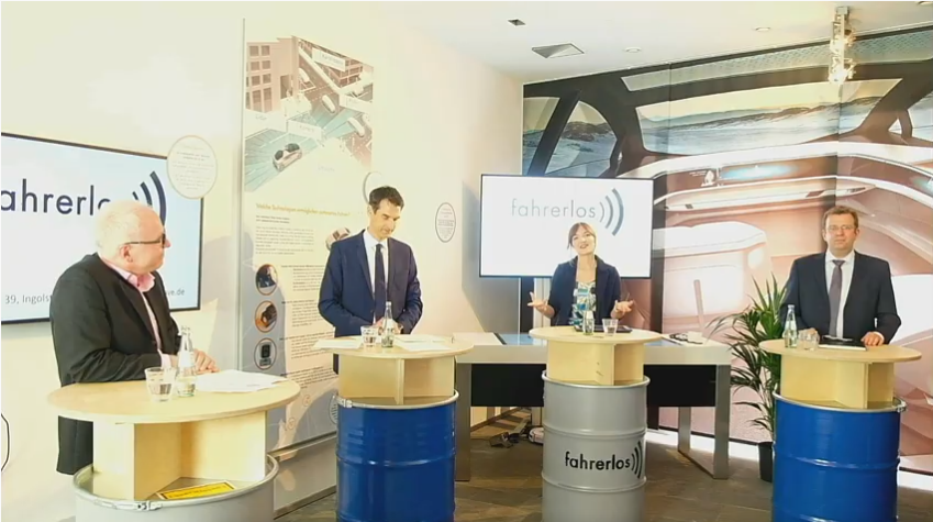 Und so ging es im Gespräch u.a. um Vernetzung, Datenaustausch (Remlinger: „Es geht darum sich zu sehen, auch wenn man sich nicht sieht“), Verkehrssteuerung, virtuelle Verkehrsmodelle, die Sinnhaftigkeit von vernetzter Mobilität, die Akzeptanz in der Bevölkerung (Hogreve: „Die Menschen stehen neuer Technologie grundsätzlich positiv gegenüber, aber es wird häufig vergessen, den Nutzen dieser Technologie zu vermitteln“), erhöhte Sicherheit durch vernetzte Mobilität und die staatliche Förderung von Projekten. Auch das SAVe Projekt im „fahrerlos“ wird gefördert: „Wir stehen hier in einem enormen Wettbewerb,“ meinte Reinhard Brandl. Die Wettbewerber würden in China oder den USA sitzen. Und Autos müssten in Zukunft nicht mehr zwingend von Automobilherstellern entwickelt und produziert werden. Das „SAVe“ Projekt ermögliche nun virtuelle Testfahrten durch die Region Ingolstadt, um die Entwicklung der vernetzten, autonomen Mobilität zu beschleunigen und diese so auch schneller auf den Markt zu bekommen. Aus Sicht der Industrie sei so ein virtuelles Testfeld ein echter Vorteil, bestätigte auch Georg Rosenfeld.
