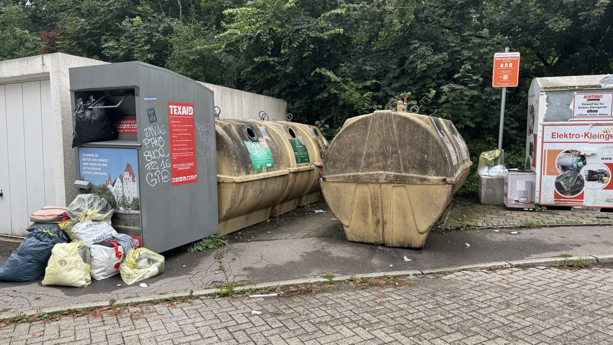 Abfälle und Wertstoffe, welche um die Container abgestellt werden, erschweren die Leerung der Container. Auch verschmutzen Altkleider außerhalb der Container. Sie sind damit nicht mehr tragbar und werden als Restmüll kostenpflichtig entsorgt. Werden Rest- und Sperrmüll um die Container abgestellt, ist dies eine unerlaubte Ablagerung und kann als Ordnungswidrigkeit geahndet werden.