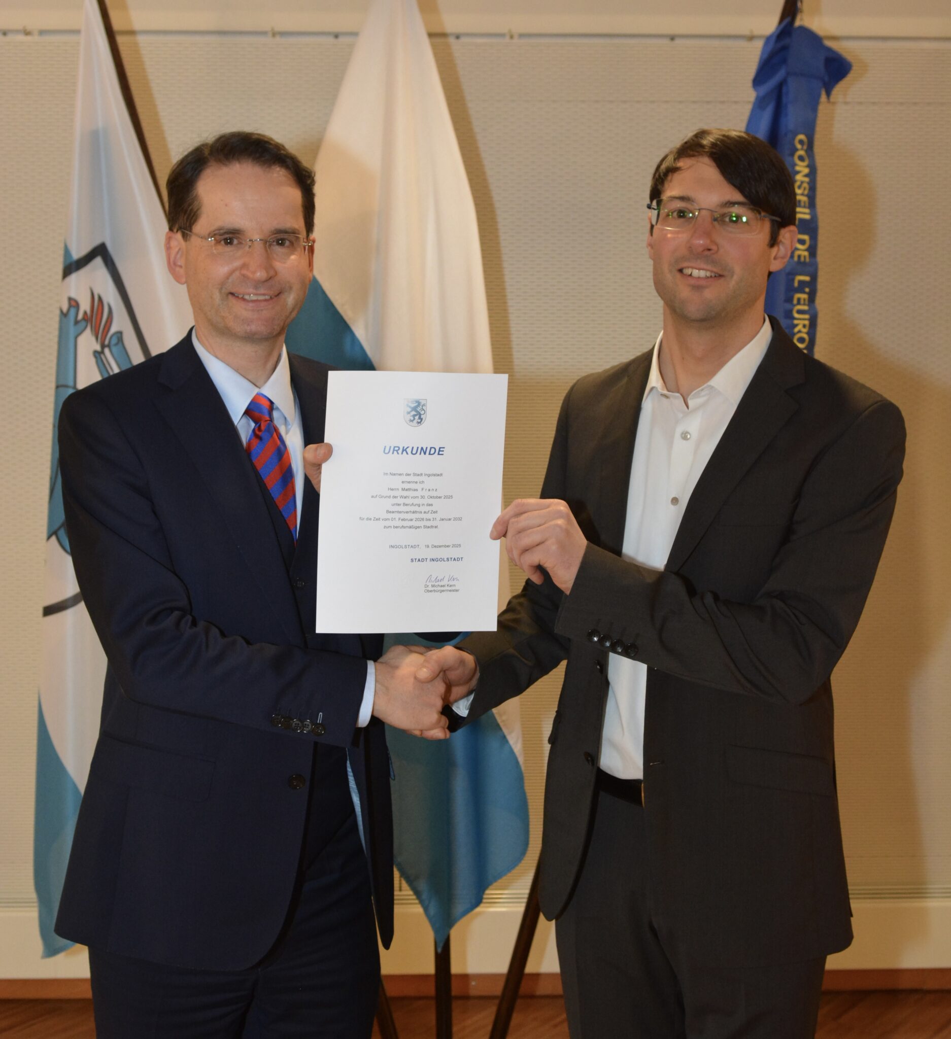 Im Namen der Stadt Ingolstadt hat Oberbürgermeister Dr. Michael Kern die Ernennungsurkunde an den neuen Referenten für Hoch- und Tiefbau, Matthias Franz, überreicht.