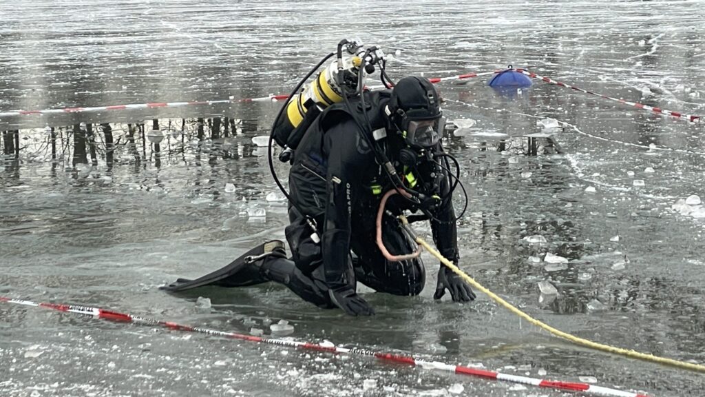Vorsicht Gefahr! Gestern übte die Berufsfeuerwehr Ingolstadt am Auwaldsee für den Notfall. Eistauchen und Eisrettung sind im Winter ein wichtiges Thema und es muss im