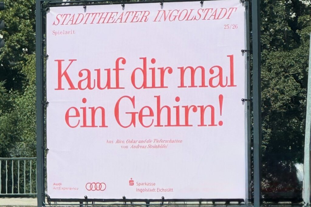 „Kauf dir mal ein Gehirn!“ – dieser Satz springt einem derzeit auf der Münchner Straße knallrot ins Auge. Plakatiert auf der Großflächenstelle des Stadttheaters Ingolstadt. Ein Stück Theaterwerbung? Ja. Aber irgendwie auch mehr. Der Satz stammt – wie unten kleingedruckt zu lesen – aus dem Jugendstück „Rico, Oskar und die Tieferschatten“ von Andreas Steinhöfel. Und […]