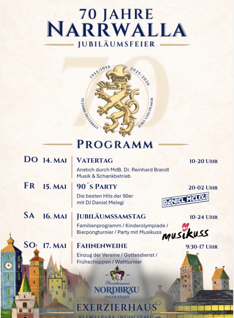 Die Faschingsgesellschaft Narrwalla Ingolstadt lädt vom 14. bis 17. Mai 2026 zu einem großen Jubiläumsfest ins Exerzierhaus im Klenzepark ein. Über vier Tage hinweg erwartet die Besucherinnen und Besucher ein vielseitiges Programm aus Tradition, Party, Familienangeboten und Vereinsleben. Dabei ist das Fest weit mehr als nur ein Jubiläum: Es dient zugleich als bewusster Praxistest für […]