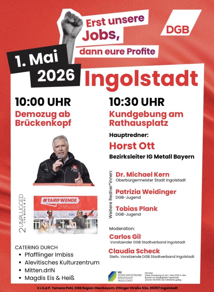 Auch in diesem Jahr rufen der Deutsche Gewerkschaftsbund (DGB) und seine Mitgliedsgewerkschaften am Tag der Arbeit 2026 wieder zu Demonstrationen, Kundgebungen und vielfältigen Aktionen in der gesamten Bundesrepublik auf. Unter dem Motto „Erst unsere Jobs, dann eure Profite“ machen die Gewerkschaften deutlich: Gute Arbeit, soziale Sicherheit und faire Lebensbedingungen stehen im Mittelpunkt. Angesichts wachsender Unsicherheiten […]