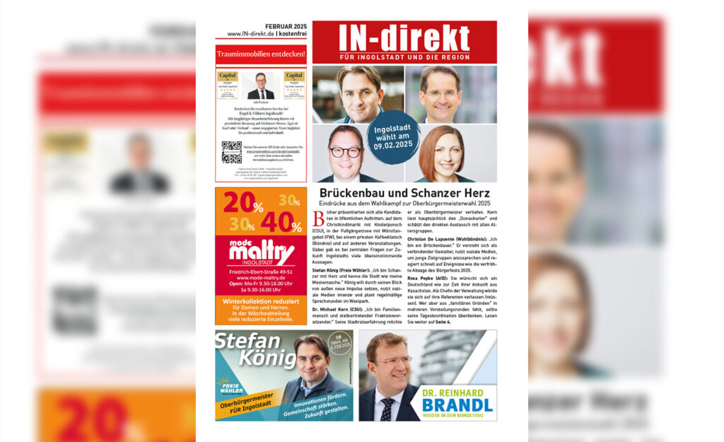 Die neue IN-direkt – Zeitung für Ingolstadt und die Region ist da! Wie immer verteilt als gedruckte Ausgabe an knapp 65.000 Haushalte in Ingolstadt oder schon jetzt hier online als blätterbares PDF nur einen Klick entfernt https://in-direkt.de/aktuell/52069/printausgabe-in-direkt-2025-februar/
