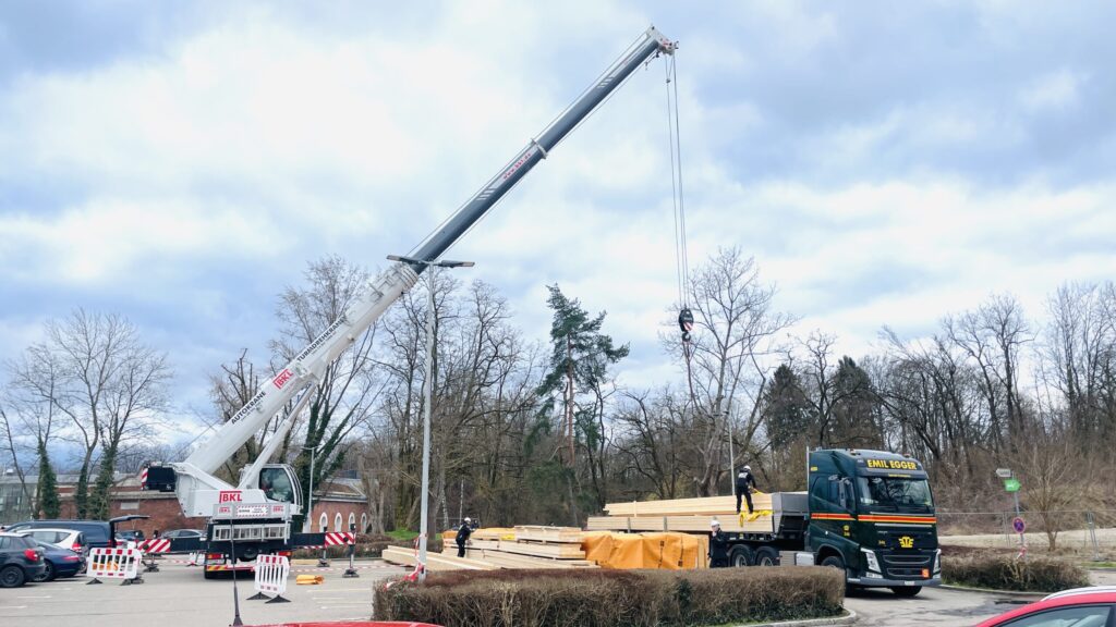 Heute (19.02.2024) kamen die ersten drei Schwertransporter aus St. Gallen mit den größten Teilen an. Und nun geht es Stück für Stück weiter. Ab 19. März wird dann der Hallenbad Parkplatz im Bereich der Dauerparker komplett gesperrt um mit vollen Arbeitseinsatz arbeiten zu können.