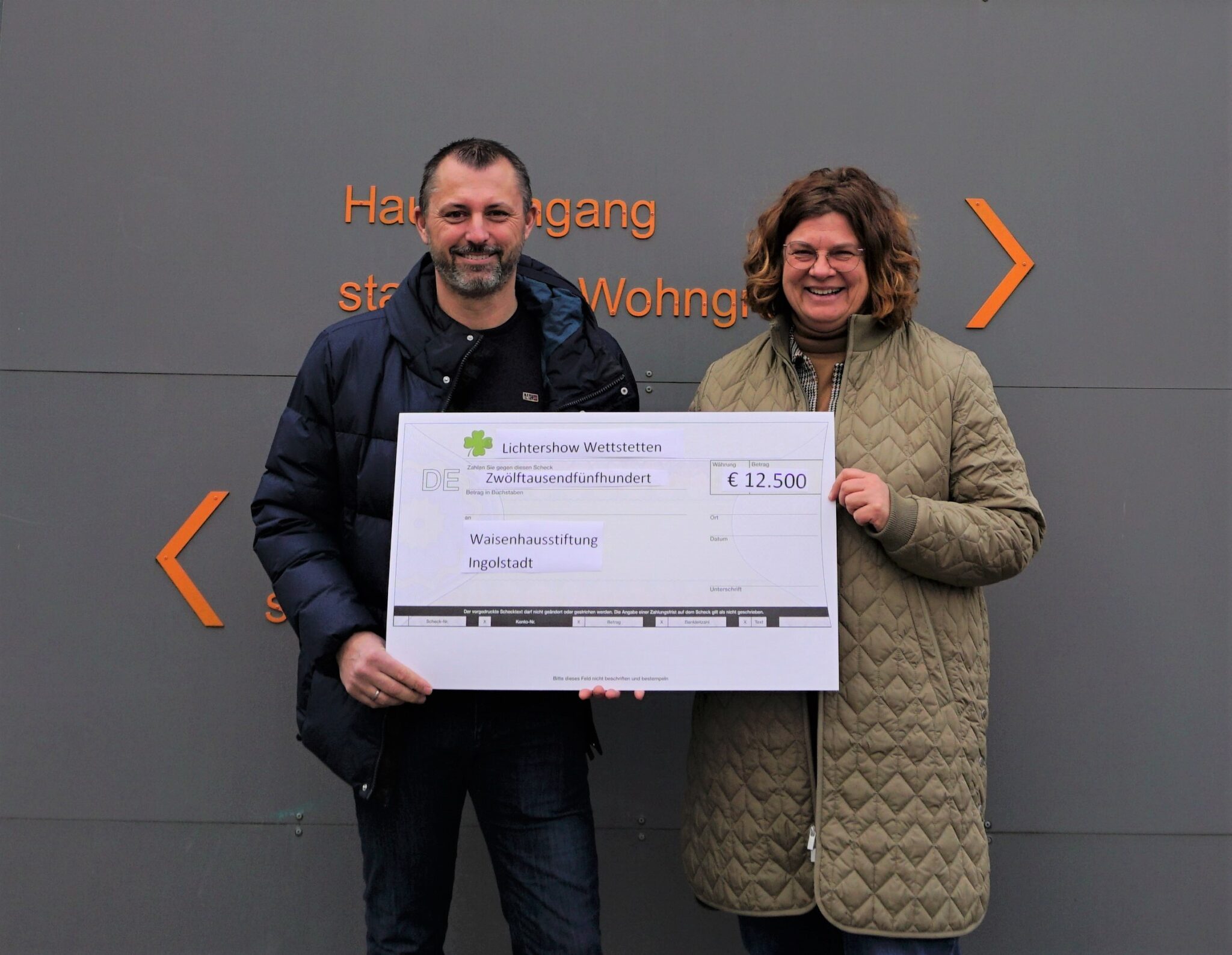 Zum dritten Mal hat Martin Silbernagl seine beeindruckende Weihnachtslichter-Show in seinem Garten in Wettstetten veranstaltet. In diesem Jahr schenkte er dabei 300 Liter Glühwein und Kinderpunsch aus und sammelte so 12.500 Euro. Diese Summe spendete er an die Waisenhausstiftung Ingolstadt und Frau Sabine Bülow nahm die Spende dankend entgegen.