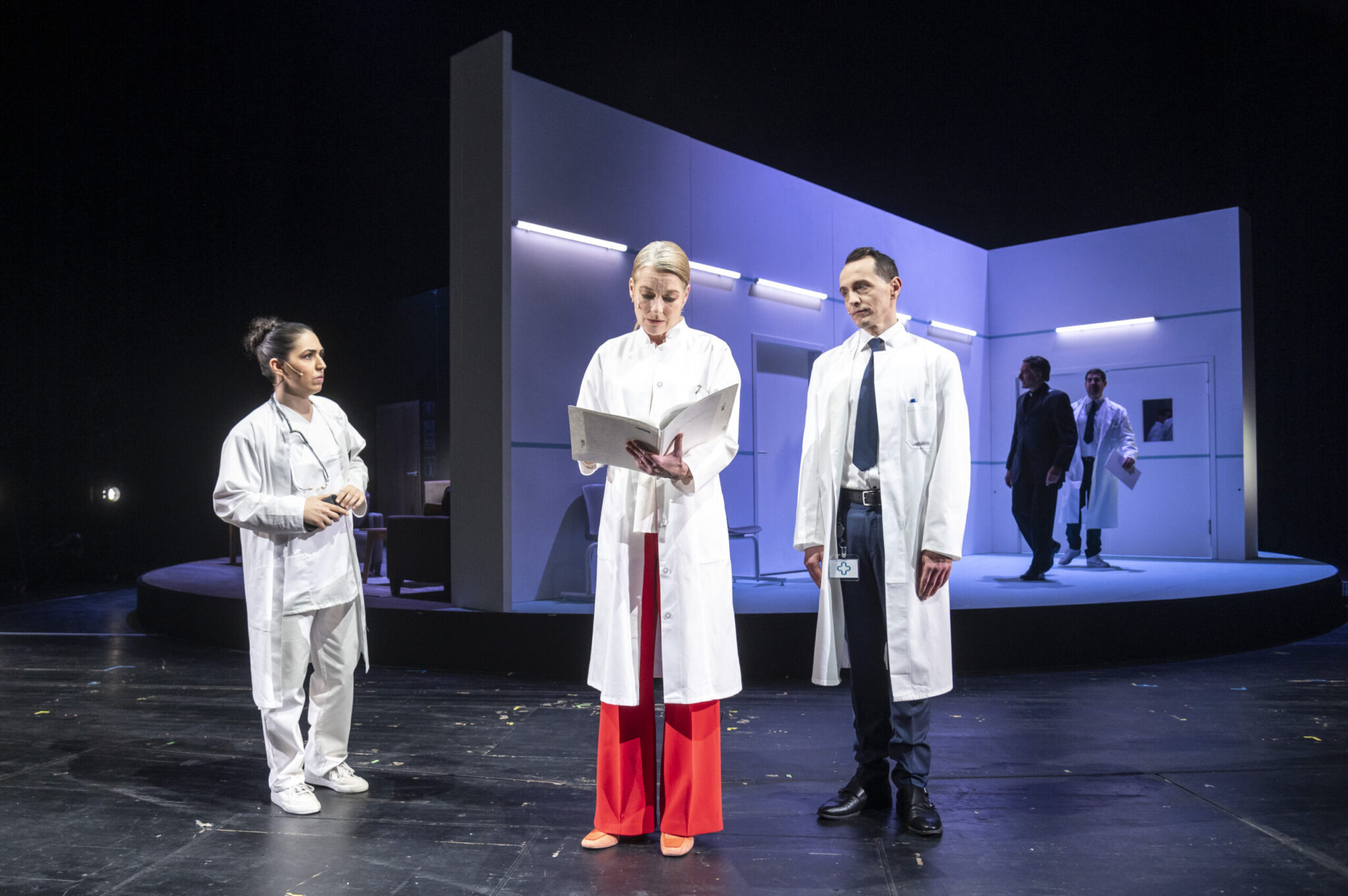 Für die herausragende Inszenierung konnte man Nurkan Erpulat gewinnen Mit Gitti Scherers Drehbühne, auf der mehrere Klinikräumen und einem gemütlichen Wohnzimmer.platziert sind, ist durchgängig ein Szenenwechsel mit schnellen Schnitten möglich. Die herausragende,dichte  Inszenierung überzeugt und begeistern durch ein ausnahmslos hervorragendes Ensemble: Diana Marie Müller, Richard Putzinger,  Peter, Reisser, Enrico Spohn, Murat Seven, Peter Polgar, Teresa Trauth, Berna Celebi und Julius Böhning. In der Rolle der Ärztin begeisterte die fantastische Viktoria Voss, die ohne Pause während der zwei Stunden auf der Bühne jede Minute absolut  präsent ist und überzeugte einmal mehr mit ihrem herausragenden Können.