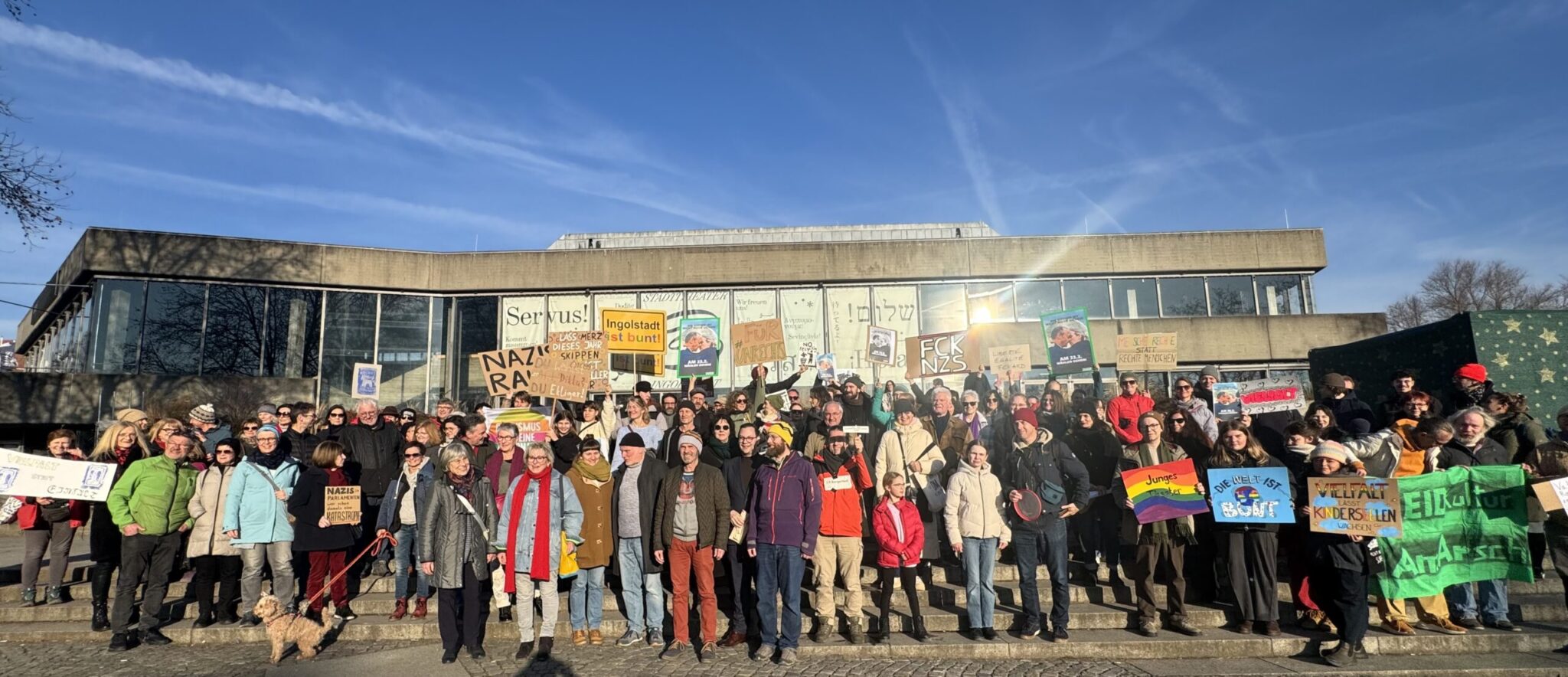Entsprechend dem Motto „In der Kürze liegt die Würze“ war die Kundgebung der Kunstschaffenden, die am Freitag, den  21. Februar um 16 Uhr am Stadttheater stattgefunden hatte, eine der kürzesten, an der ich jemals teilgenommen hatte.  Michael Amelung, Schauspieler am Ingolstädter Stadttheater mit dem Schwerpunkt „Junges Theater“ betonte wie sehr ihm nicht nur die Sorge um die freie Kunst, sondern auch die Sorge,  in welcher Welt seine zwei Kinder aufwachsen werden, umtreibe. Leni Brem-Keil positionierte sich als Kunstschaffende, Frau und Leiterin des Altstadttheaters gegen die rechten Tendenzen.
