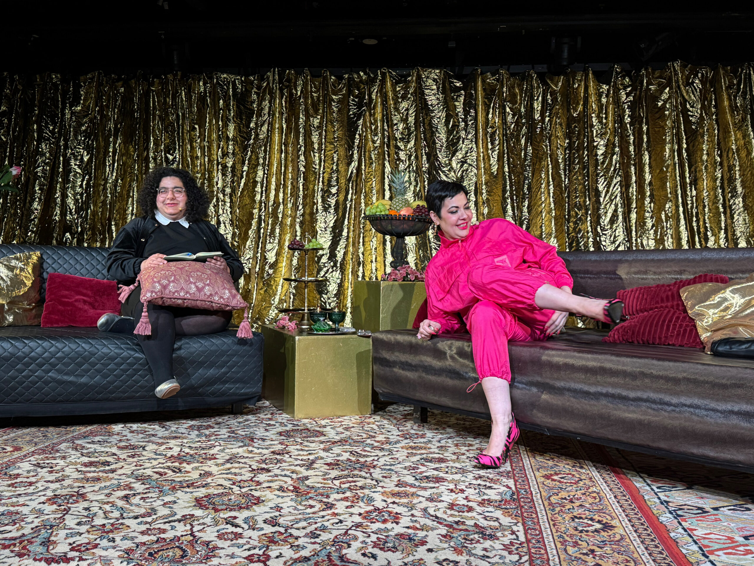 Dem erwarteten Gast, Lady Bitch Ray eilt, wegen ihrer oft provozierenden Auftritten in den Medien, ein Ruf wie Donnerhall, voraus. Wer allerdings eine provokante, schrille Performance am Freitag Abend in der Werkstattbühne des Stadttheaters erwartete, wurde möglicherweise diesbezüglich enttäuscht. Denn die üppig dekorierte Wellnessoase auf der Bühne lud zu einer Dedikodu ein, also einem Tratsch, Klatsch oder einem fröhlichen Ratschen – türkisch Dedikodu. Die Zuschauenden hatten am Freitag das Vergnügen an so einer Dedikodu teilzunehmen. Es war ein entspanntes, spritziges und kluges Geplänkel bis hin zur vertieften Diskussionen zwischen der Wissenschaftlerin, politischen Aktivistin, Buchautorin, Rapperin, Modedesignerin und Bildungsreferentin, Lady Bitch Ray aka Dr. Reyhan Sahin mit türkischen und der Regisseurin, Autorin und Performerin Antigone Akgün mit einem griechischen Hintergrund. Die beiden Frauen machten es sich auf den mit vielen bunten Kissen einladenden Couchs gemütlich und sinnieren darüber, ob und in welcher Art sie sich auch einmal Ruhe und Entspannung gönnen. Sahin erzählte wie schwer es ihrer Mutter, stellvertretend für diese Generation, fällt sich auch einmal Ruhe und Selbstfürsorge zu gönnen. Es folgt ein Appell an alle Frauen, für sich selbst gut zu sorgen. Oft reiche schon sich bewusst – vielleicht mit einer Gesichtsmaske – zu entspannen. Es können einfache Kleinigkeiten sein, entscheidend sei dabei, sich selbst etwas zu gönnen.