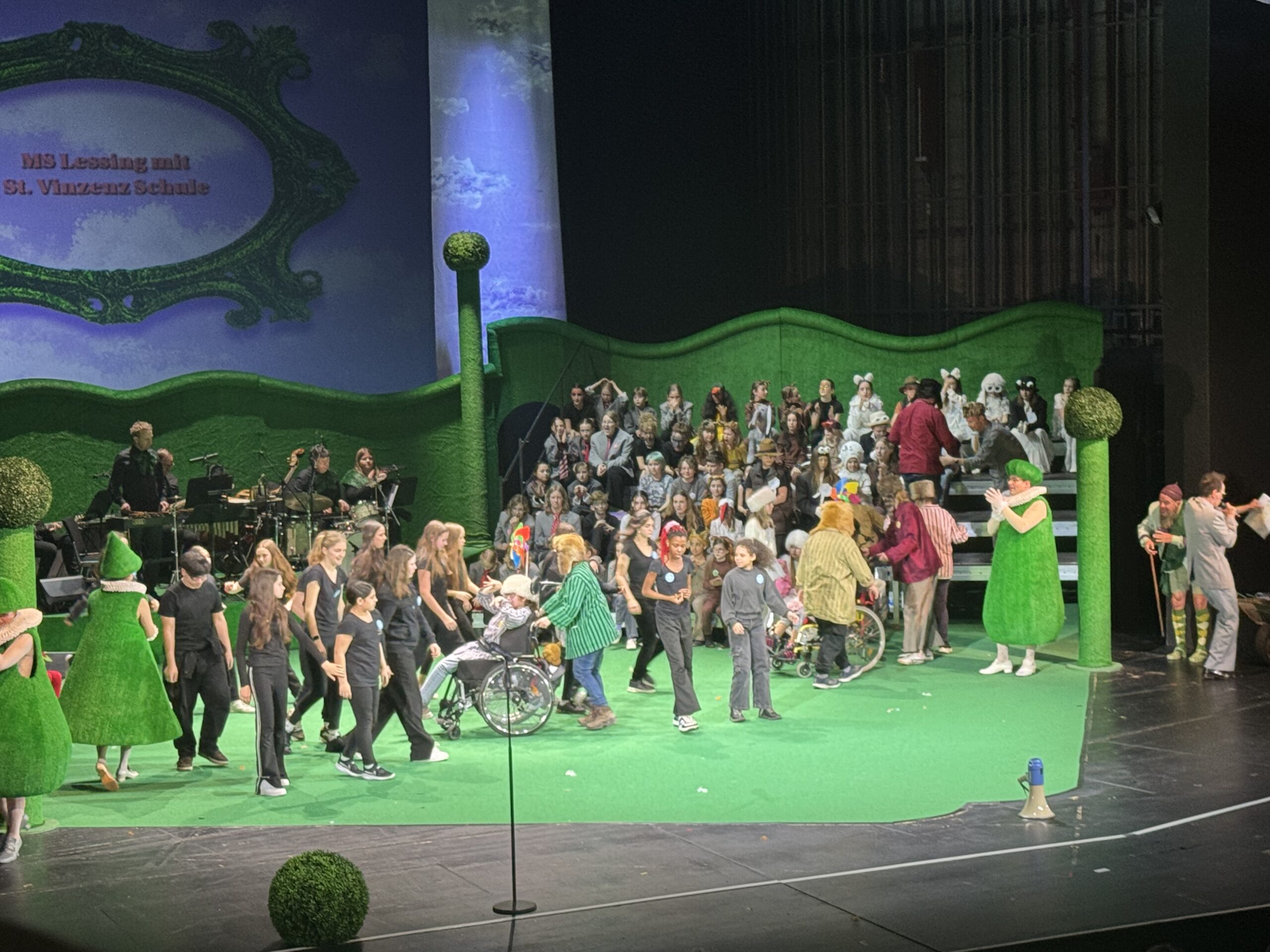 Was für ein lebhaftes, aufgeregtes Treiben, als Scharen von Kindern das Stadttheater für sich eroberten. Bereits im Foyer wurde man auf eine außergewöhnliche Veranstaltung eingestimmt: Es tummeln sich da viele tierische Gestalten: manche aus Papier oder Pappmaschee, aber auch viele quicklebendige Kinder, die ihrem großen Auftritt entgegenfieberten. Ursprünglich sollten die Schüler das Theater am Glacis für sich erobern. Da der Termin an diesem Ort nicht gehalten werden konnte, mussten die Aufführungen ins Große Haus verlegt werden. Aber den Kindern war es wohl eher egal, wo sie endlich das zeigen konnten, worauf sie sich seit dem Sommer in unzähligen Stunden und von engagierten Lehrkräften und Theaterprofis unterstützt, vorbereitet hatten. Seit Monaten wurde gebastelt, gesungen, getanzt, gemalt, Kostüme genäht, Plakate gemalt, Videos gedreht und viele mehr für ihre Konferenz der Tiere.
