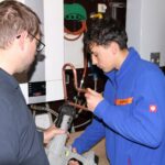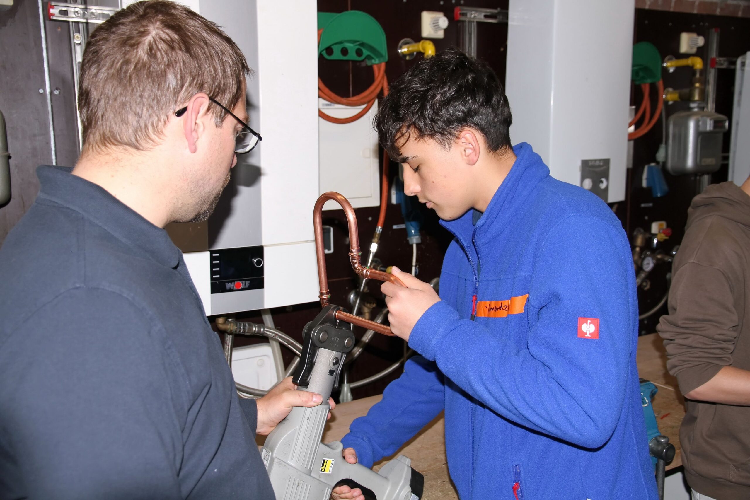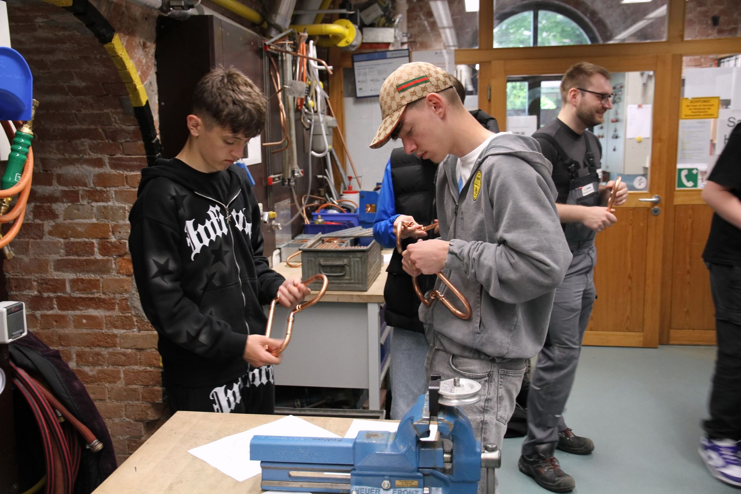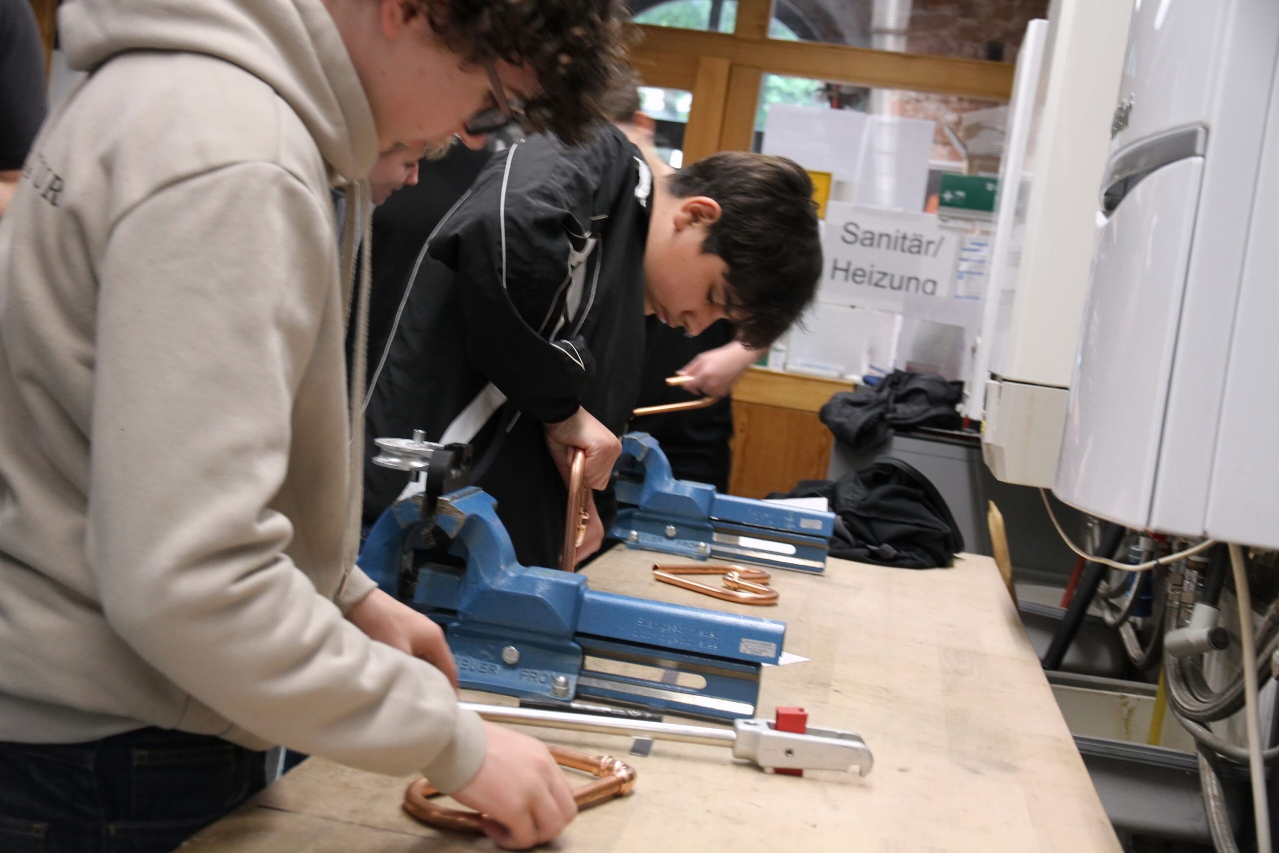 Wie man eine Mauer richtig hochzieht, lernten die Teilnehmenden bei der Bauinnung, während bei den Anlagenmechanikern Rohre gebogen wurden – das Ergebnis: ein kleines Herz aus Kupfer, das mit nach Hause genommen werden durfte.
