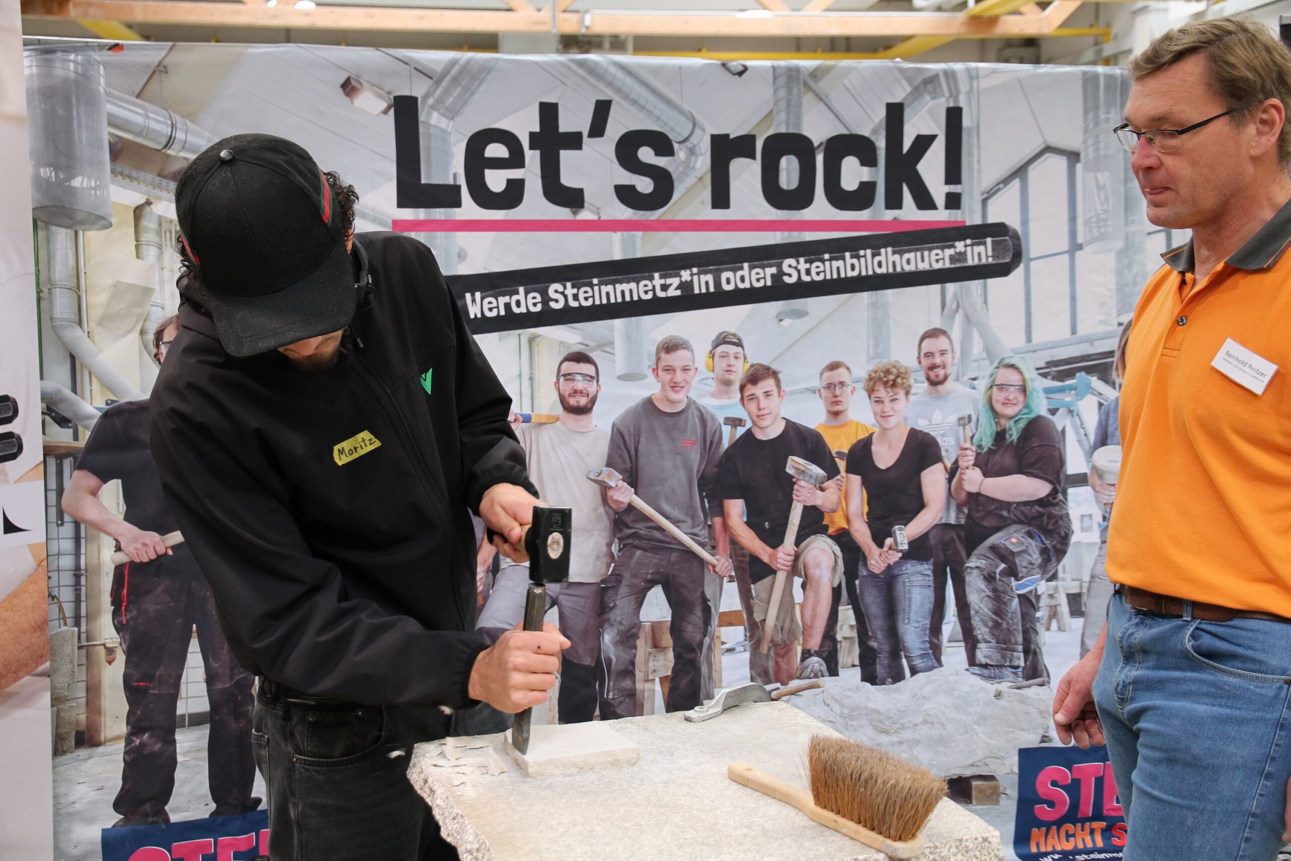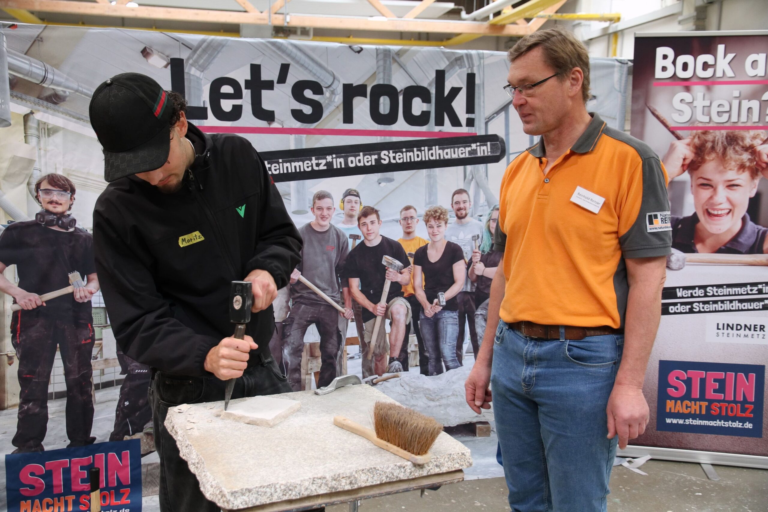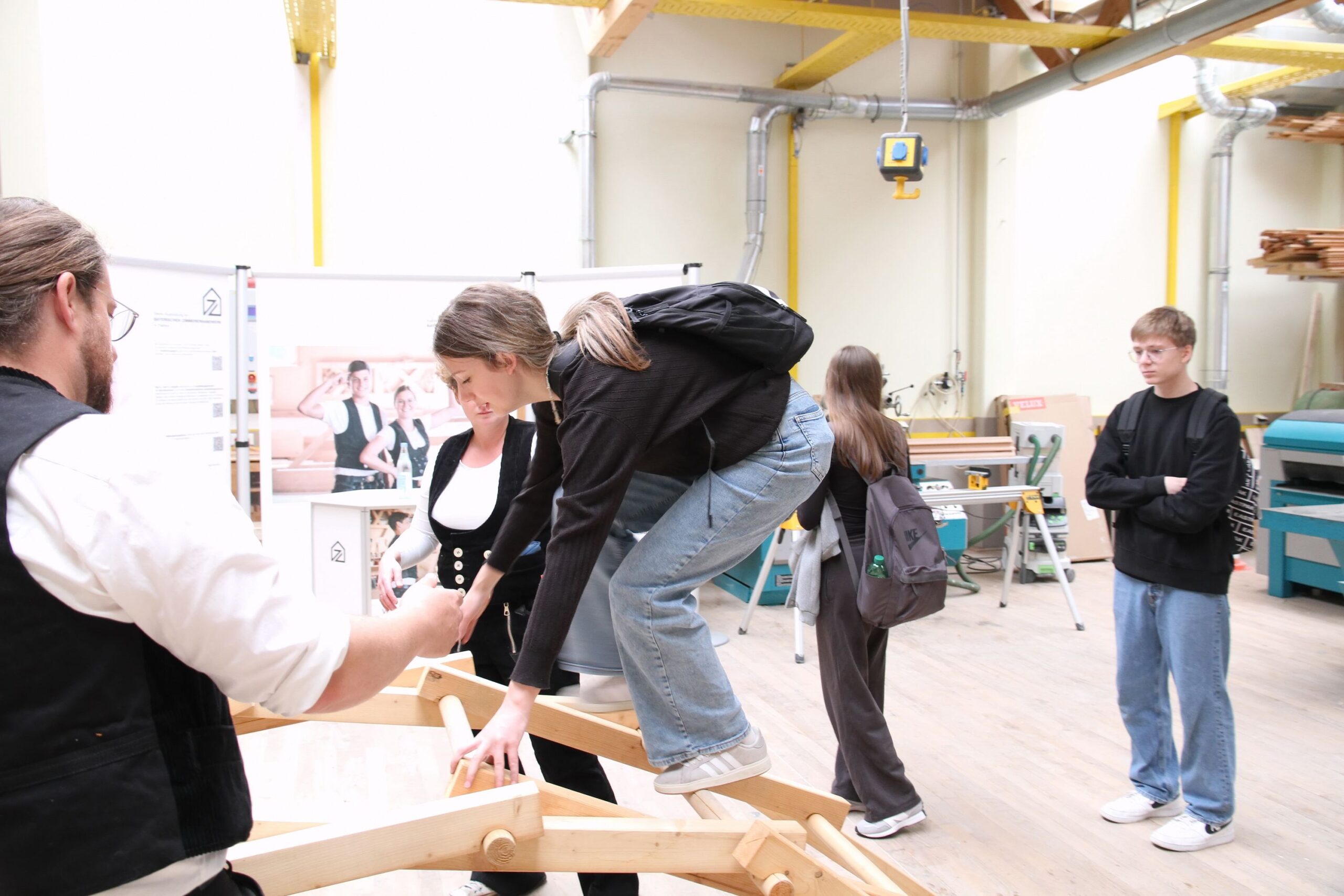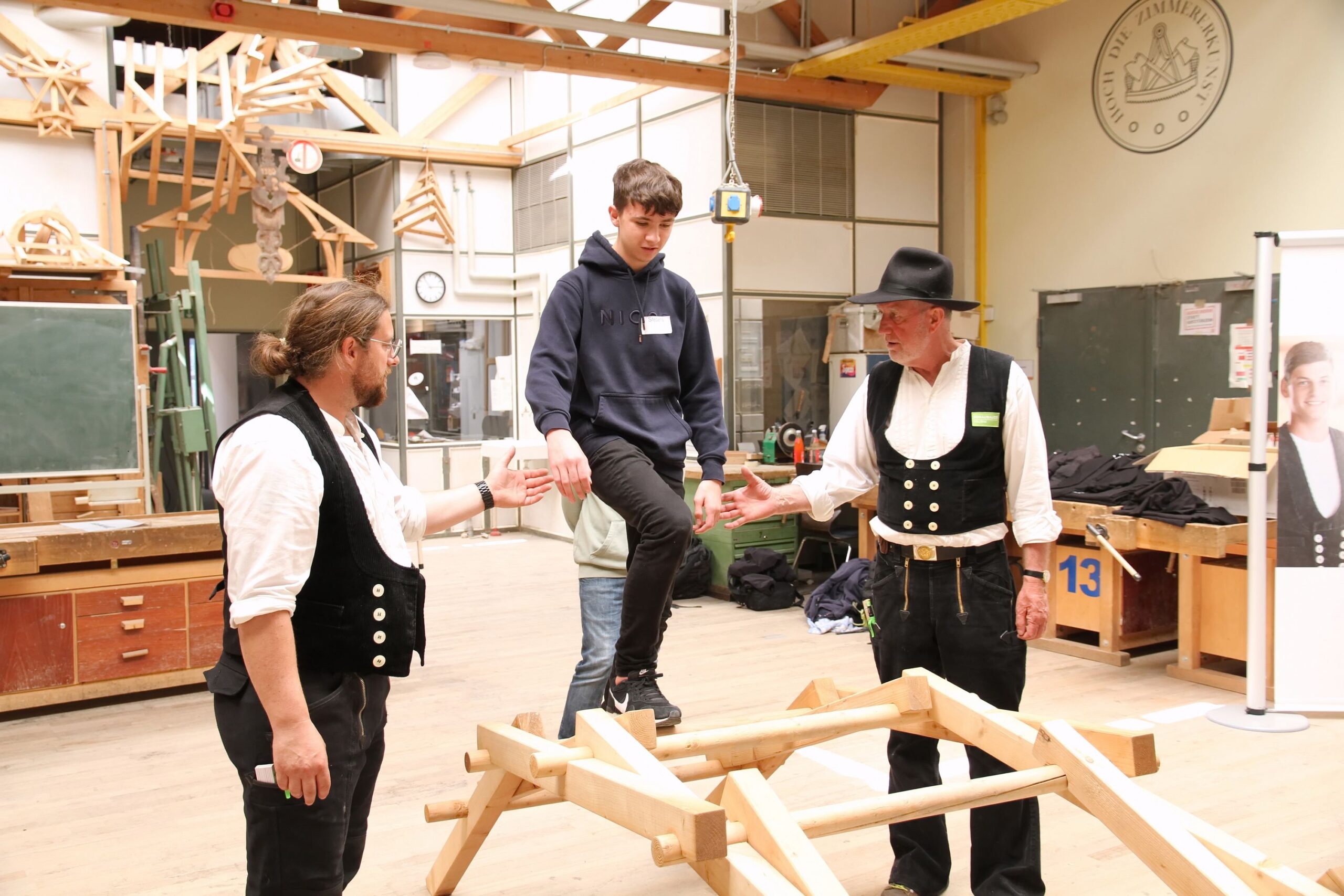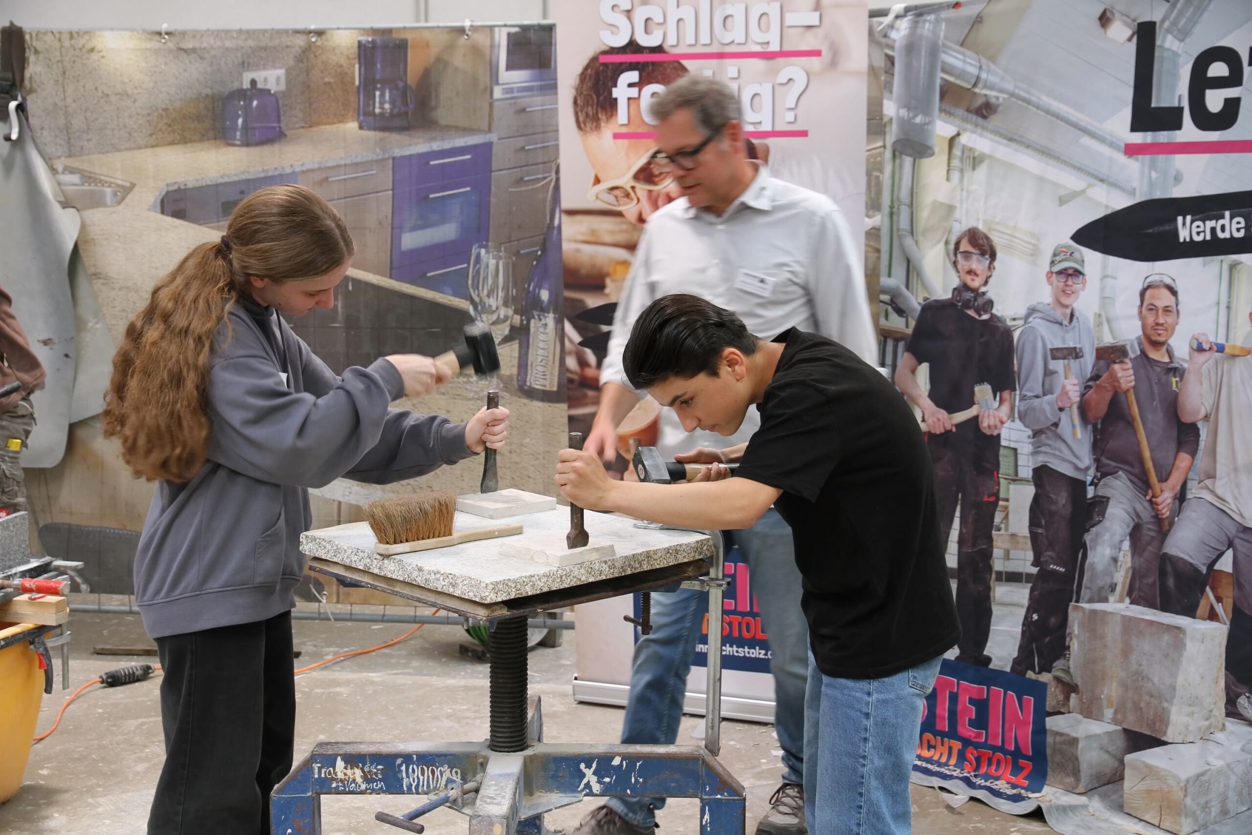 Bei den Steinmetzen entstanden individuelle Teelichthalter aus Stein, während es bei den Zimmerern sprichwörtlich „hoch hinaus“ ging – auf einem Übungsdach befestigten die Jugendlichen Leisten und hängten Dachziegel ein. Wer mutig war, konnte sogar mit einem Kran über den Werkstätten schweben und dabei Schrauben in Dachbalken eindrehen.