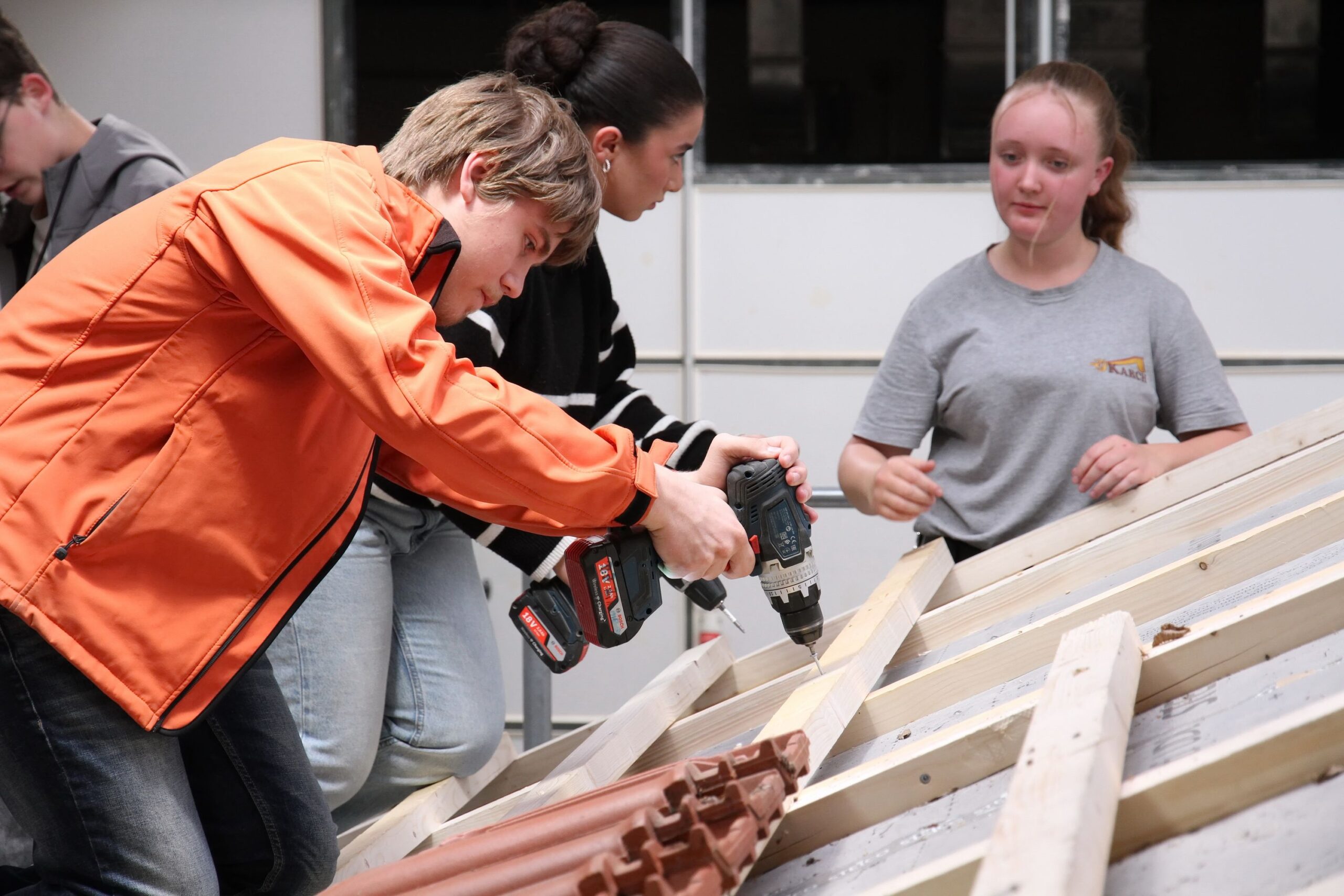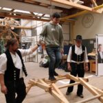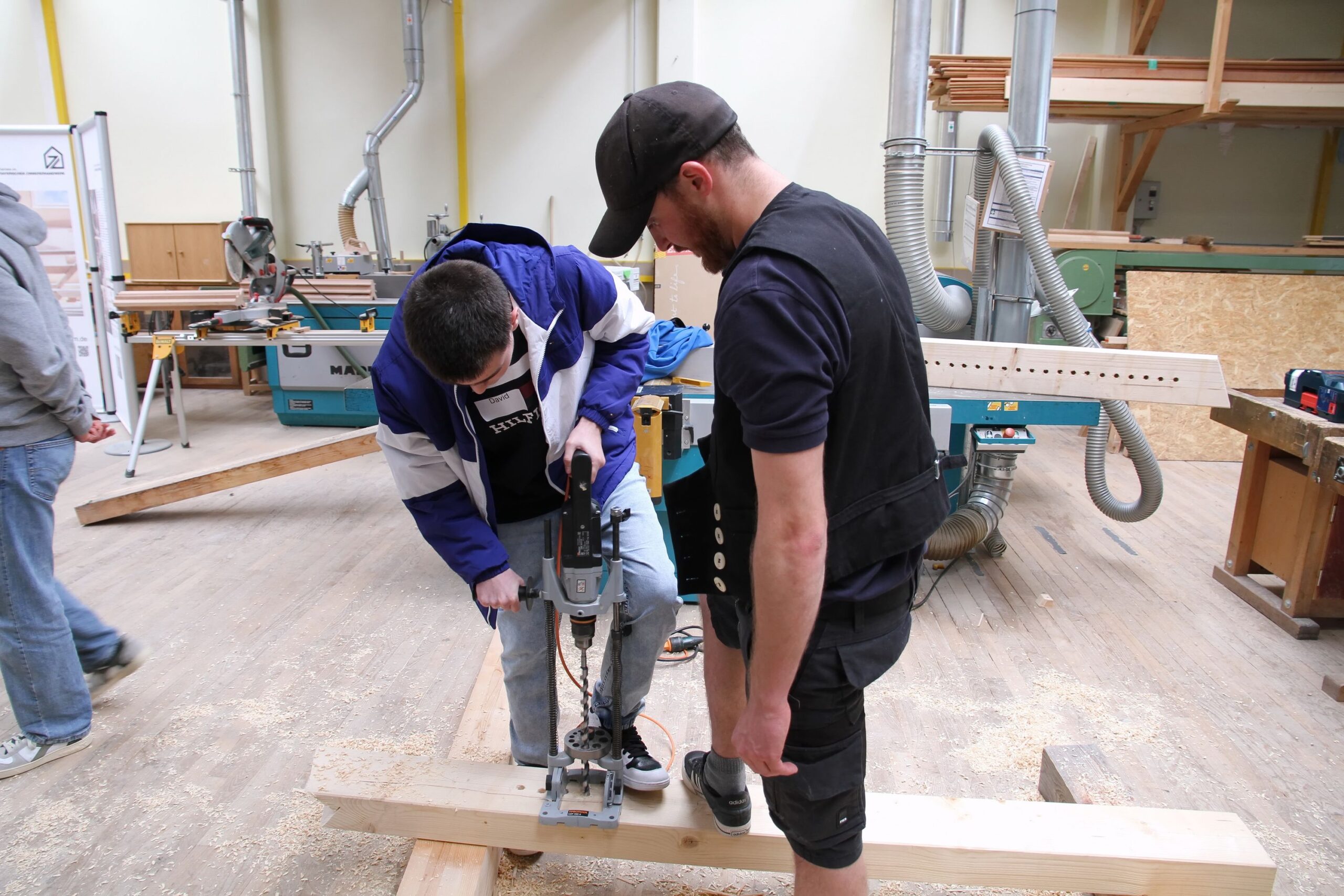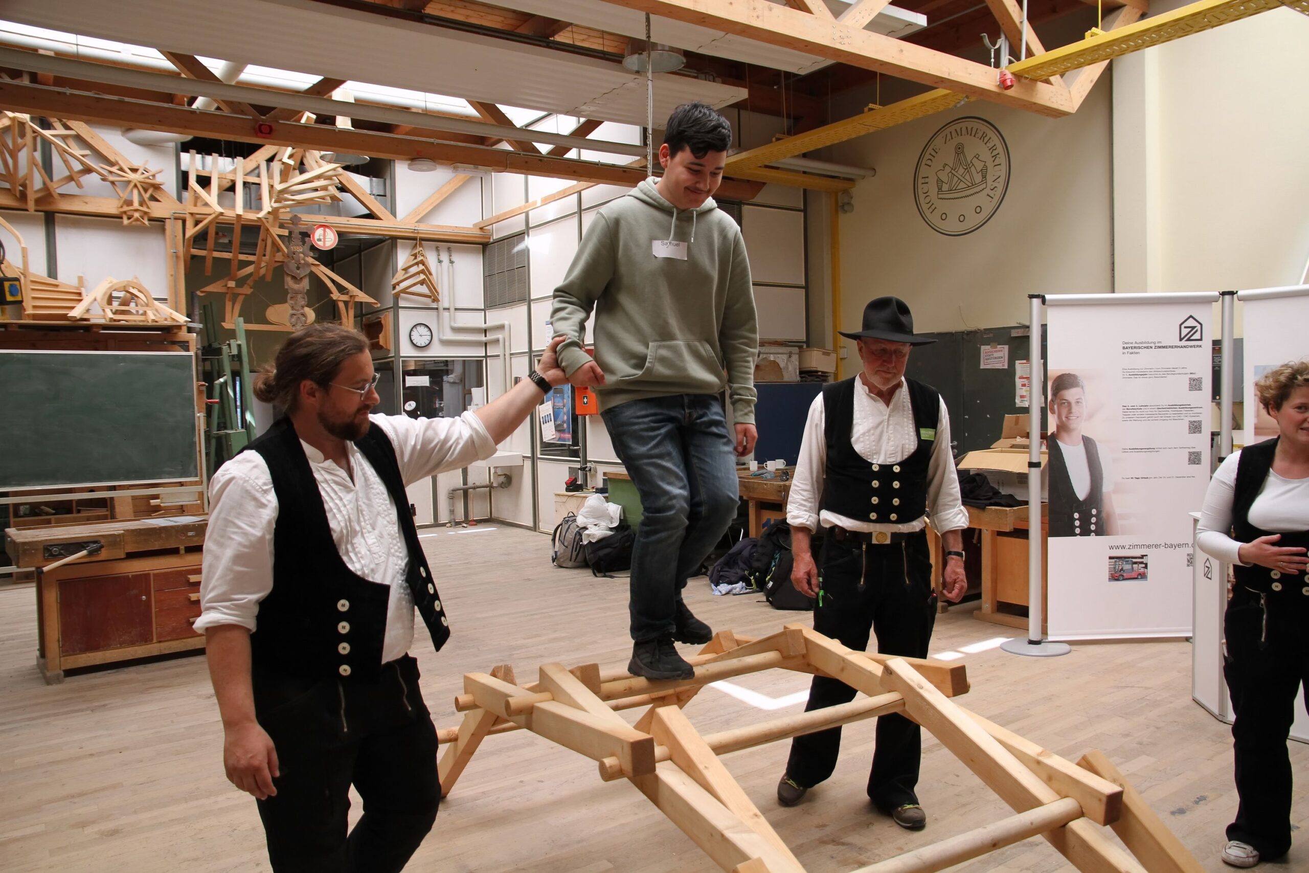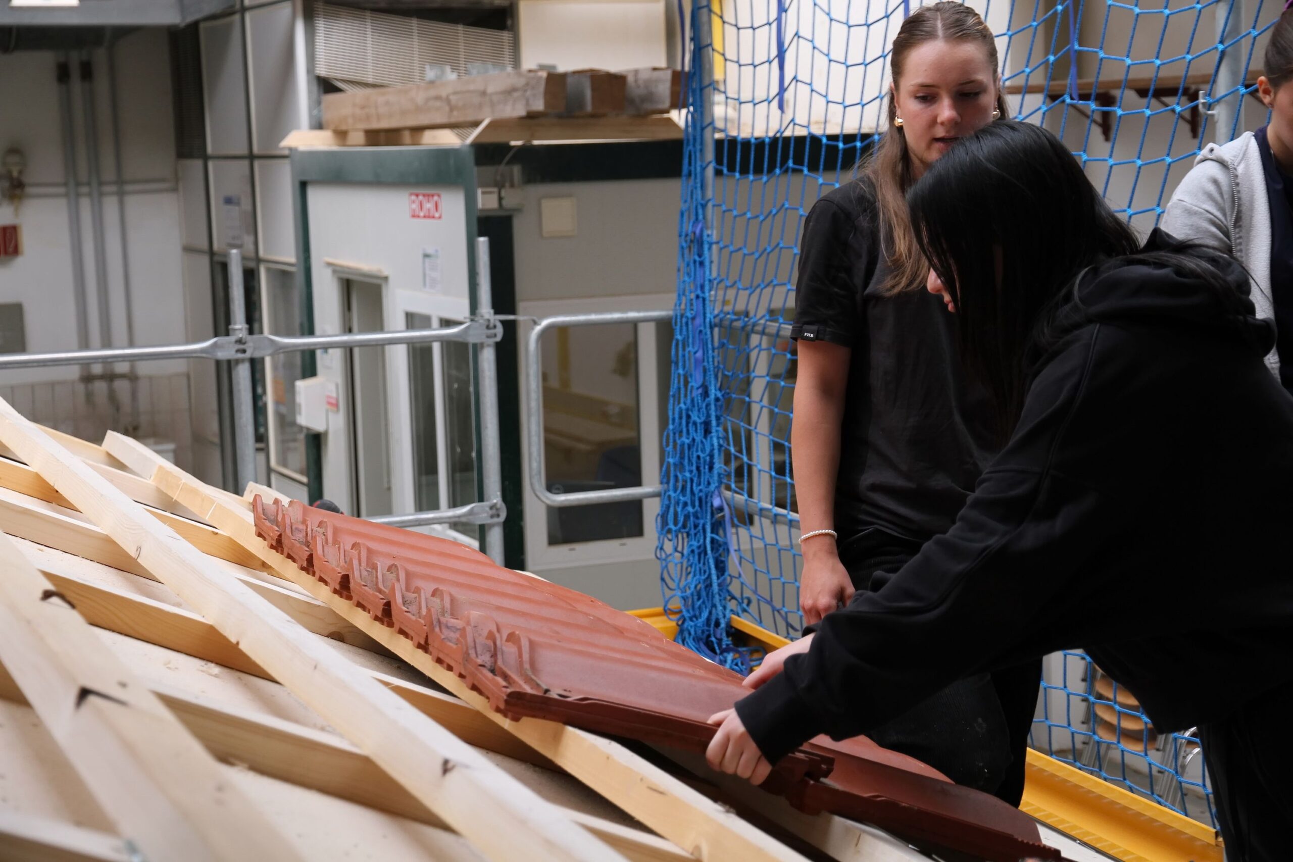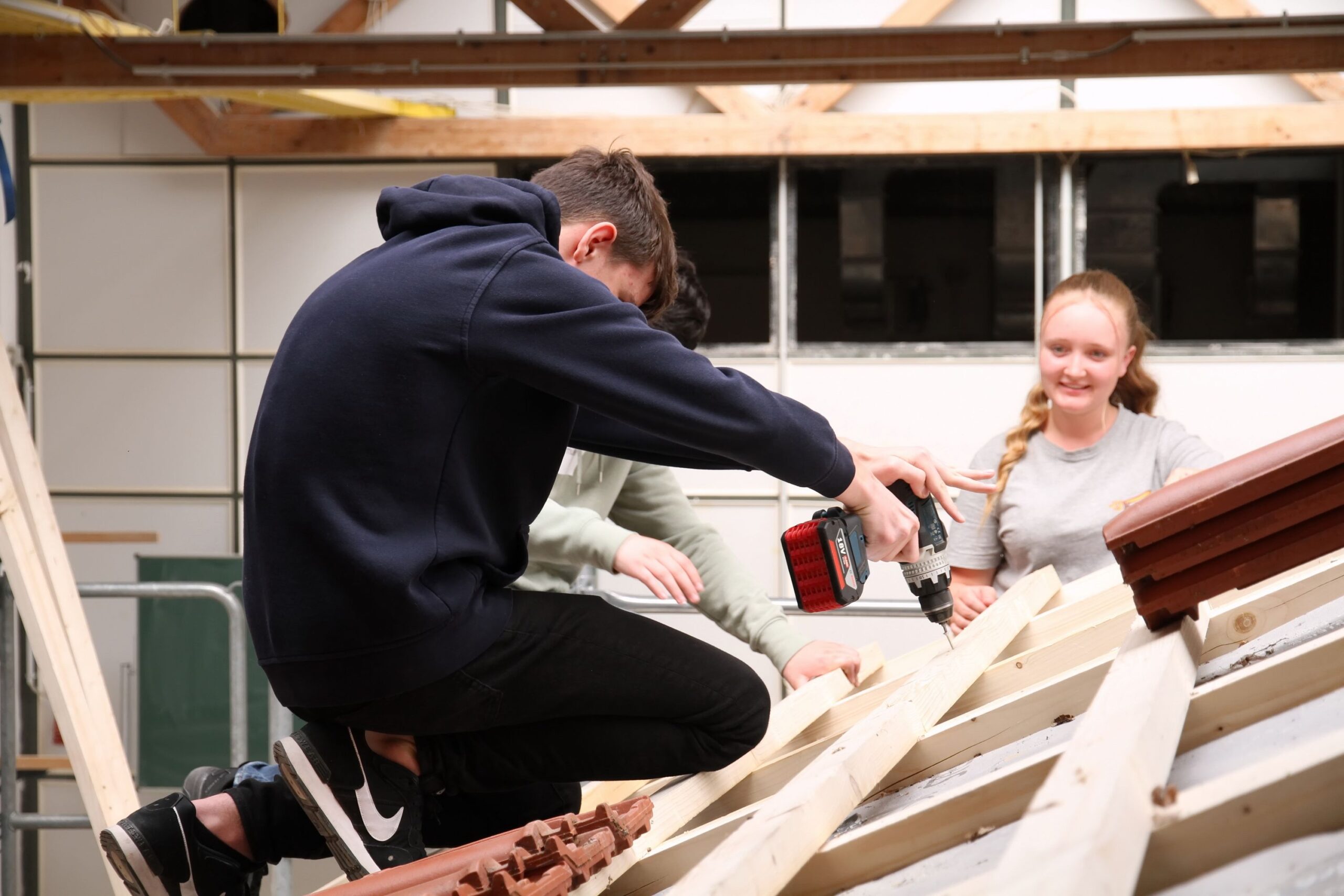 Bei den Steinmetzen entstanden individuelle Teelichthalter aus Stein, während es bei den Zimmerern sprichwörtlich „hoch hinaus“ ging – auf einem Übungsdach befestigten die Jugendlichen Leisten und hängten Dachziegel ein. Wer mutig war, konnte sogar mit einem Kran über den Werkstätten schweben und dabei Schrauben in Dachbalken eindrehen.