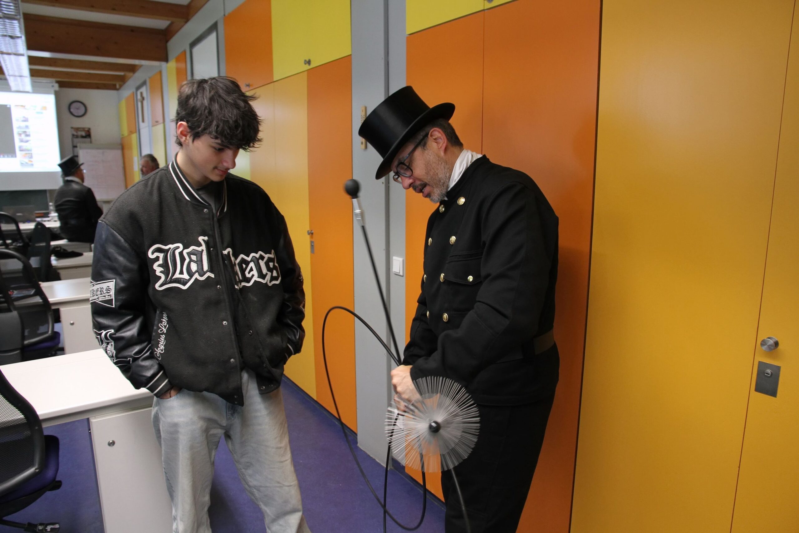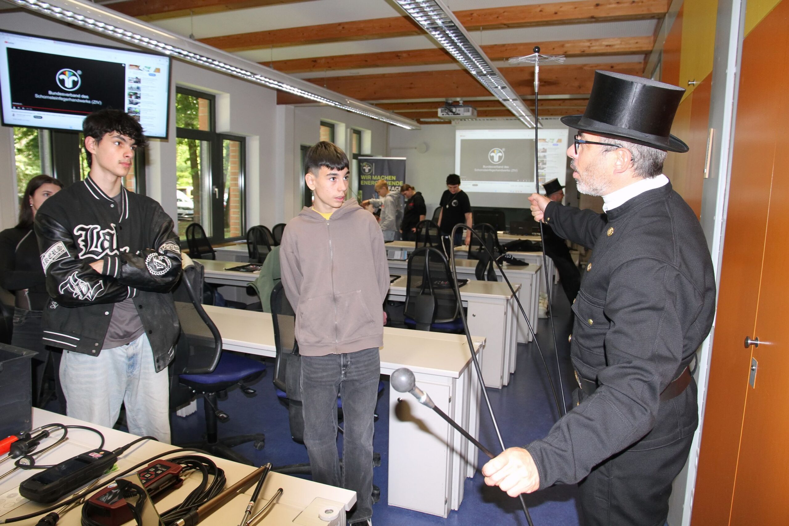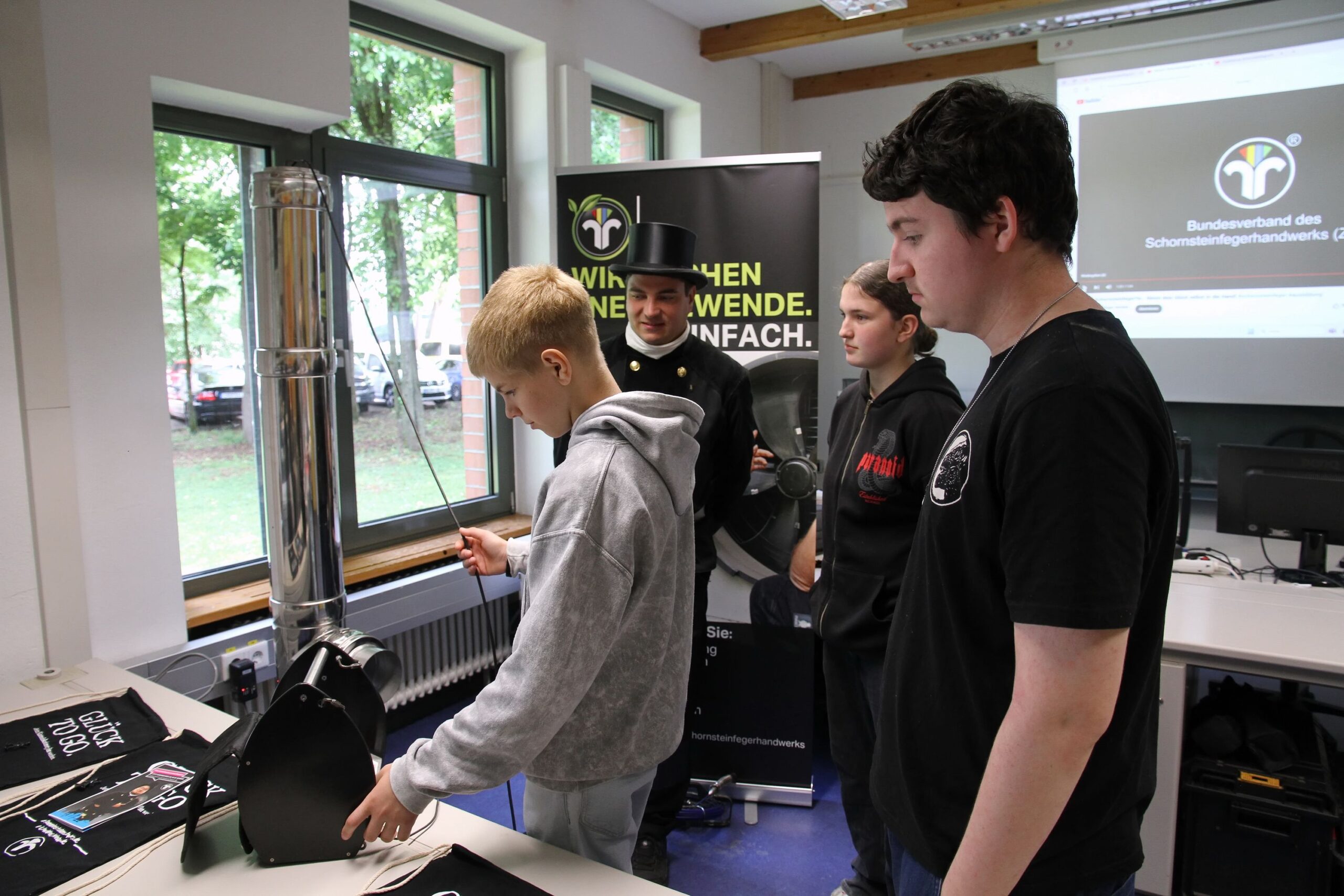 In der Werkstatt der Kfz-Innung wurden Autos auf Herz und Nieren geprüft. Die Kaminkehrer demonstrierten die Reinigung eines Kamins und informierten über die Vielfältige Arbeit ihrer Zunft. Bei den Metzgern ging es – aus Hygienegründen virtuell mit der VR-Brille – um die Herstellung von Leberkäs.