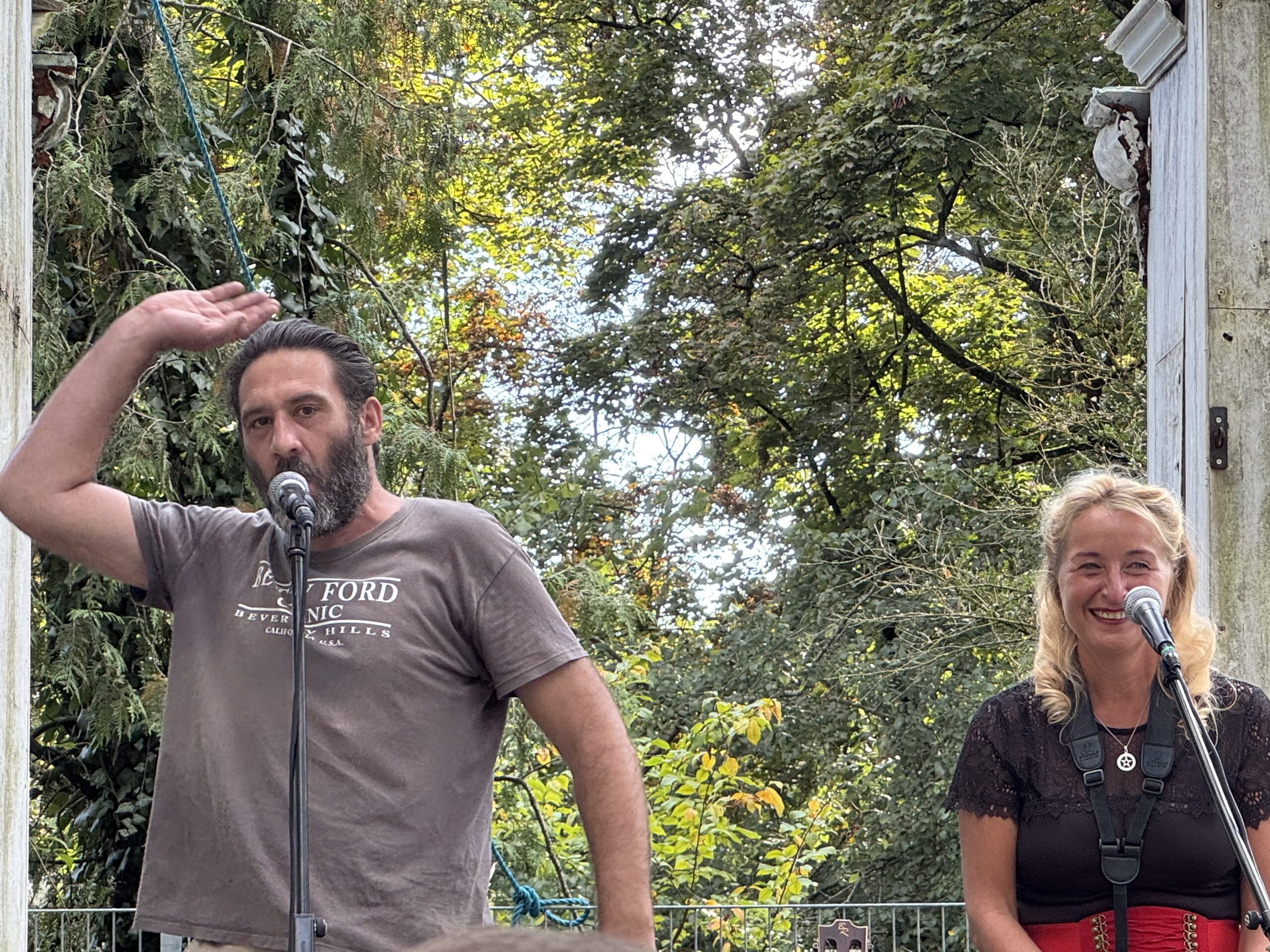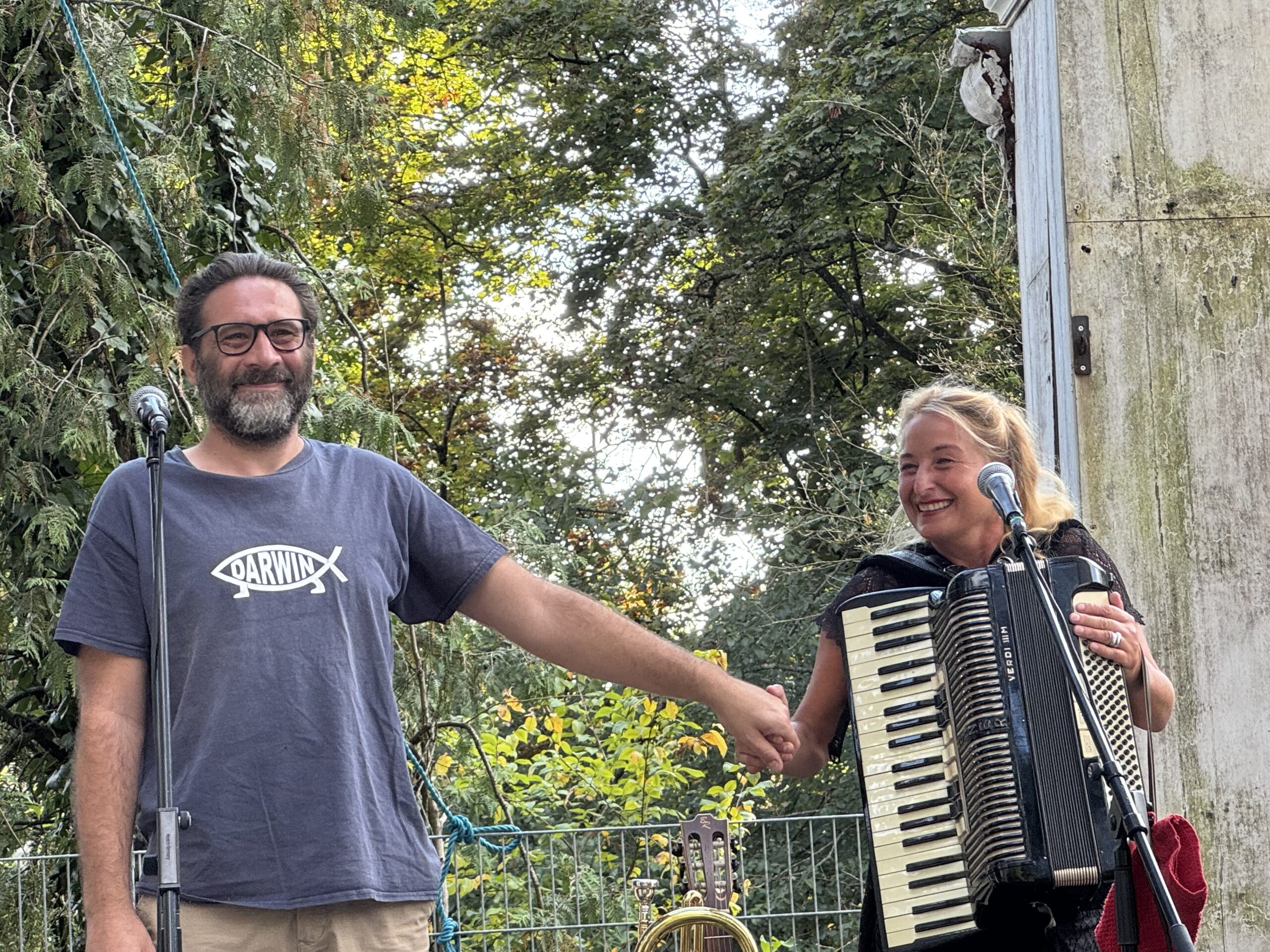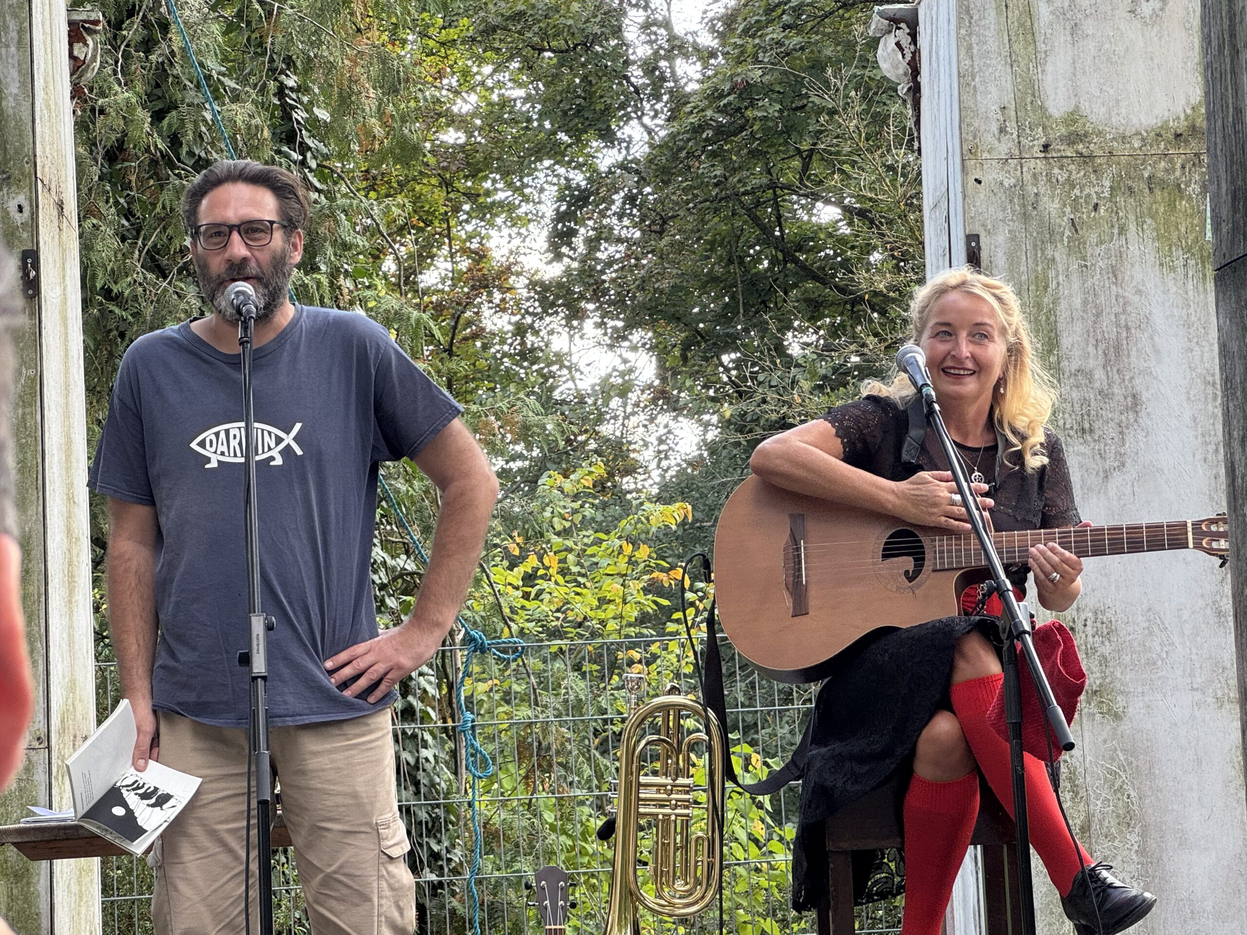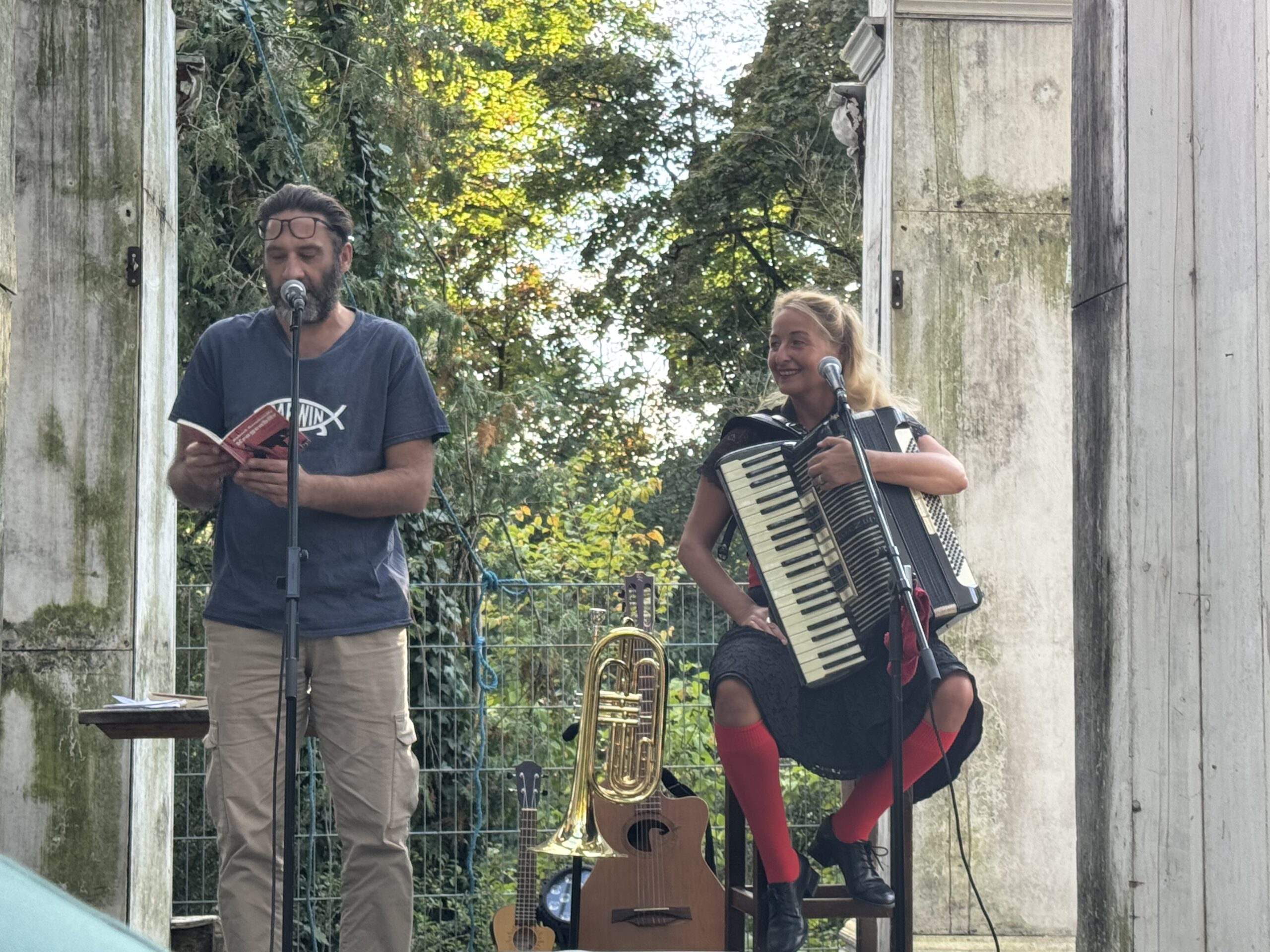 Jens nahm das Publikum mit auf eine Reise durch zahlreiche skurrile Erlebnisse seines künstlerischen Werdegangs und sorgte damit für große Erheiterung. Teresa berichtete von den Abenteuern ihres „Phoenix“ und beeindruckte die Anwesenden mit ihrem erstaunlichen Talent, eine Vielzahl von Musikinstrumenten zu beherrschen.