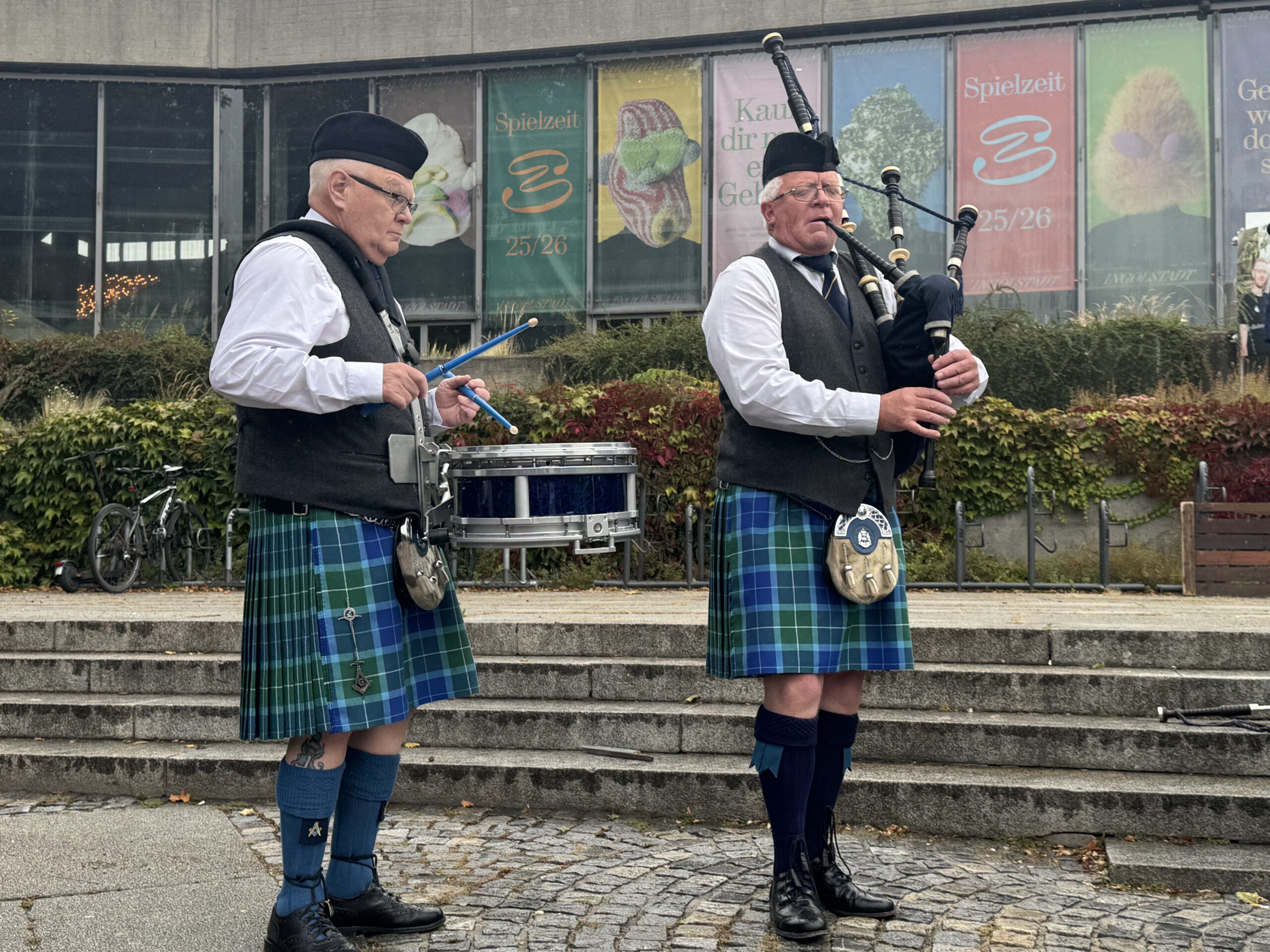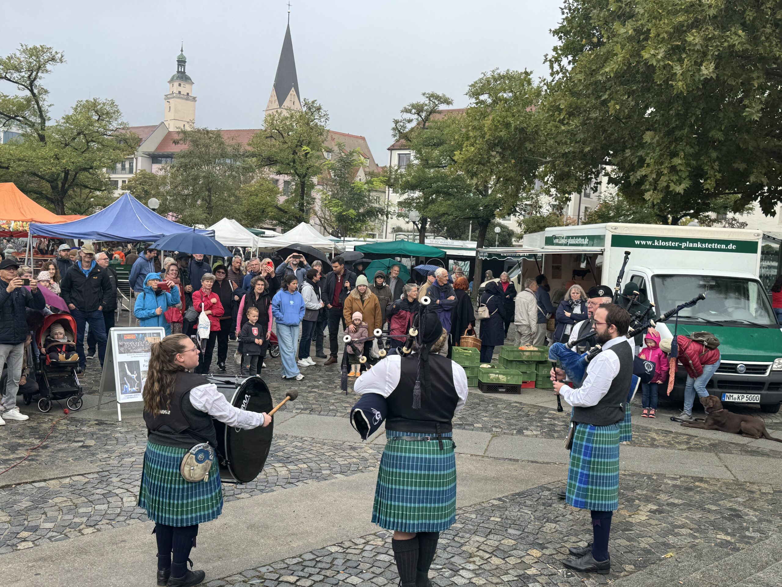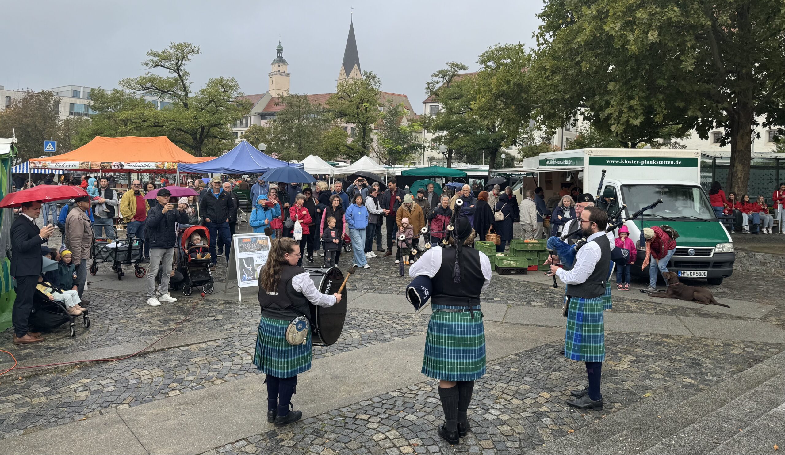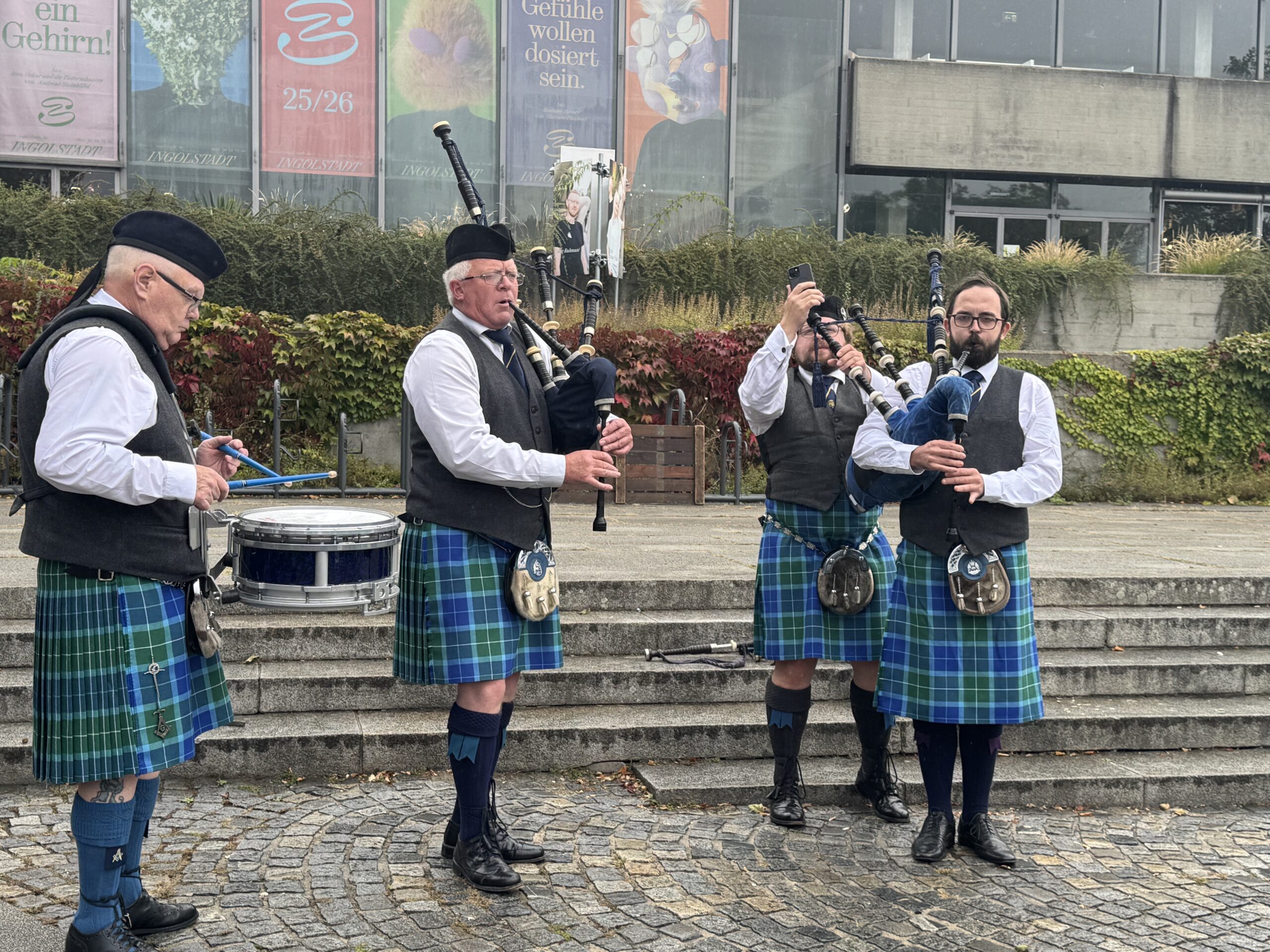 Anlässlich des 50. Volksfestes in Ingolstadt, trafen auch einige Partnerstädte der Stadt ein, um mitzufeiern. Zur großen Freude der Wochenmarktbesucher fanden sich die Blaskapelle „Prekmurska Godba Bakovci“  aus Murska Sobota und Dudelsackspieler aus Kirkcaldy vor dem Stadttheater ein, um die Menschen mit ihren musikalischen Darbietungen zu erfreuen. Viele Wochenmarktbesucher ließen es sich nicht nehmen, trotz des Nieselregens diese gelungene Überraschung zu feiern. (HaGa)