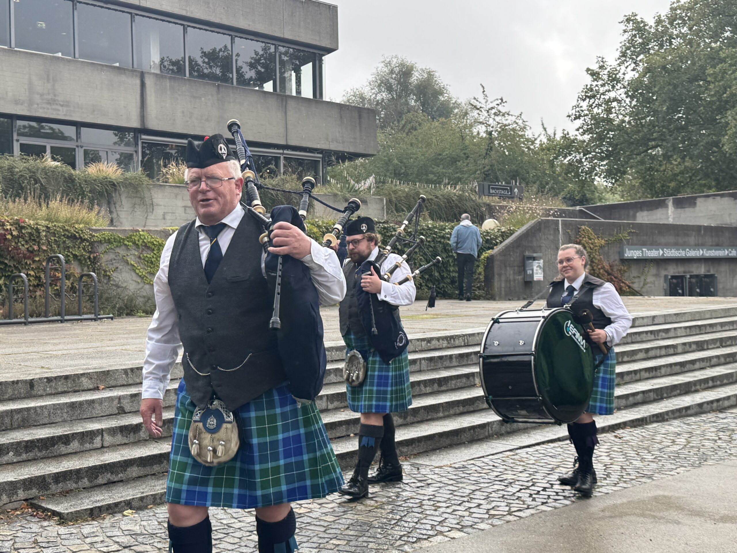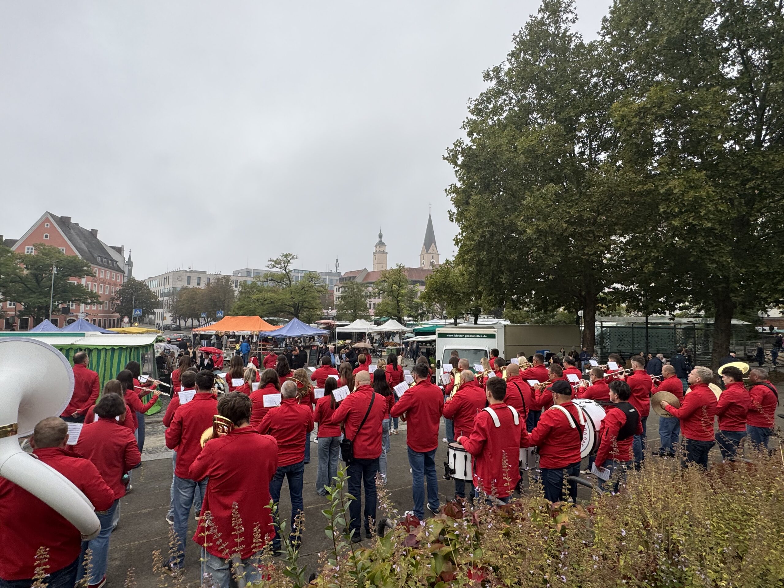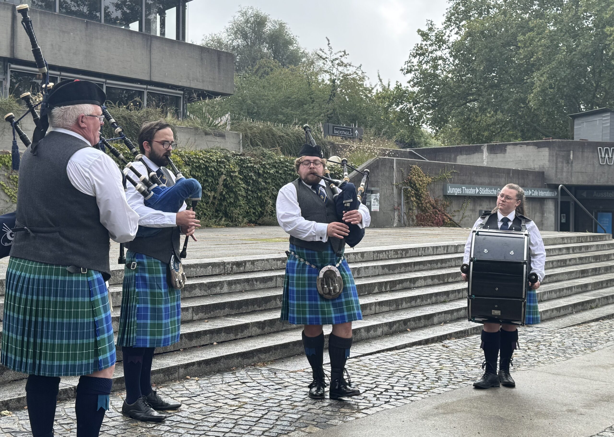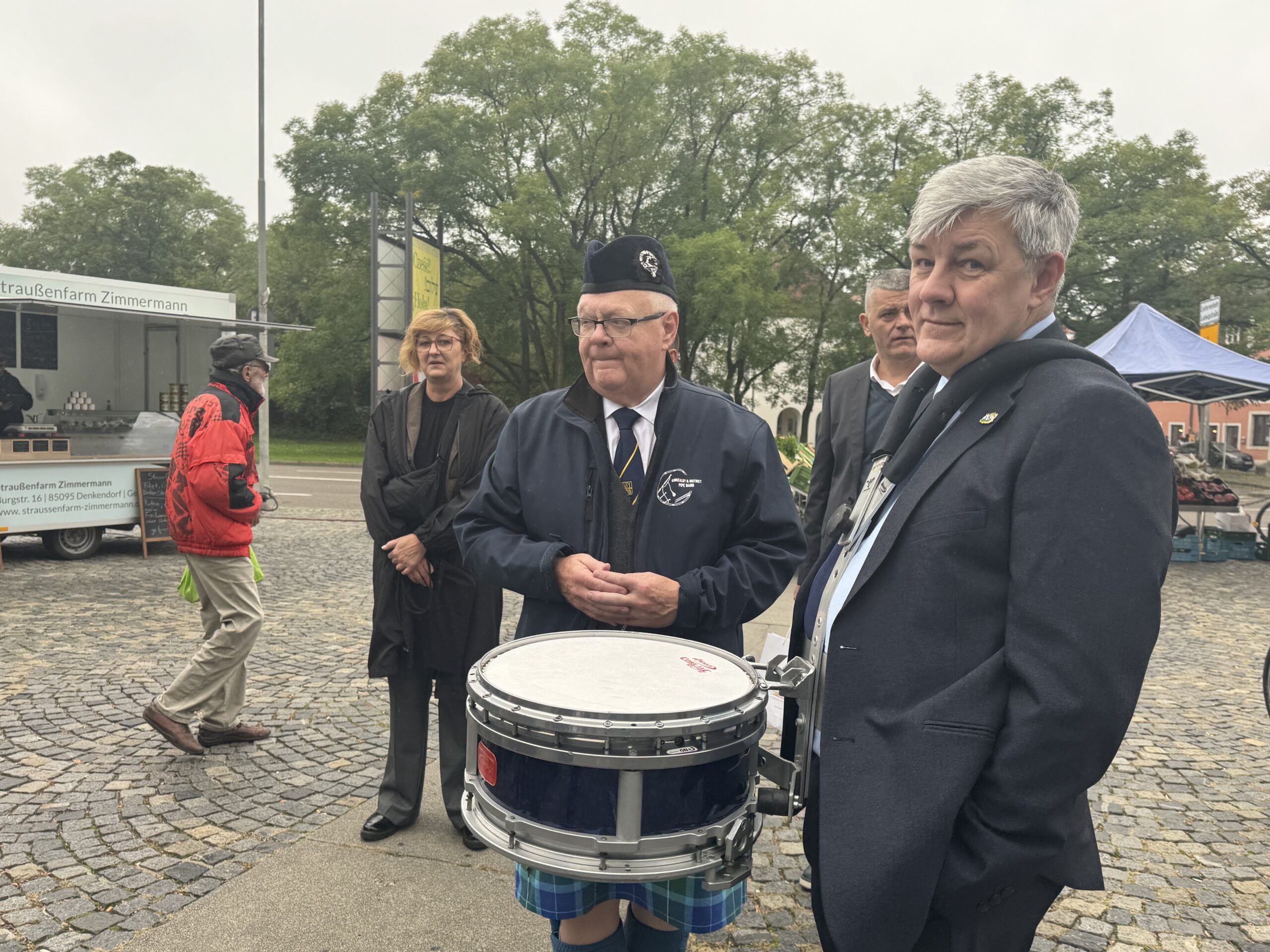 Anlässlich des 50. Volksfestes in Ingolstadt, trafen auch einige Partnerstädte der Stadt ein, um mitzufeiern. Zur großen Freude der Wochenmarktbesucher fanden sich die Blaskapelle „Prekmurska Godba Bakovci“  aus Murska Sobota und Dudelsackspieler aus Kirkcaldy vor dem Stadttheater ein, um die Menschen mit ihren musikalischen Darbietungen zu erfreuen. Viele Wochenmarktbesucher ließen es sich nicht nehmen, trotz des Nieselregens diese gelungene Überraschung zu feiern. (HaGa)