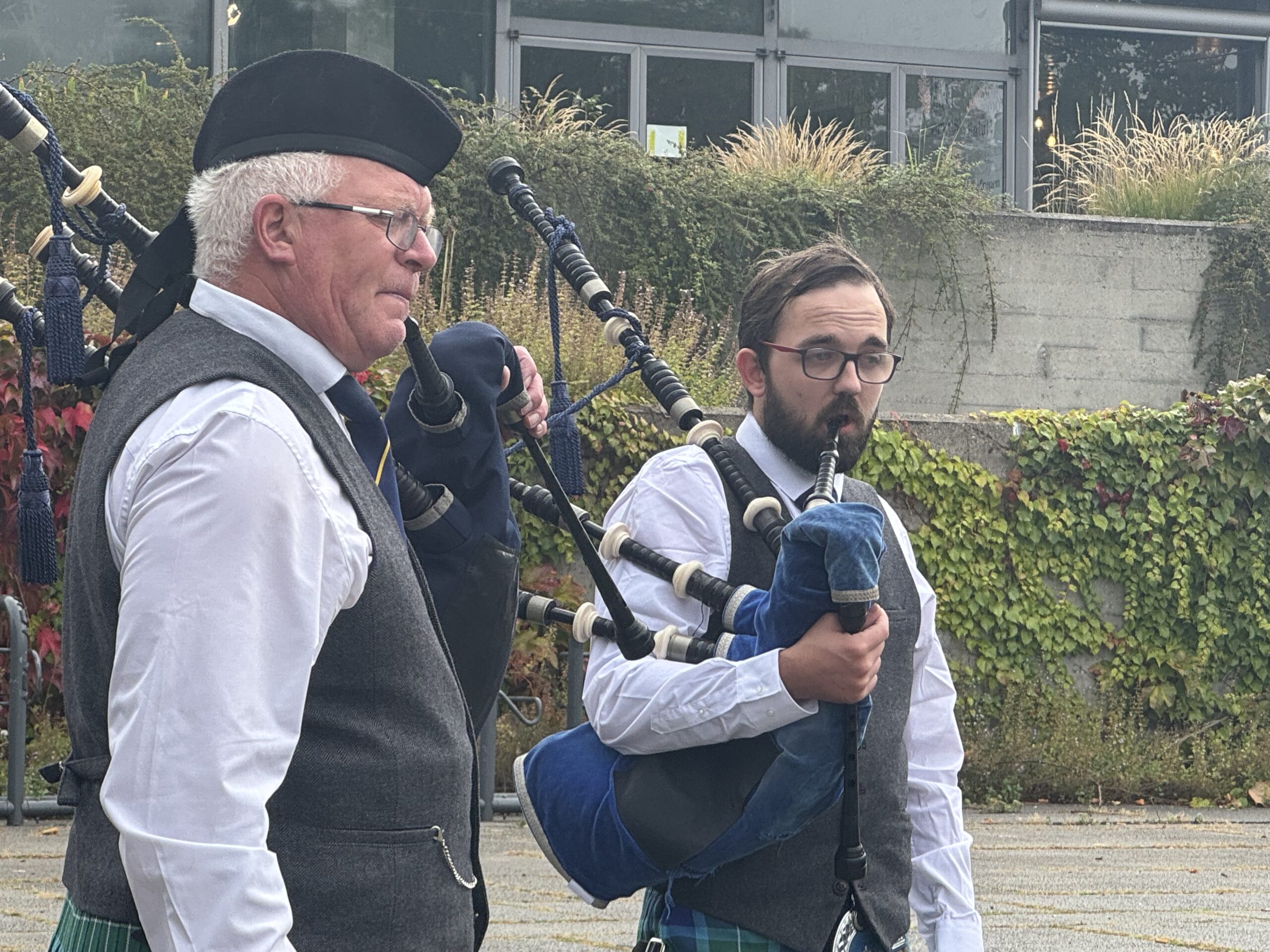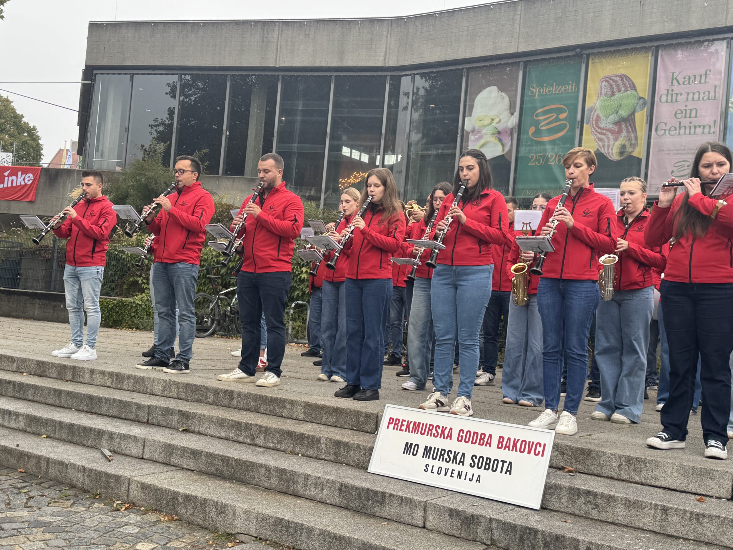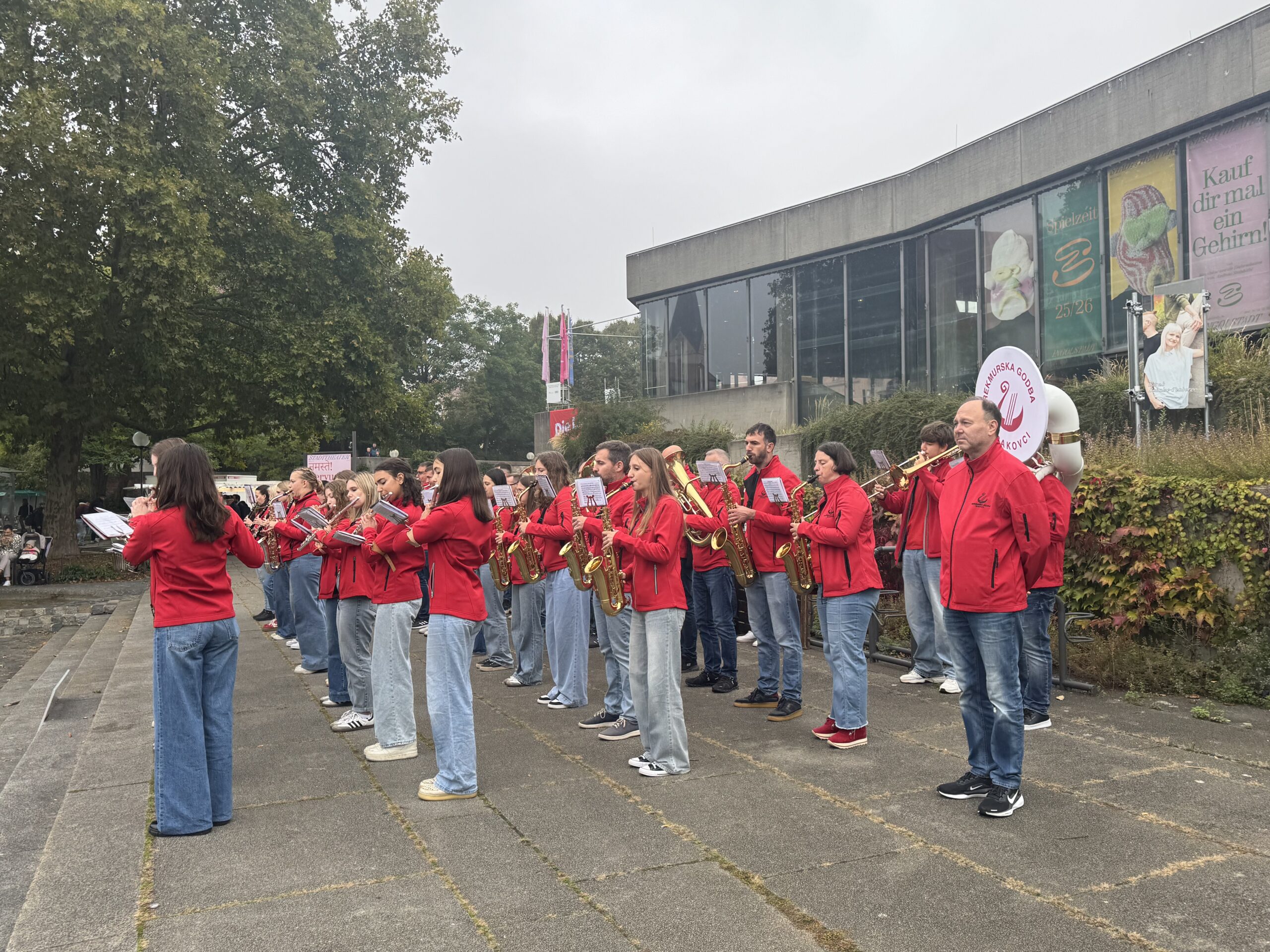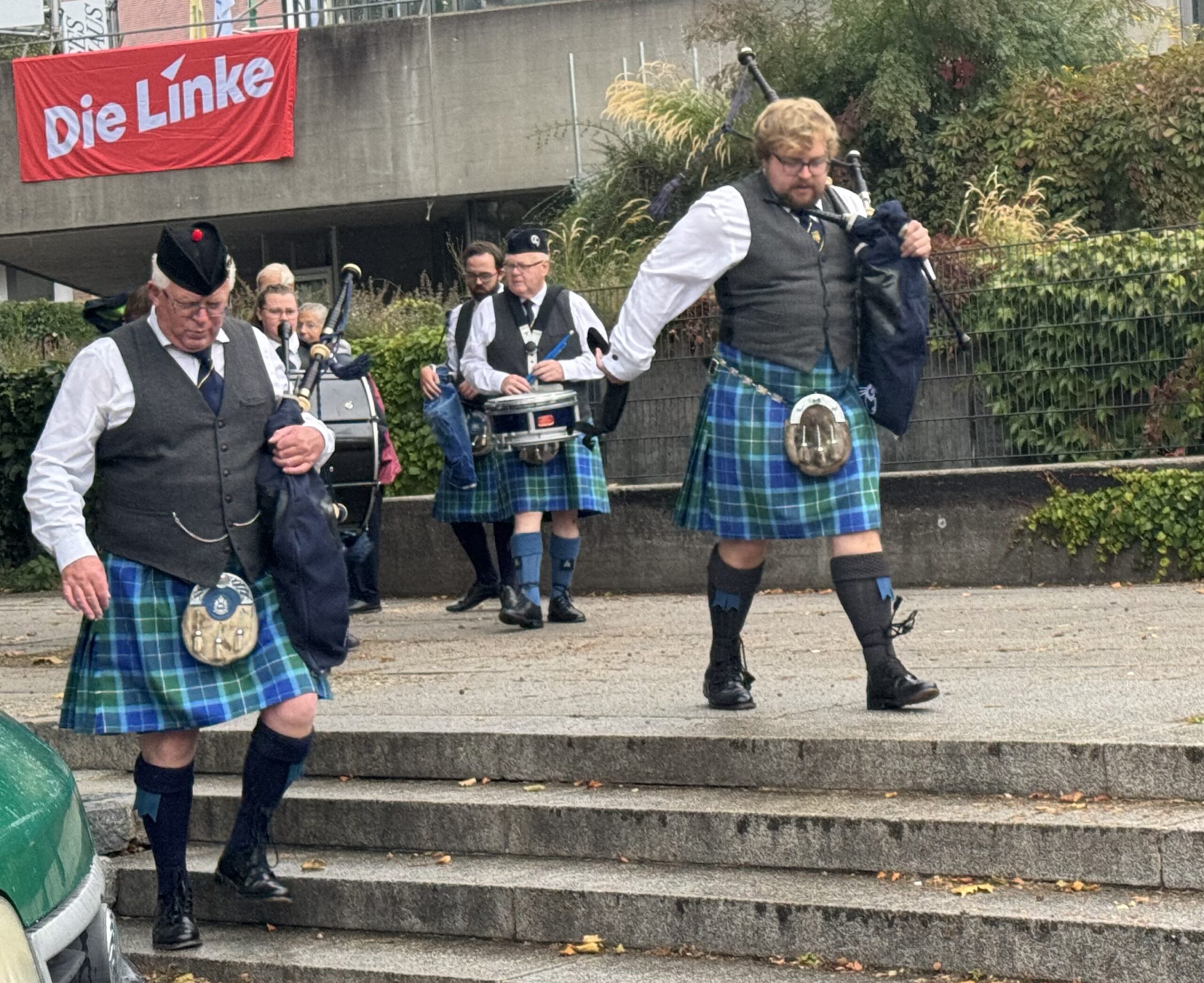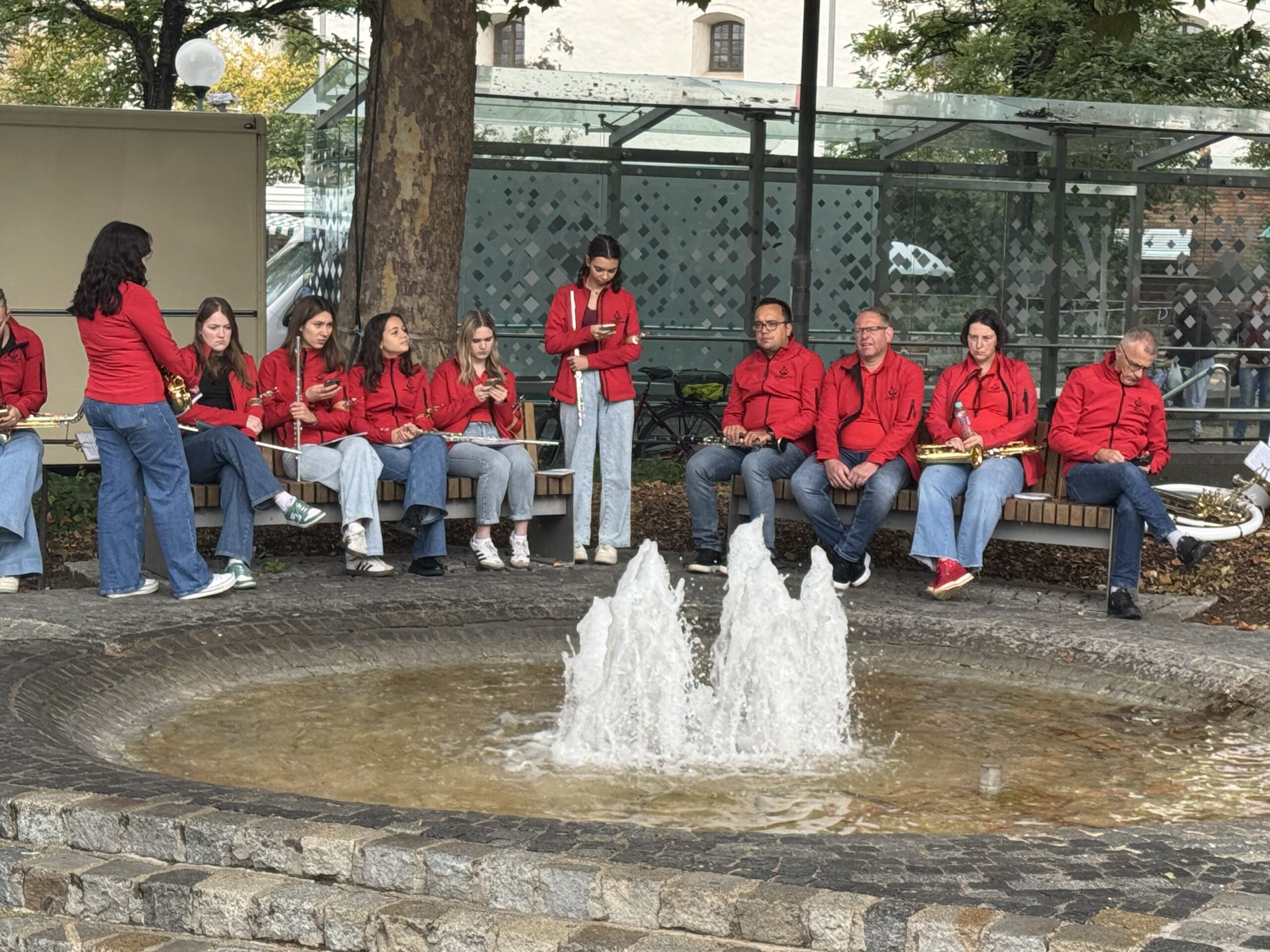 Anlässlich des 50. Volksfestes in Ingolstadt, trafen auch einige Partnerstädte der Stadt ein, um mitzufeiern. Zur großen Freude der Wochenmarktbesucher fanden sich die Blaskapelle „Prekmurska Godba Bakovci“  aus Murska Sobota und Dudelsackspieler aus Kirkcaldy vor dem Stadttheater ein, um die Menschen mit ihren musikalischen Darbietungen zu erfreuen. Viele Wochenmarktbesucher ließen es sich nicht nehmen, trotz des Nieselregens diese gelungene Überraschung zu feiern. (HaGa)