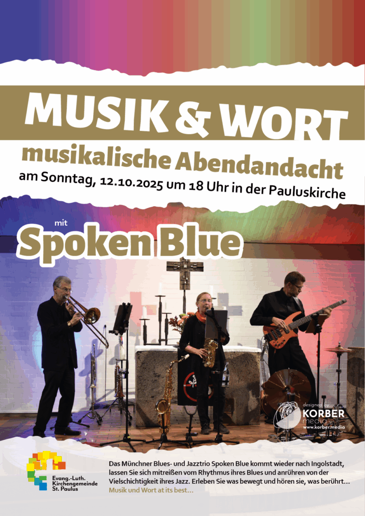 Am 12. Oktober um 18 Uhr gestaltet die Münchner Jazz- und Bluesband „spokenblue“ das Gottesdienstformat „Musik und Wort“ in der Pauluskirche Ingolstadt. Das Trio, bestehend aus Wolfgang und Sigrun Eber sowie Robert Macketanz, wird wieder die Kirche rocken, bezaubern oder zum Träumen bringen – wie sie das in den letzten Jahren immer wieder getan haben.