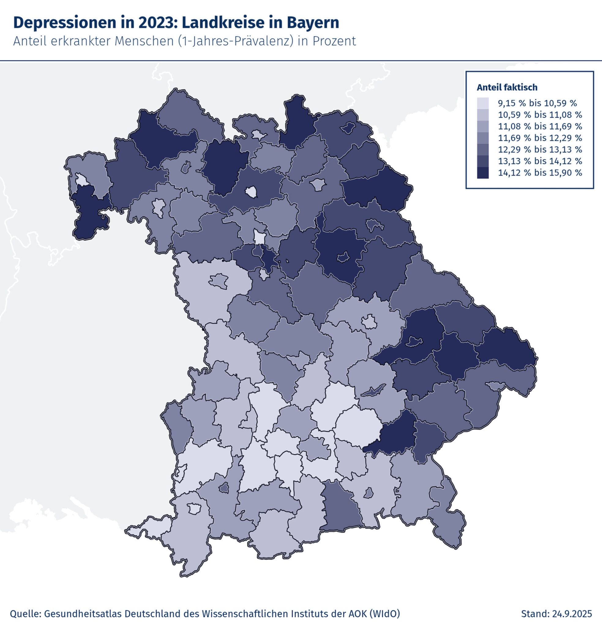 In der Stadt Ingolstadt litten 11,23 Prozent der Bevölkerung im Jahr 2023 an Depressionen. Dies zeigt eine aktuelle Auswertung des Wissenschaftlichen Instituts der AOK (WIdO) anlässlich des Welttages der seelischen Gesundheit am 10. Oktober. Zum Vergleich: Laut dem Gesundheitsatlas Deutschland sind in Bayern 11,97 Prozent der Bevölkerung an Depressionen erkrankt, bundesweit sind es mit 12,12 Prozent etwas mehr. „Auffällig sind die großen Unterschiede innerhalb Bayerns: So lag der Anteil der Betroffenen zwischen 15,9 Prozent in Kronach und 9,2 Prozent in Erlangen“, so Ulrich Resch, Direktor bei der AOK in Ingolstadt. In den vergangenen Jahren ist das gesellschaftliche Bewusstsein für mentale Gesundheit gestiegen. „Viele Menschen, die aktuell in einem Tief stecken, scheuen sich jedoch noch immer, Hilfe zu suchen. Wir setzen uns daher dafür ein, den Betroffenen mit leicht zugänglichen und innovativen Angeboten zur Seite zu stehen“, betont Ulrich Resch und ergänzt: „Ob Prüfungsdruck im Studium, Stress in der Arbeit oder hohe Belastung bei der Pflege von Angehörigen – das Thema mentale Gesundheit nimmt die AOK sehr ernst.“