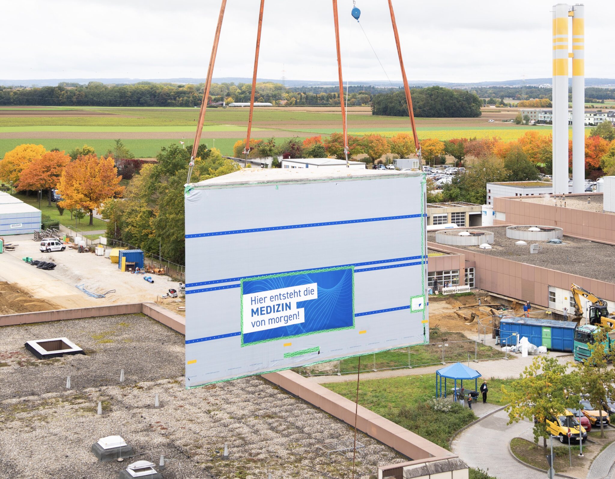 Im Rahmen der umfassenden Generalsanierung entstehen auf dem Dach des Klinikums aktuell zwei neue Stationen in Modulbauweise – eine auf der Ostseite über dem Haupteingang, eine weitere auf der Westseite über dem Bereich der Notaufnahme. Insgesamt werden 34 Module verbaut, die eine zusätzliche Nutzfläche von rund 1.200 Quadratmetern schaffen.