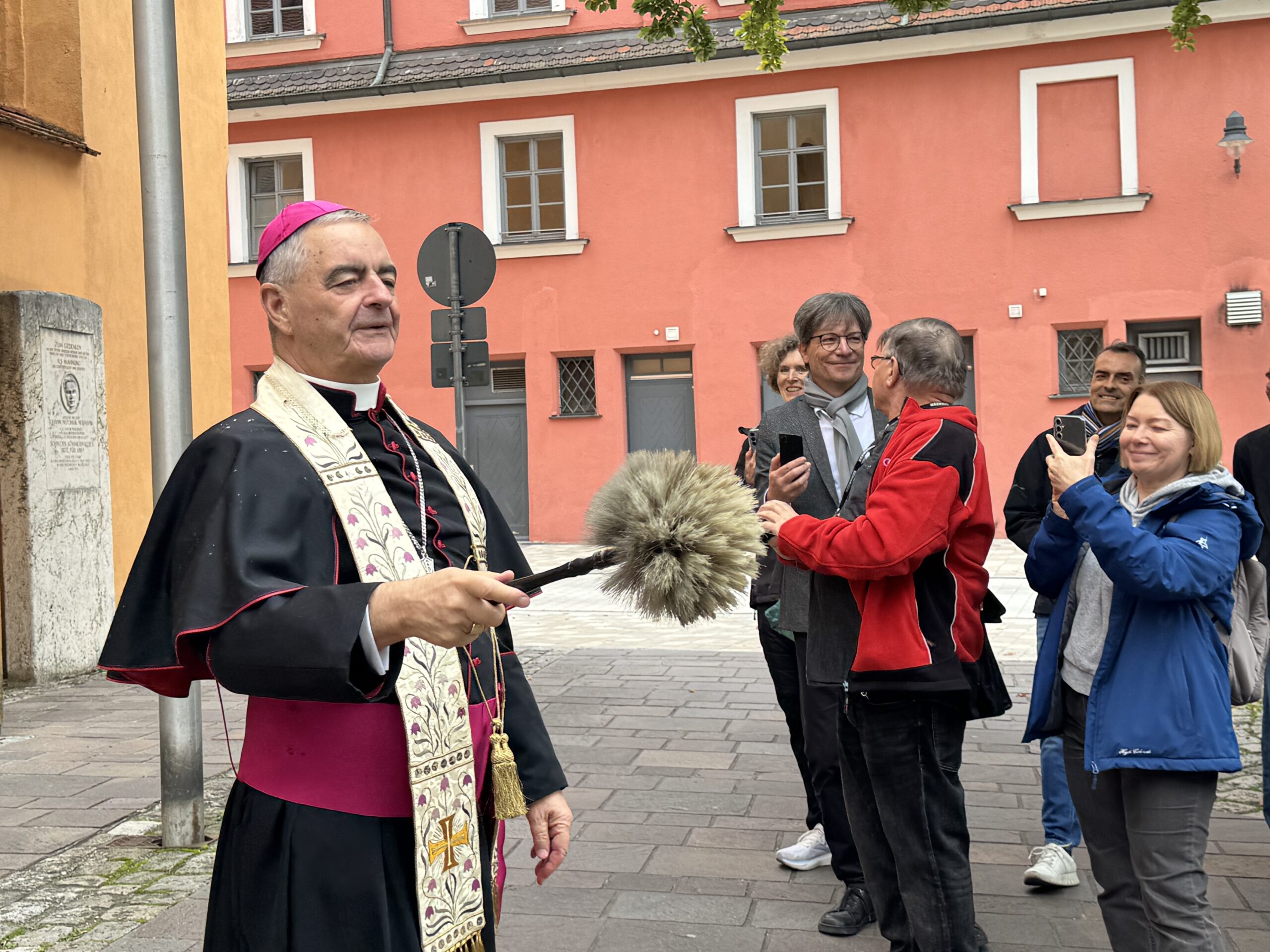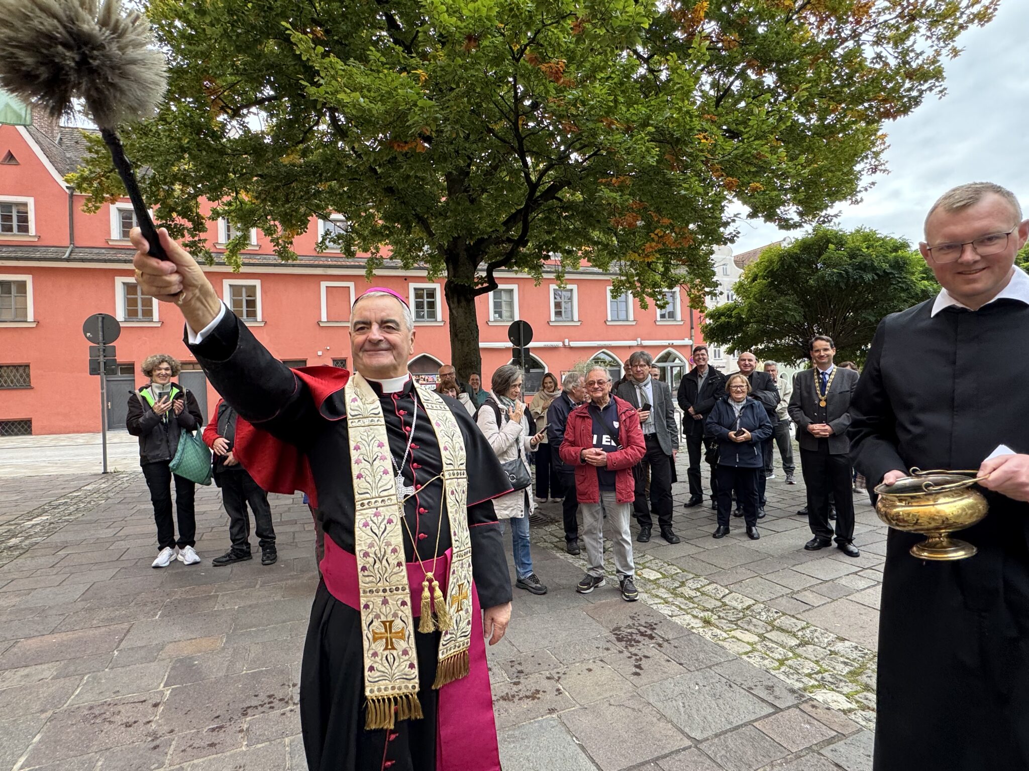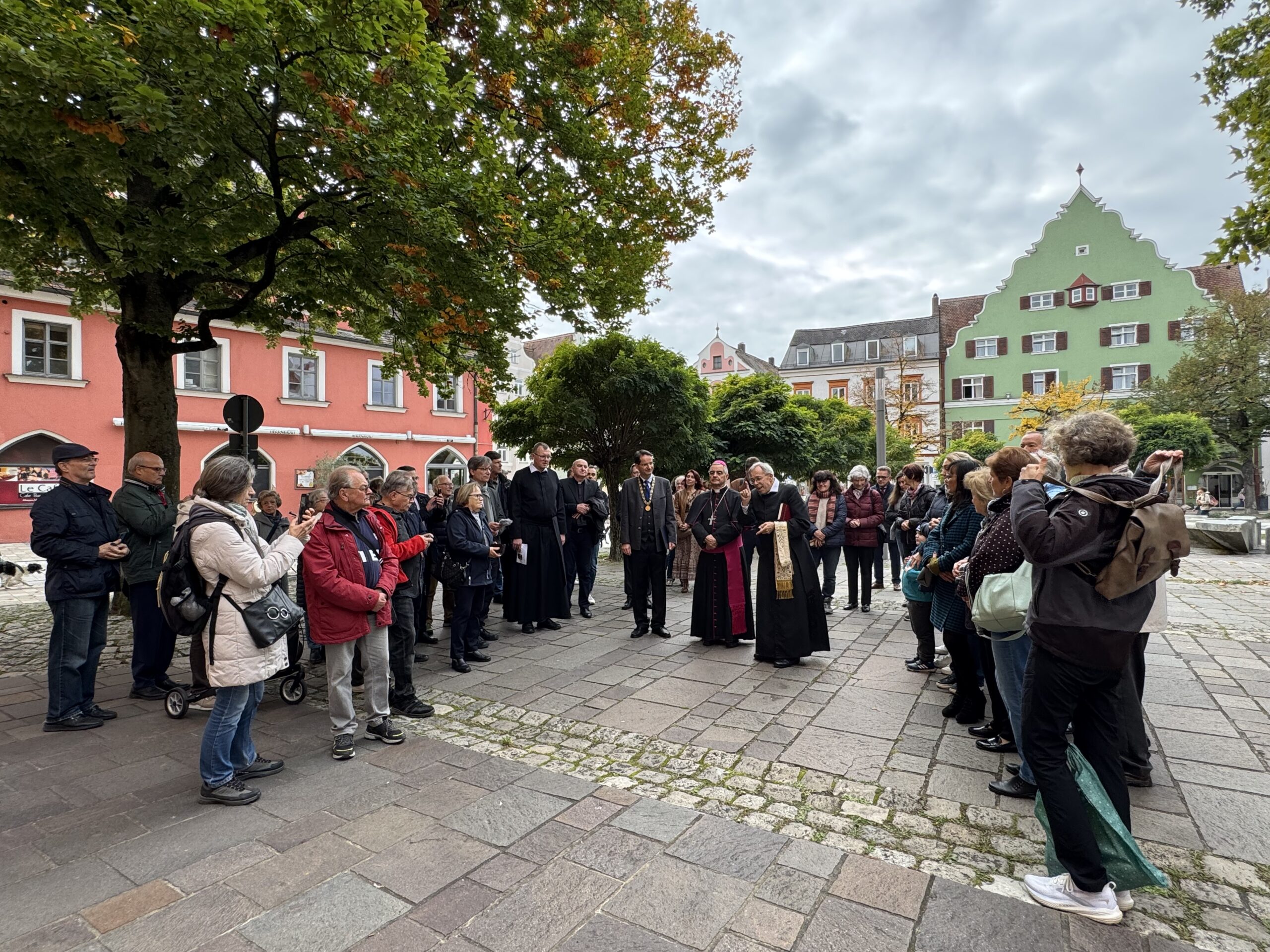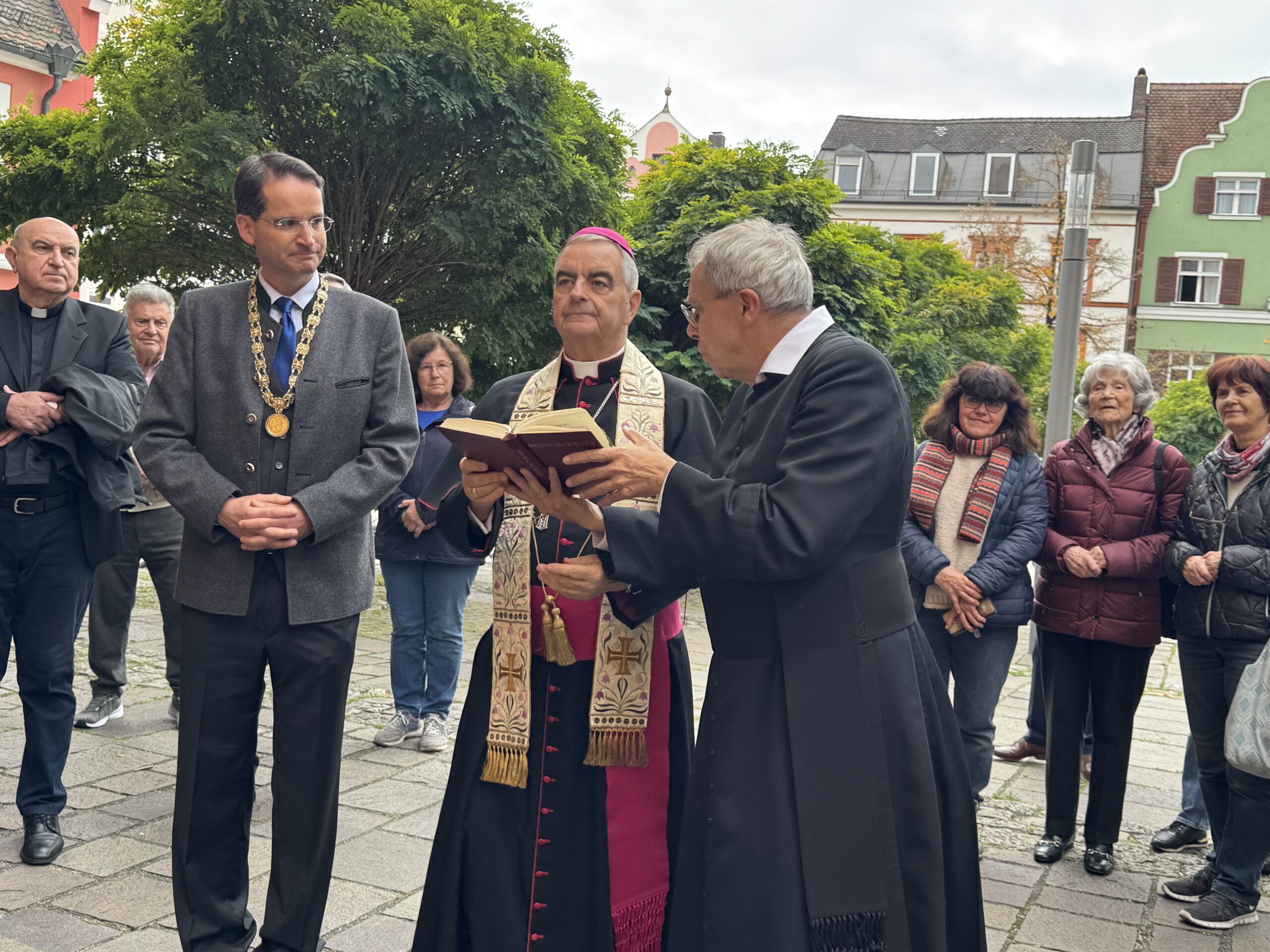 An der kurzen Zeremonie nahmen neben Pater Lorenz, Vizerektor der Franziskanerkirche, auch Oberbürgermeister Dr. Michael Kern, Dr. Matthias Schickel – einer der Hauptinitiatoren zur Rettung der Kirche – sowie zahlreiche Gläubige und Interessierte teil.