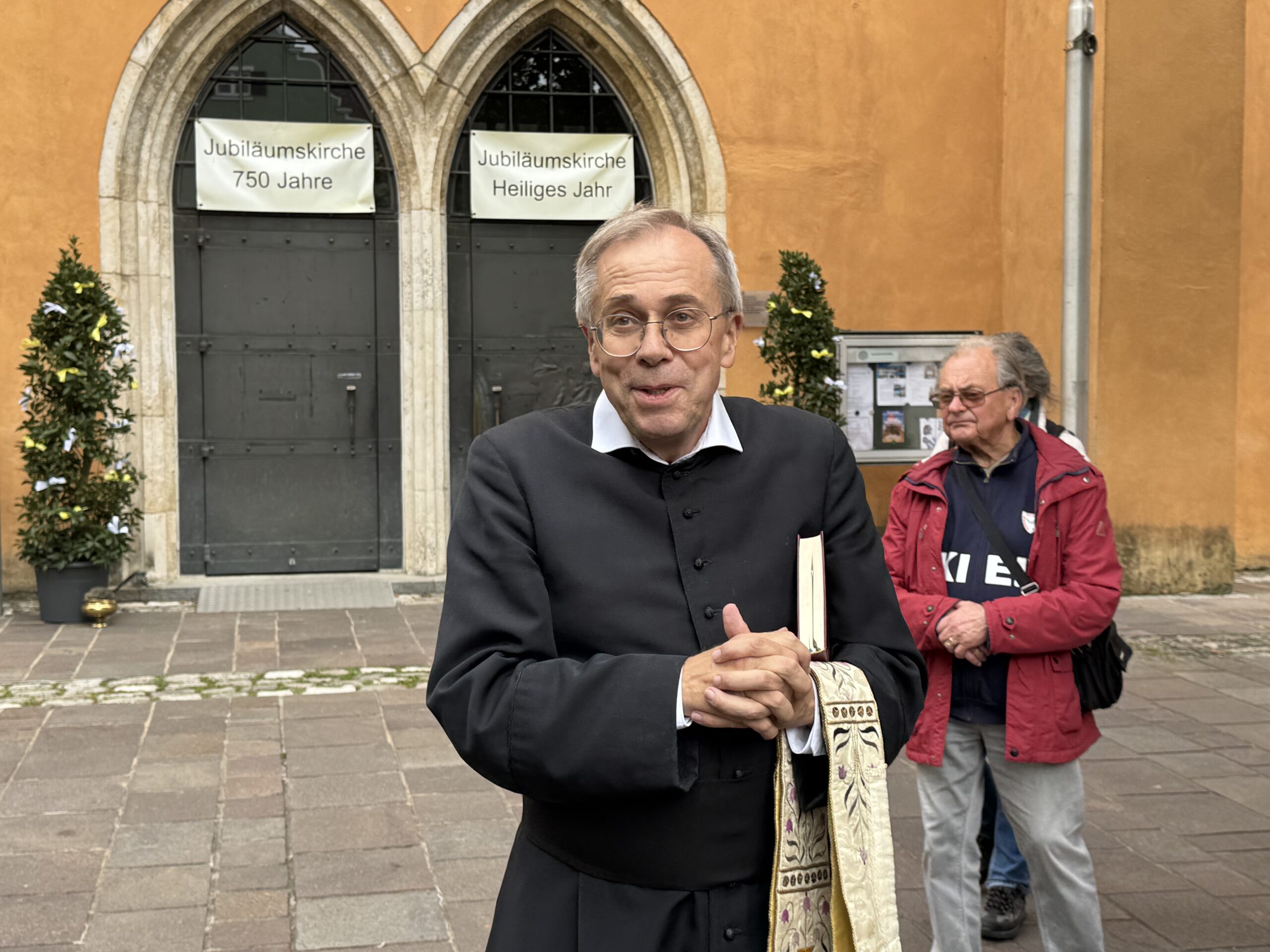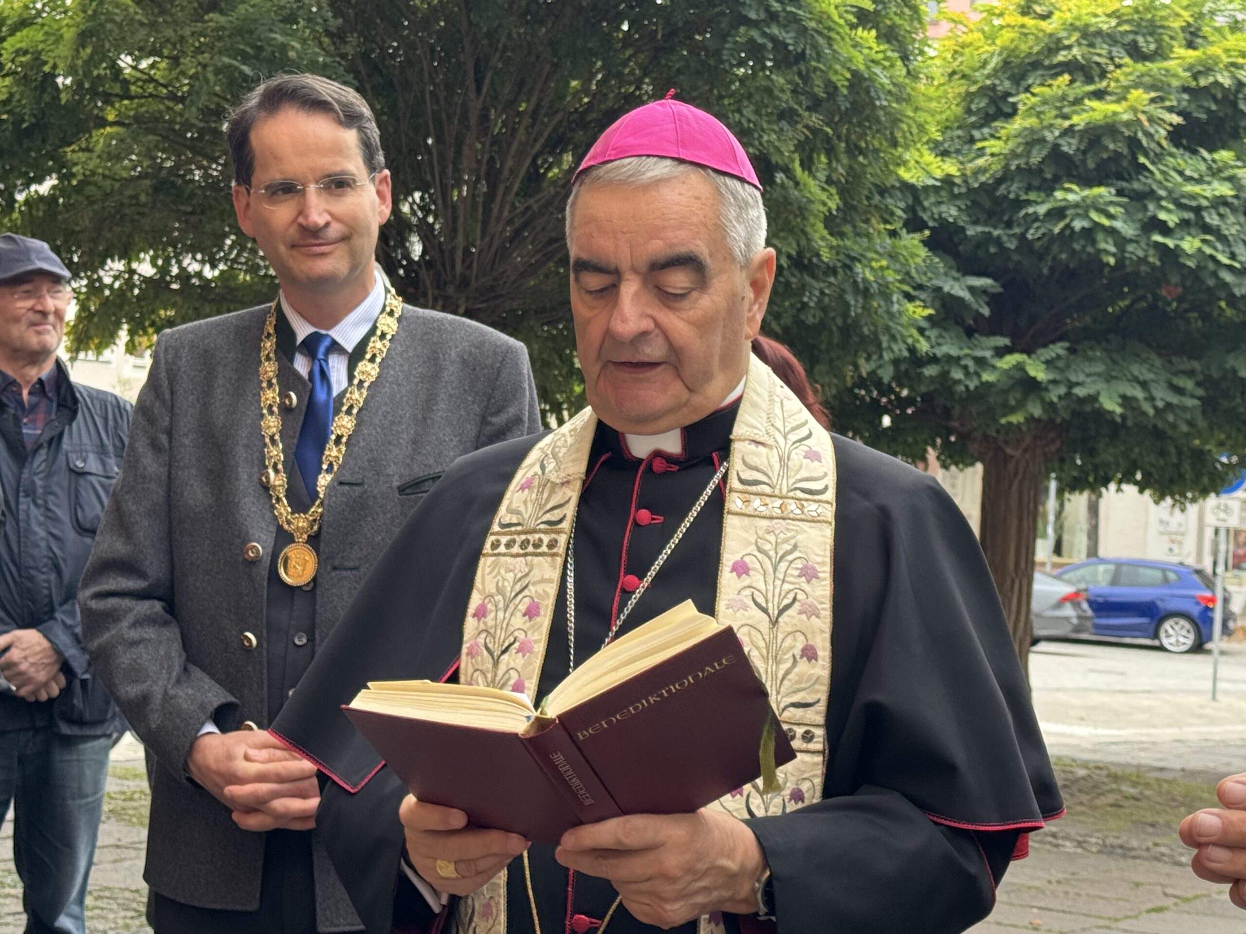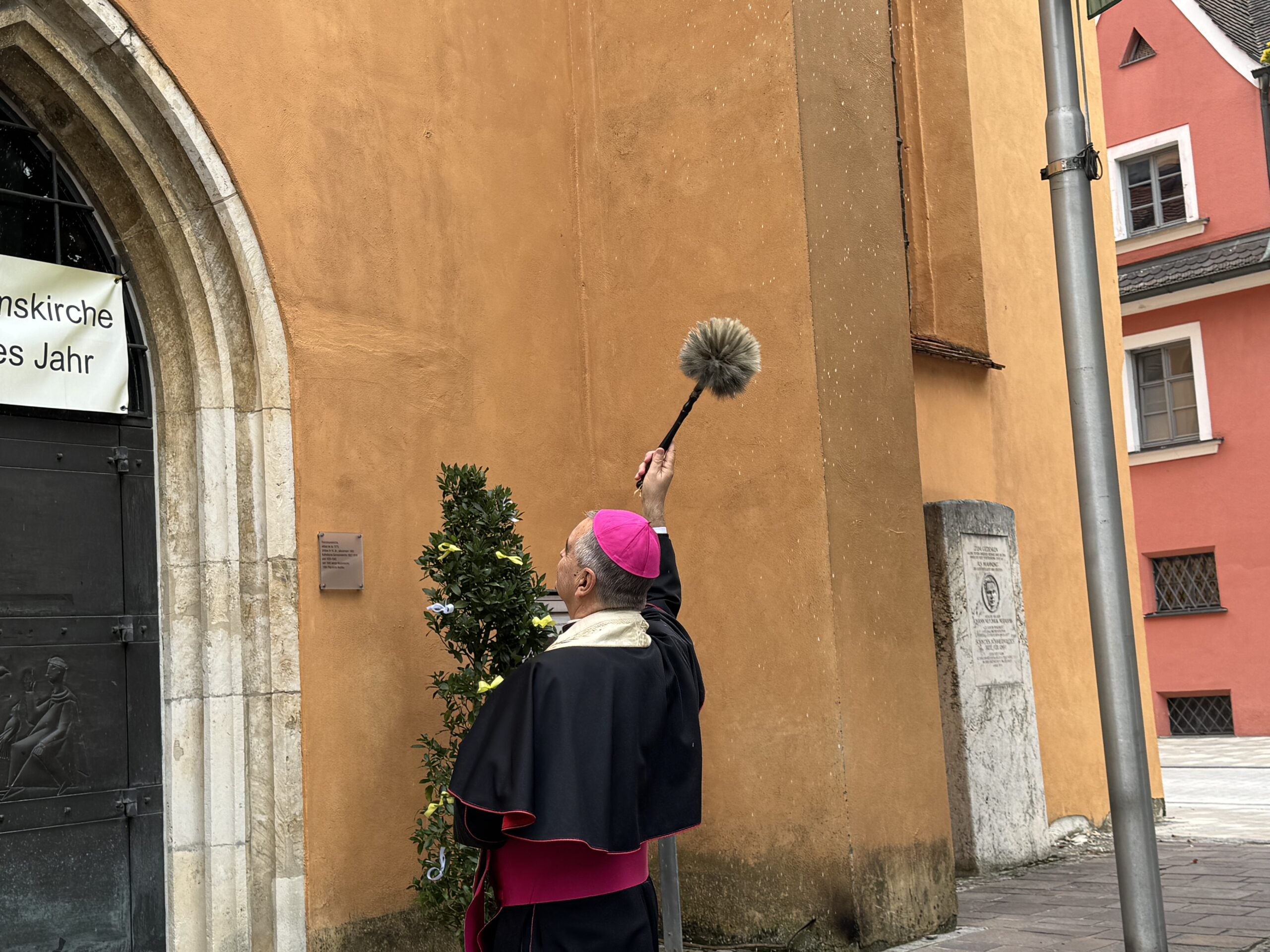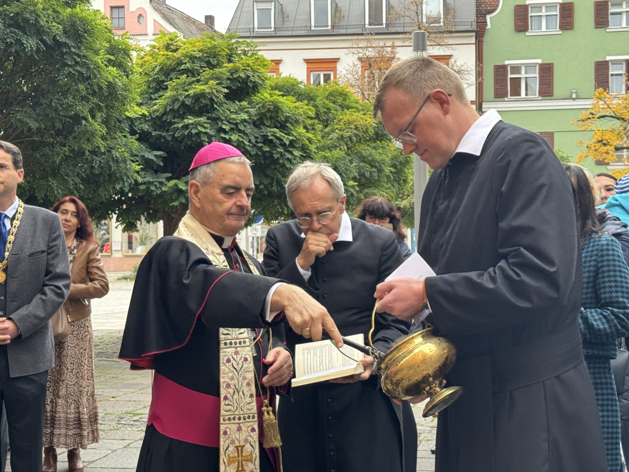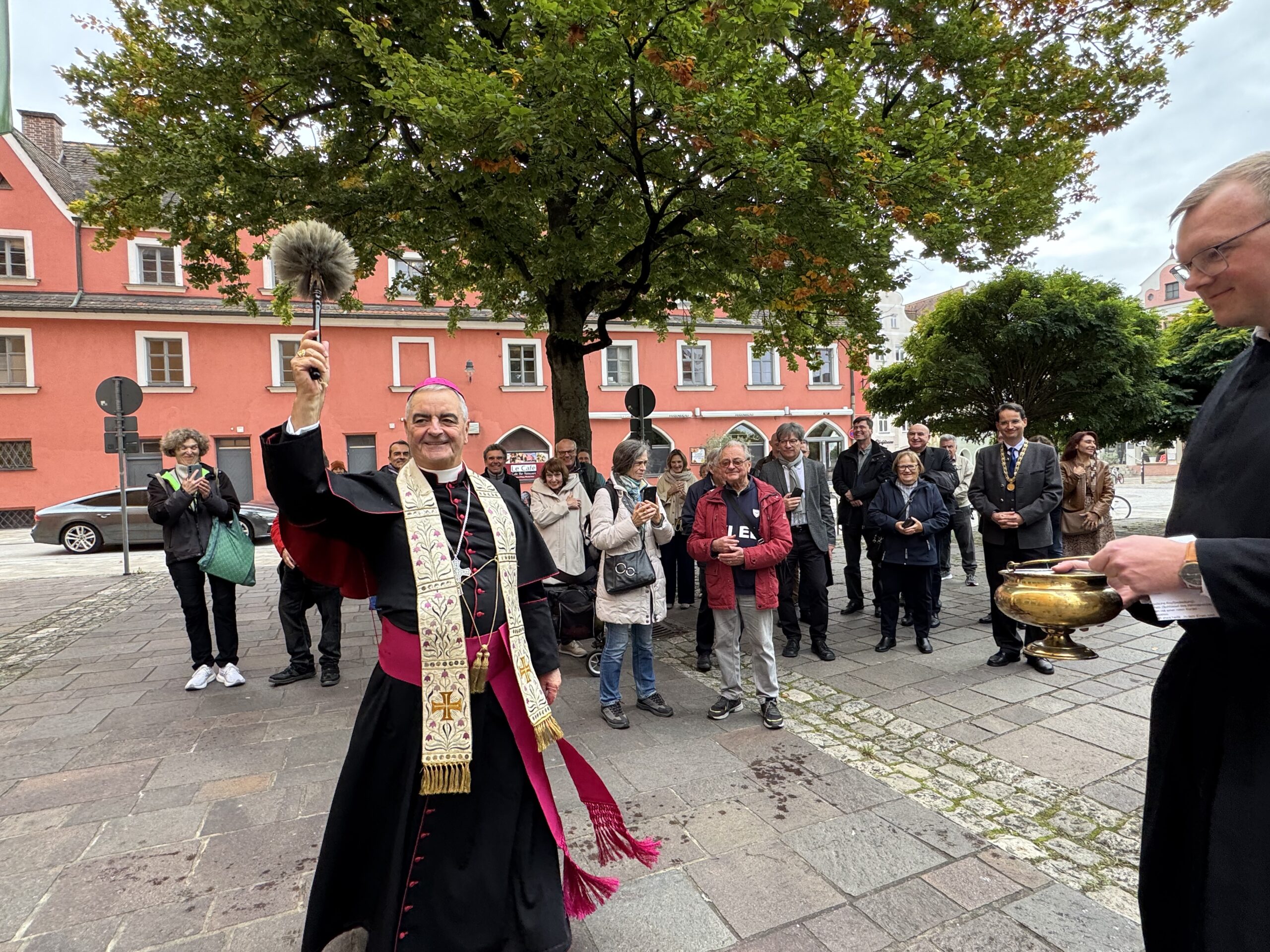 An der kurzen Zeremonie nahmen neben Pater Lorenz, Vizerektor der Franziskanerkirche, auch Oberbürgermeister Dr. Michael Kern, Dr. Matthias Schickel – einer der Hauptinitiatoren zur Rettung der Kirche – sowie zahlreiche Gläubige und Interessierte teil.