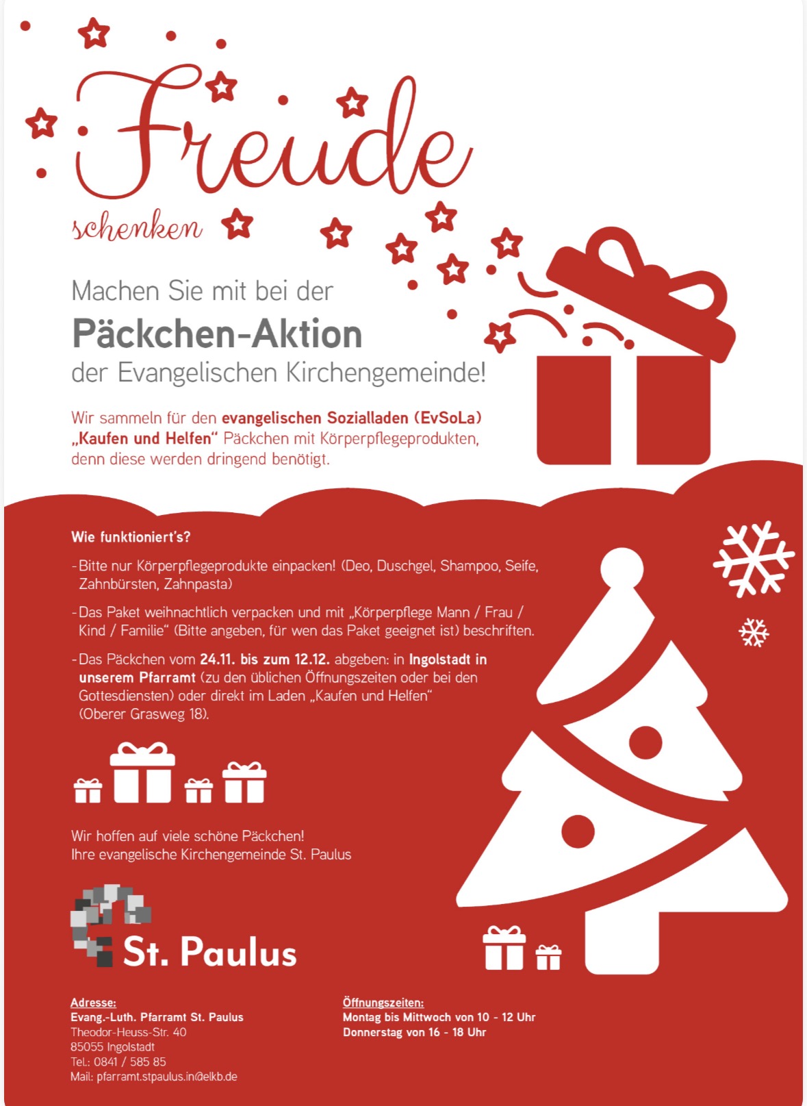 Abgabestellen: Pfarramt St. Paulus, der evang. Sozialladen „Kaufen und Helfen“ (die Öffnungszeiten entnehmen Sie bitte der Homepage) oder zu den Gottesdienst-Zeiten in der PauluskircheDie Kirchengemeinde hofft auf viele Pakete und bedankt sich bereits vorab bei allen Unterstützern