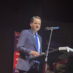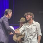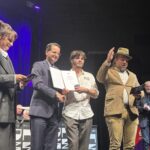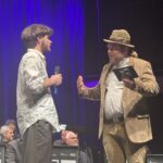 Seine Co-Moderatorin Olivia Wendt steigt passend mit „Mackie Messer“ aus der Dreigroschenoper in den Abend ein.