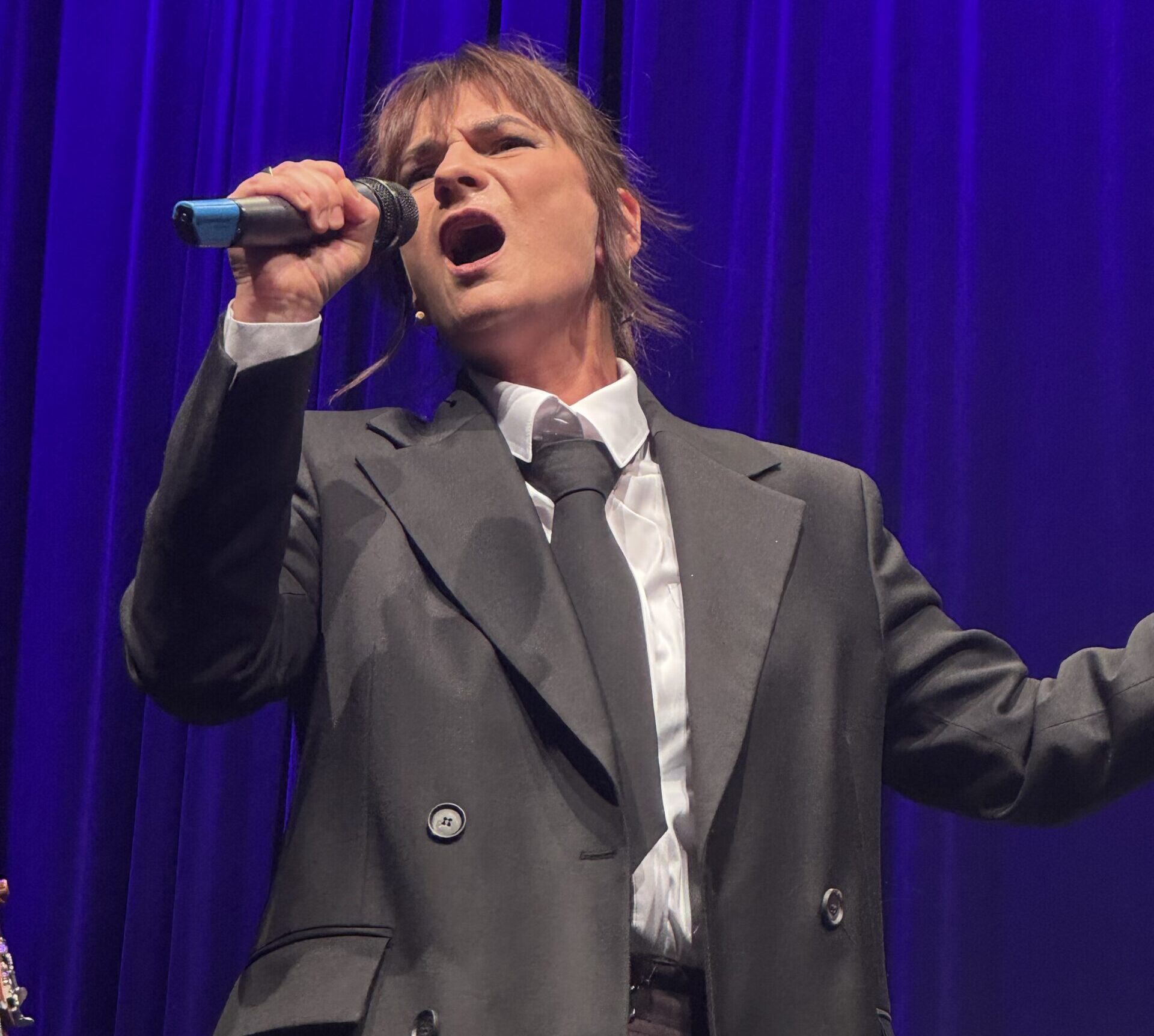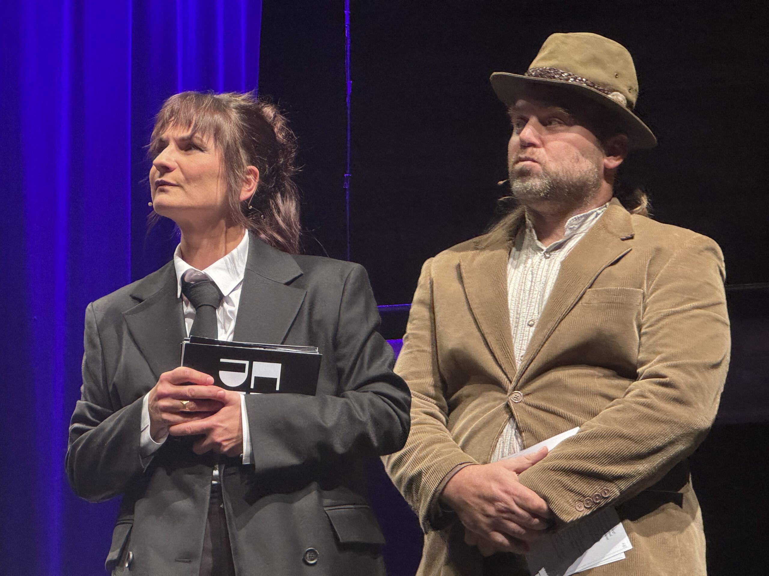 Seine Co-Moderatorin Olivia Wendt steigt passend mit „Mackie Messer“ aus der Dreigroschenoper in den Abend ein.