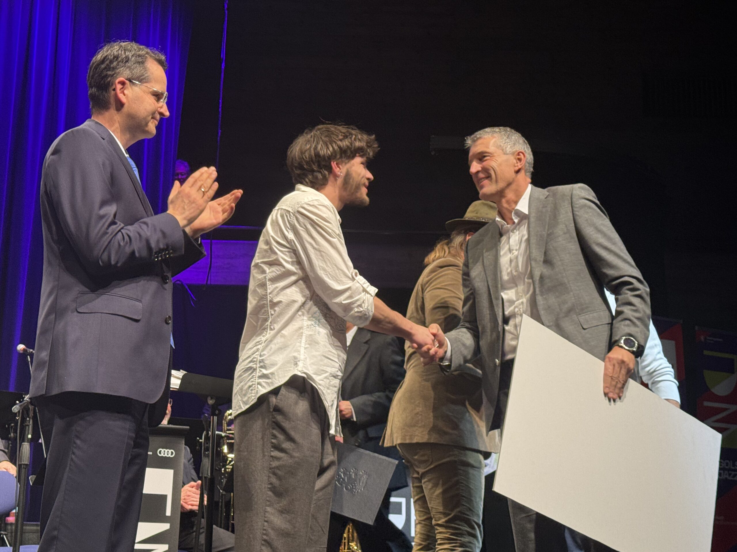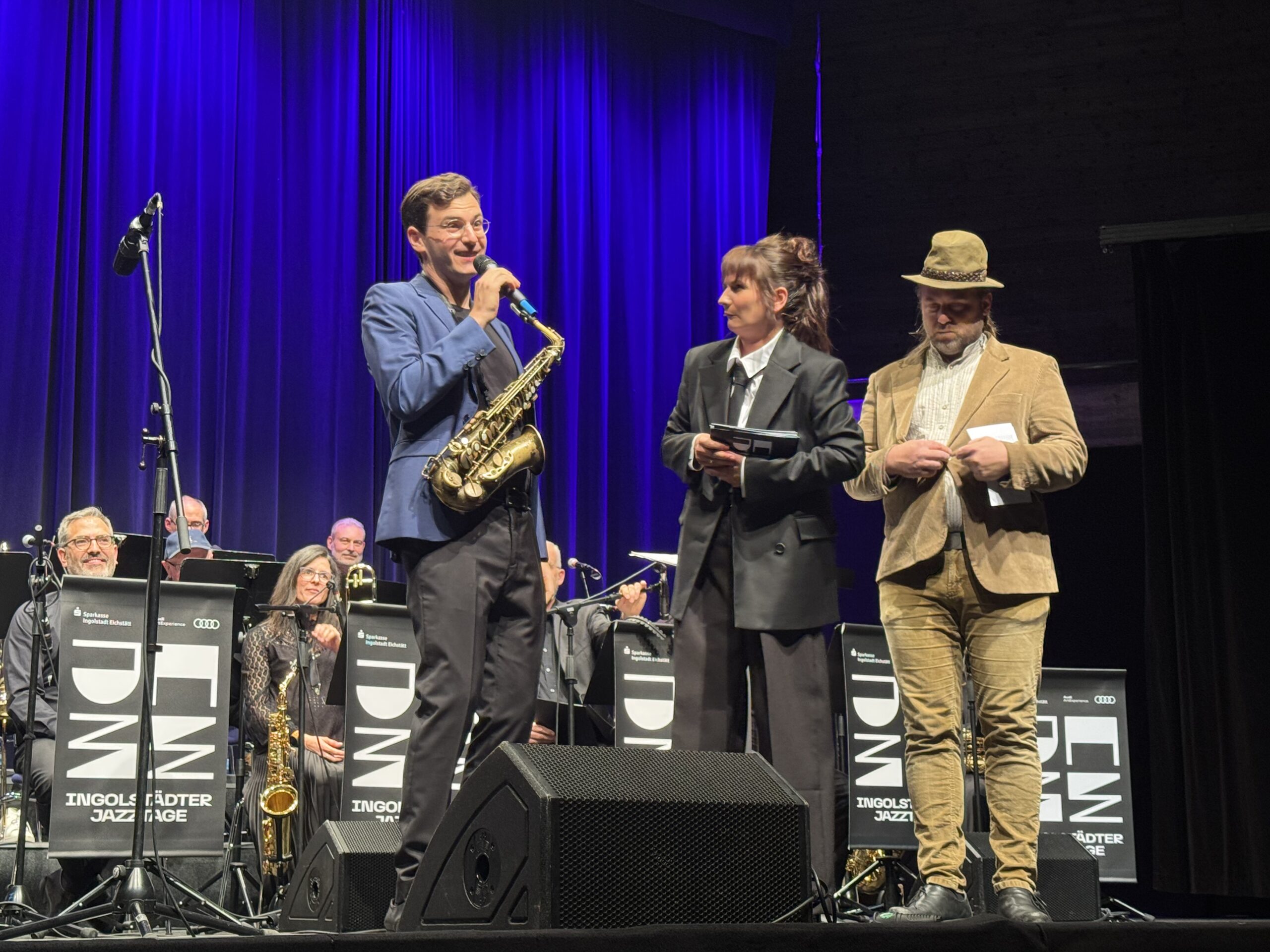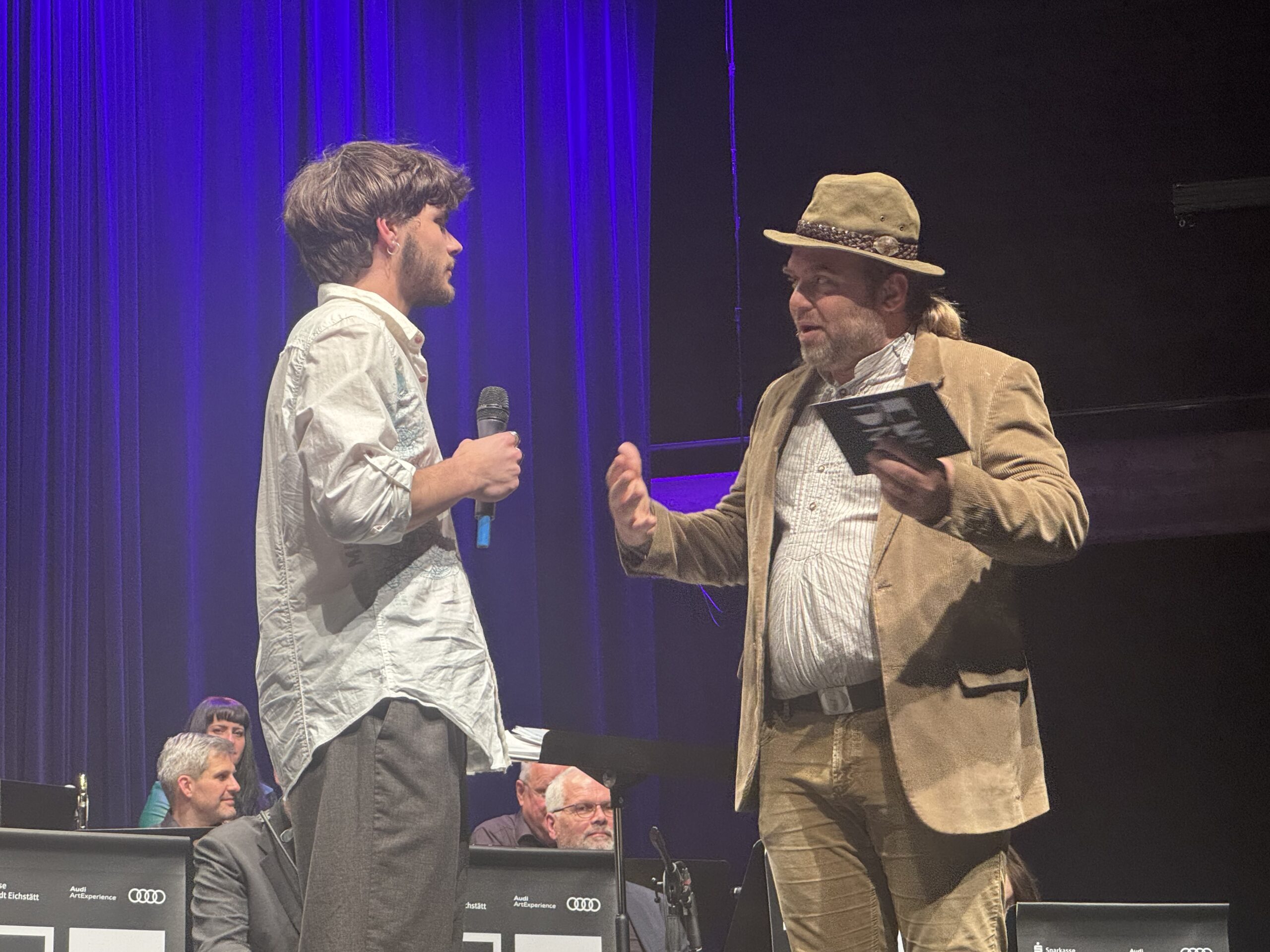 Der Oberbürgermeister verkündet die Verleihung des renommierten Jazzförderpreises an den jungen Trompeter Raphael Greil. Laudator Robert Aichner hält eine eindrucksvolle und bewegende Laudatio auf seinen ehemaligen Schüler. Greil zeigt sich ob der Auszeichnung und der Preisübergabe durch die Preisstifter – die Stadtsparkasse Ingolstadt-Eichstätt und die Audi AG – sichtlich berührt.