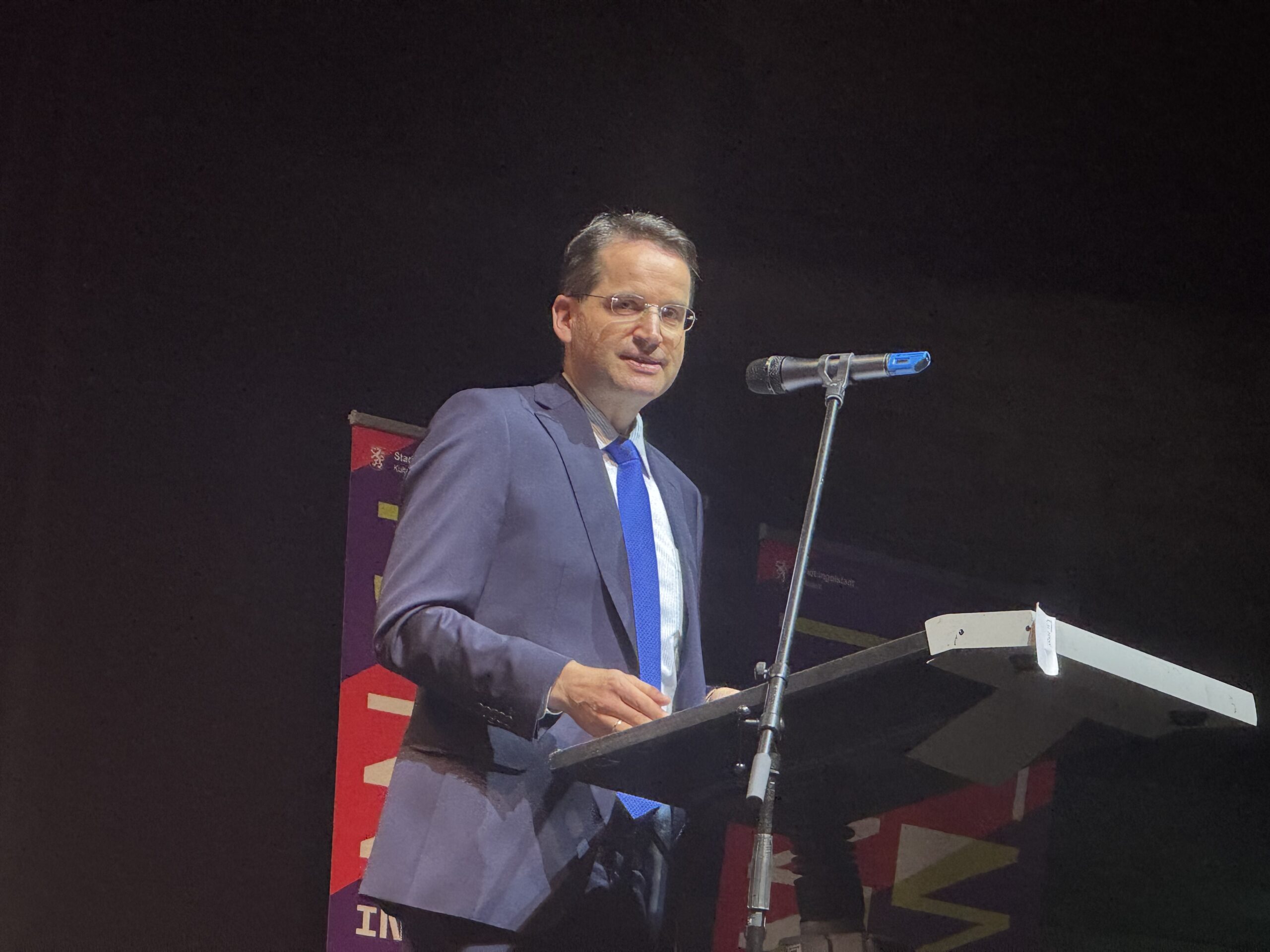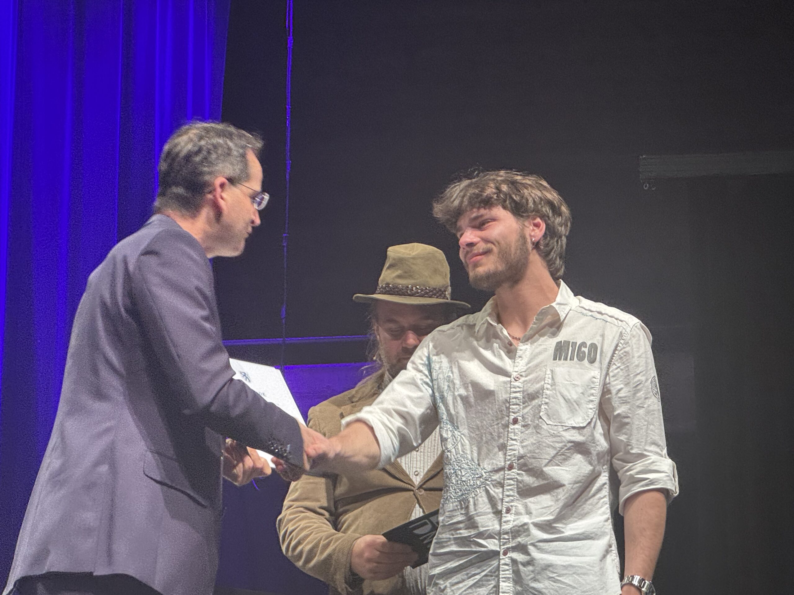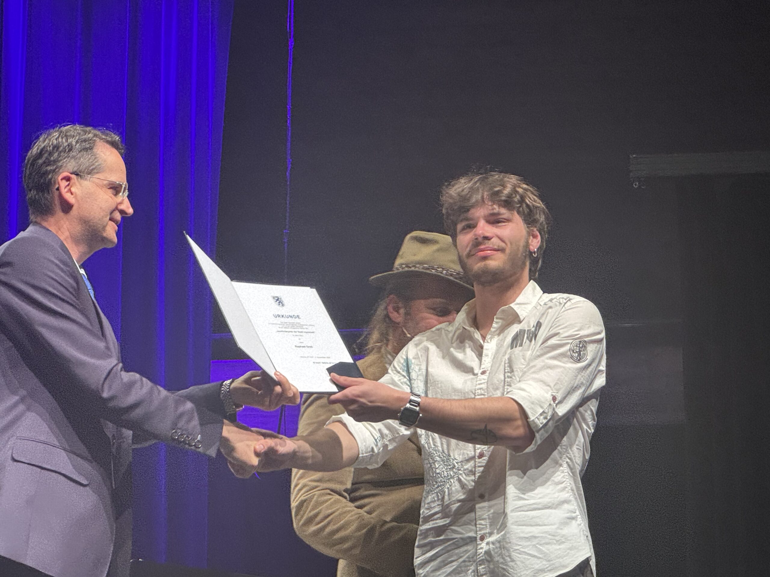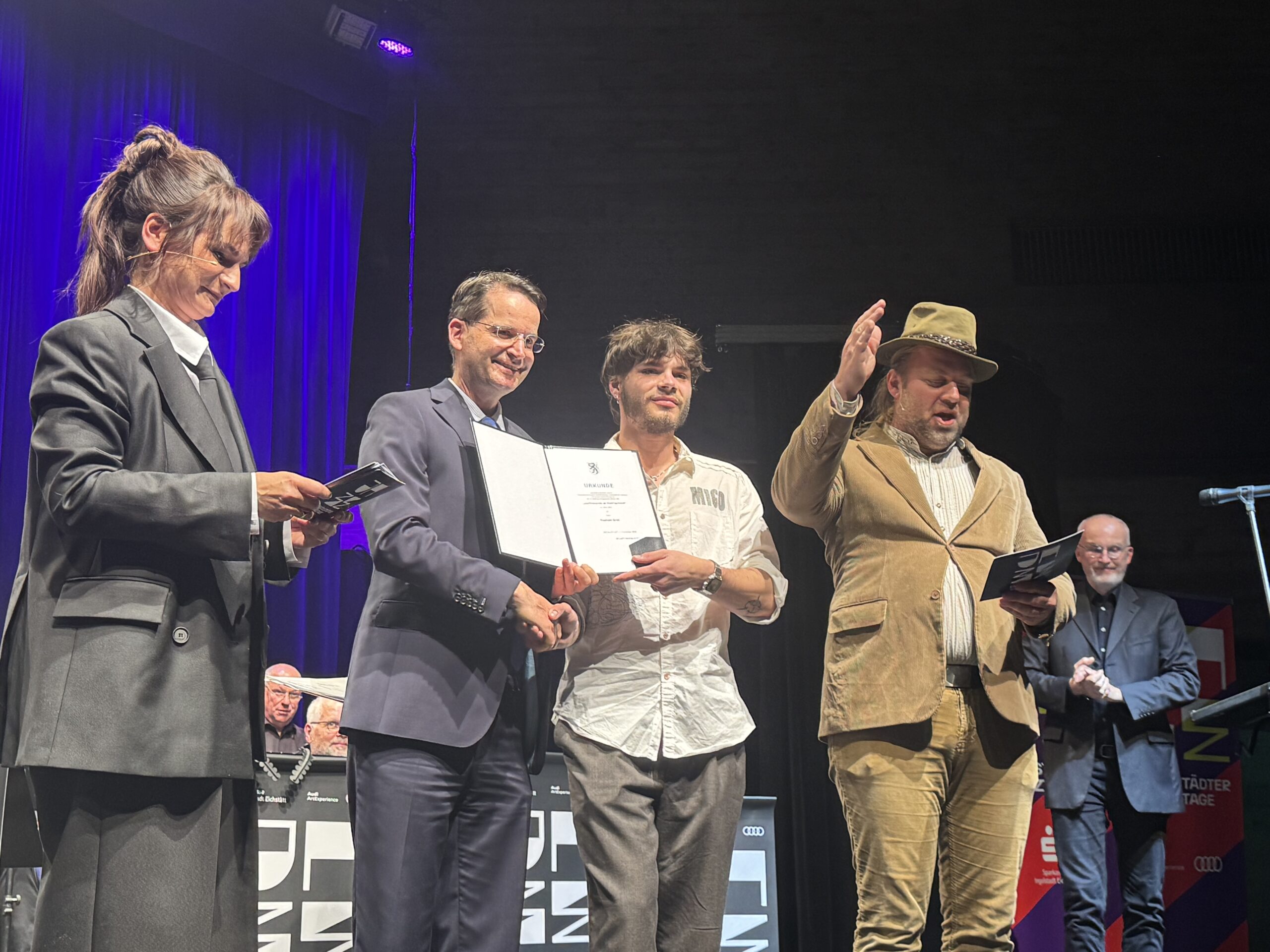 Der Oberbürgermeister verkündet die Verleihung des renommierten Jazzförderpreises an den jungen Trompeter Raphael Greil. Laudator Robert Aichner hält eine eindrucksvolle und bewegende Laudatio auf seinen ehemaligen Schüler. Greil zeigt sich ob der Auszeichnung und der Preisübergabe durch die Preisstifter – die Stadtsparkasse Ingolstadt-Eichstätt und die Audi AG – sichtlich berührt.