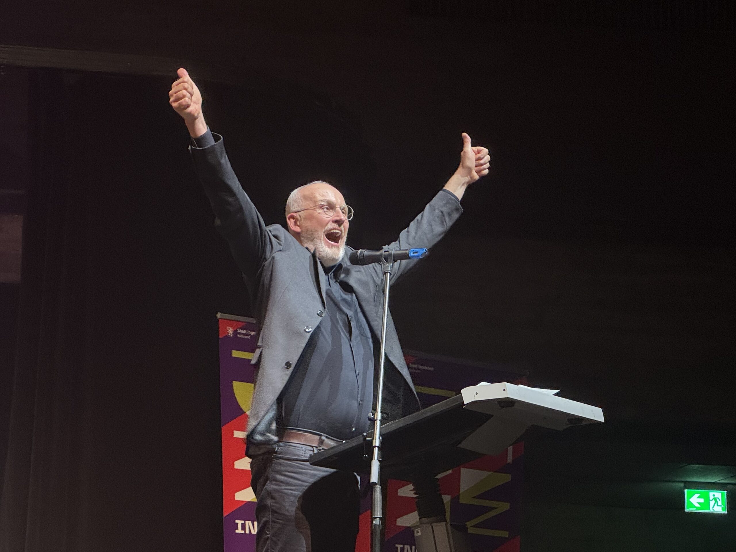 Anschließend erlebt das Publikum im fast voll besetzten Saal eine musikalische Kostprobe seiner Band JORA QNTT, deren Klangsprache deutlich nordisch geprägt ist.
