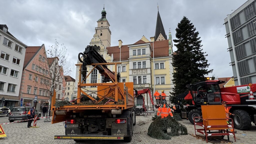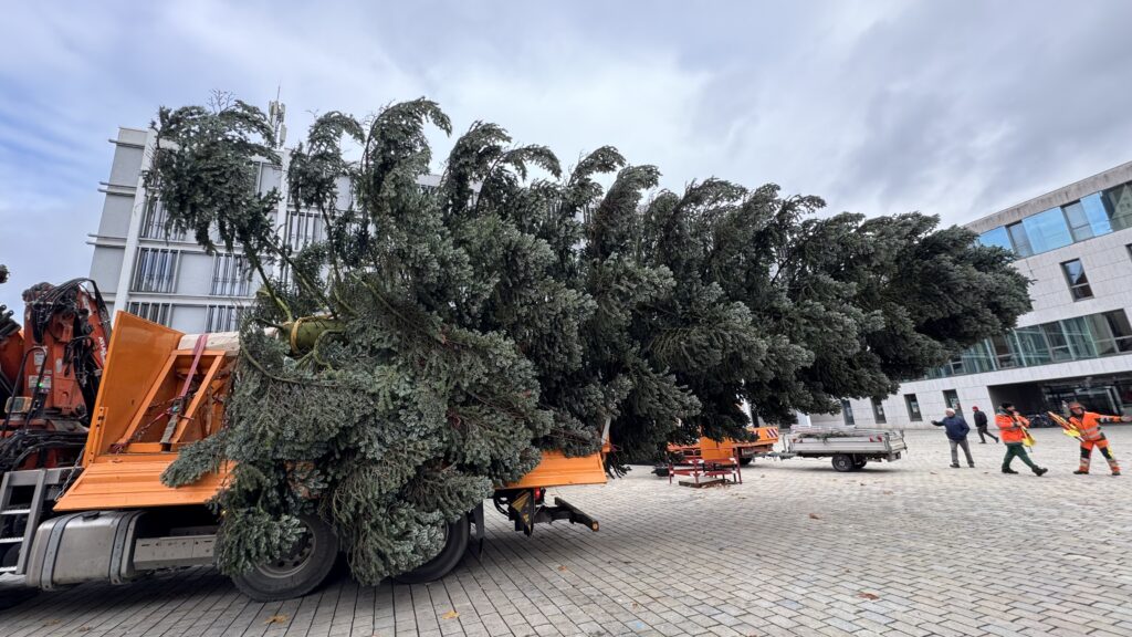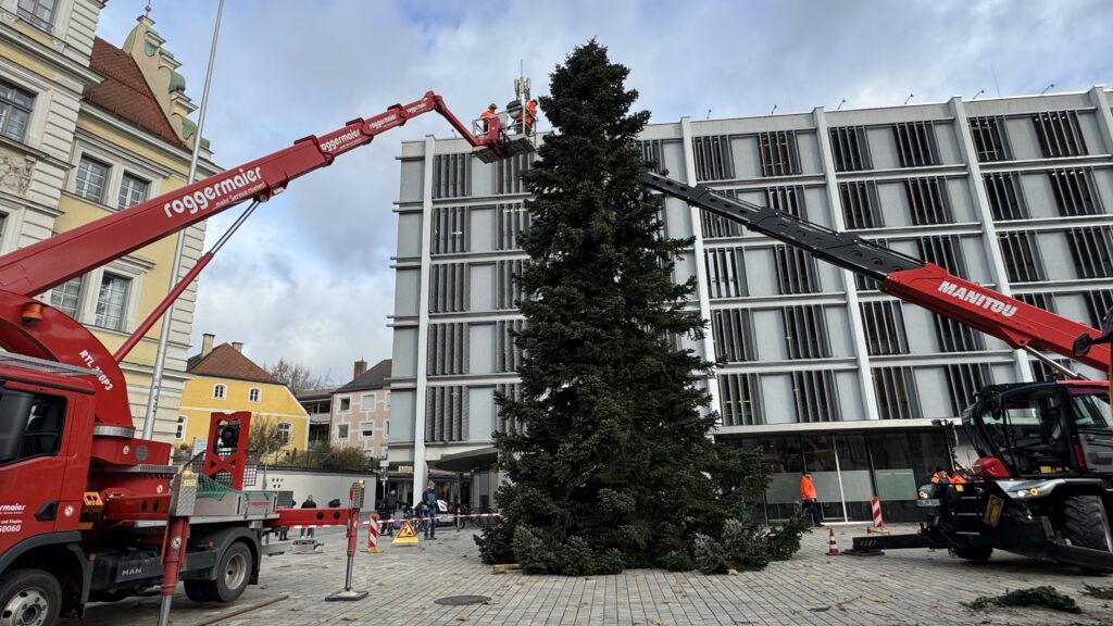 Heute Mittag wurde der diesjährige Weihnachtsbaum für den Rathausplatz angeliefert. Die Nordmanntanne stammt aus dem Königsmoos und wurde von einem privaten Spender zur Verfügung gestellt. Der Baum ist rund 14 Meter hoch und wiegt etwa drei Tonnen.