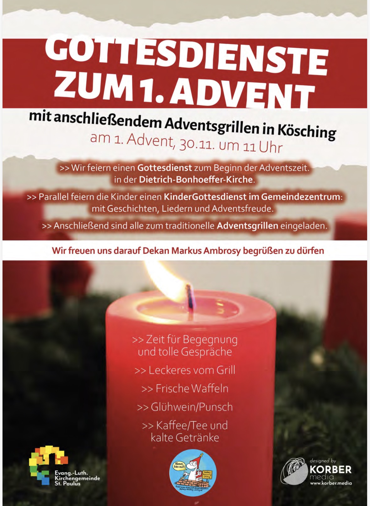 Zur Einstimmung auf die Adventszeit lädt die Kirchengemeinde St. Paulus zusammen mit dem Förderverein des Evang.-Luth. Gemeindezentrums Hepberg-Kösching-Lenting e.V. am 30. November um 11 Uhr zu einem Gottesdienst mit anschließendem Adventsgrillen ein. Zeitgleich zum regulären Gottesdienst wird ein Kindergottesdienst im Gemeindezentrum angeboten. An diesem 1. Advent erinnert sich die Kirchengemeinde besonders an die Einweihung der Ladenkirche in Kösching vor genau 25 Jahren. Dr. Markus Ambrosy, der damalige Pfarrer und heutige Dekan von Fürstenfeldbruck, wird beim Gottesdienst von Pfarrerin Anja Raidel zu diesem besonderen Anlass dabei sein.