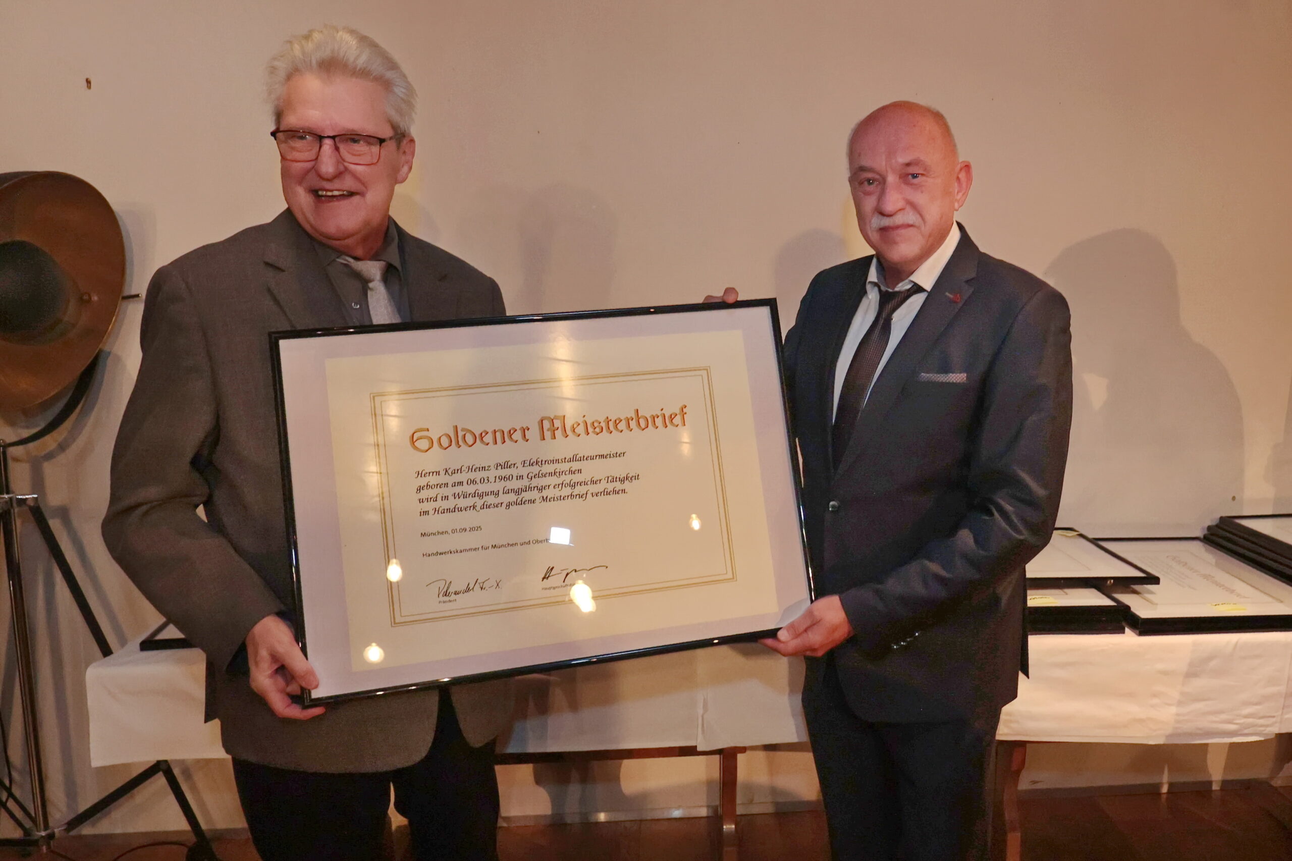 Kreishandwerksmeister Jürgen Seißler würdigte in seiner Ansprache die beeindruckenden beruflichen Lebensleistungen der Geehrten: „Ob im eigenen Unternehmen oder als angestellte Fachkräfte – Sie alle waren über Jahrzehnte verlässliche Ansprechpartner für Kolleginnen und Kollegen, für Kundinnen und Kunden.“ Der Meisterbrief sei nicht ohne Grund als „großer Befähigungsnachweis“ bekannt. „Er steht für das, was Meister können, leisten und wissen müssen“, betonte Seißler. Die Übergabe der Goldenen Meisterbriefe erfolgte durch die Obermeister der jeweiligen Innungen.