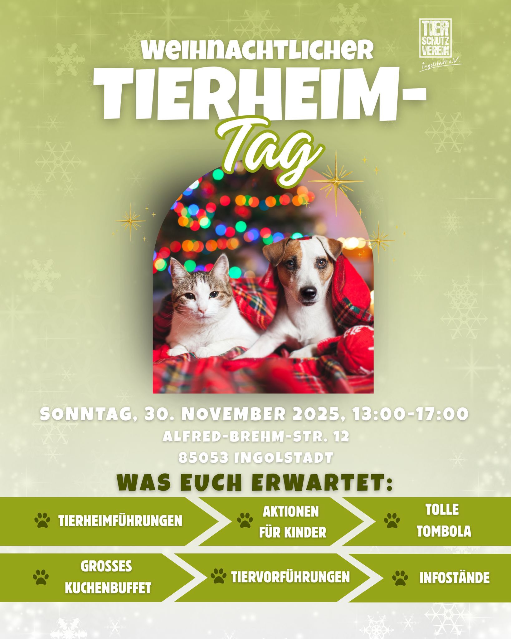 Am Sonntag, den 30. November 2025, lädt der Tierschutzverein Ingolstadt e. V. zum weihnachtlichen Tierheim-Tag in die Alfred-Brehm-Straße 12 ein.