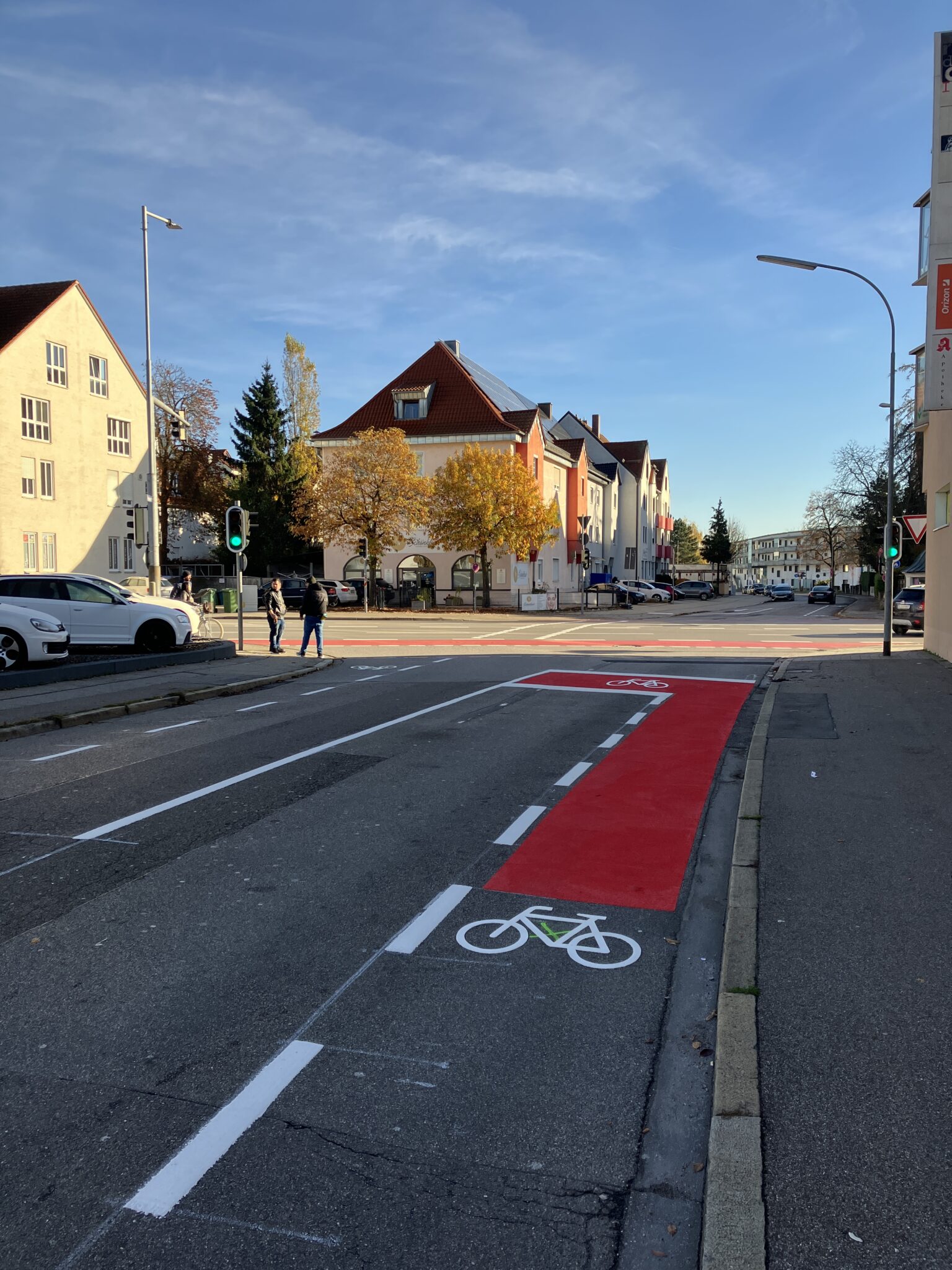 In beiden Bereichen wurden neue Markierungen aufgebracht und Aufstellflächen geschaffen, die den Radverkehr klarer führen und Konflikte mit anderen Verkehrsteilnehmern möglichst reduzieren. Dazu gehören Schutzstreifen, Radfahrstreifen, sowie rot markierte Aufstellflächen an Kreuzungen, die für bessere Sichtbarkeit sorgen. Ergänzend erleichtern neue Furten, optimierte Abbiegeführungen und ein Fahrradgrünpfeil das sichere Vorankommen. Für die Maßnahmen sind keine Parkplätze entfallen.