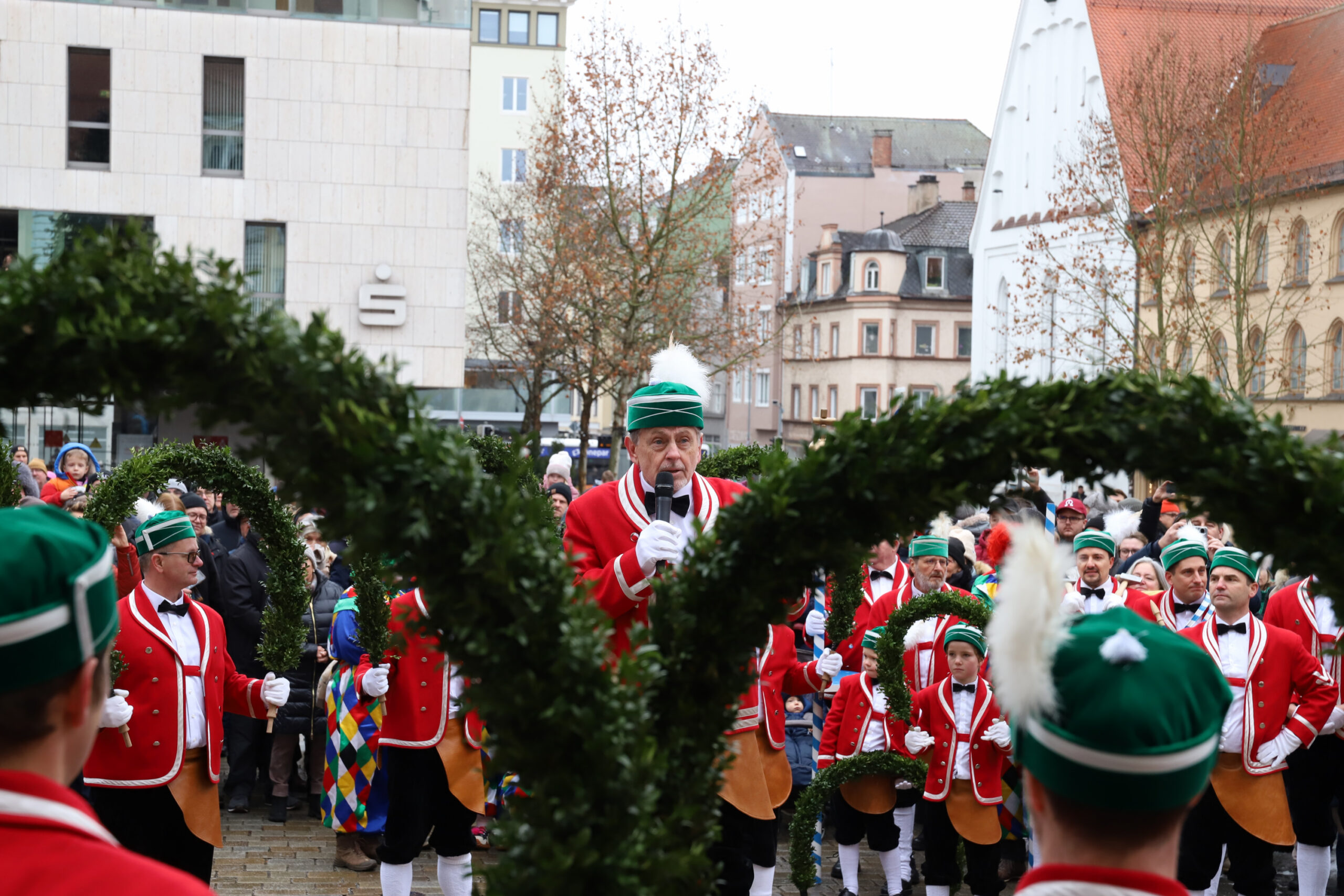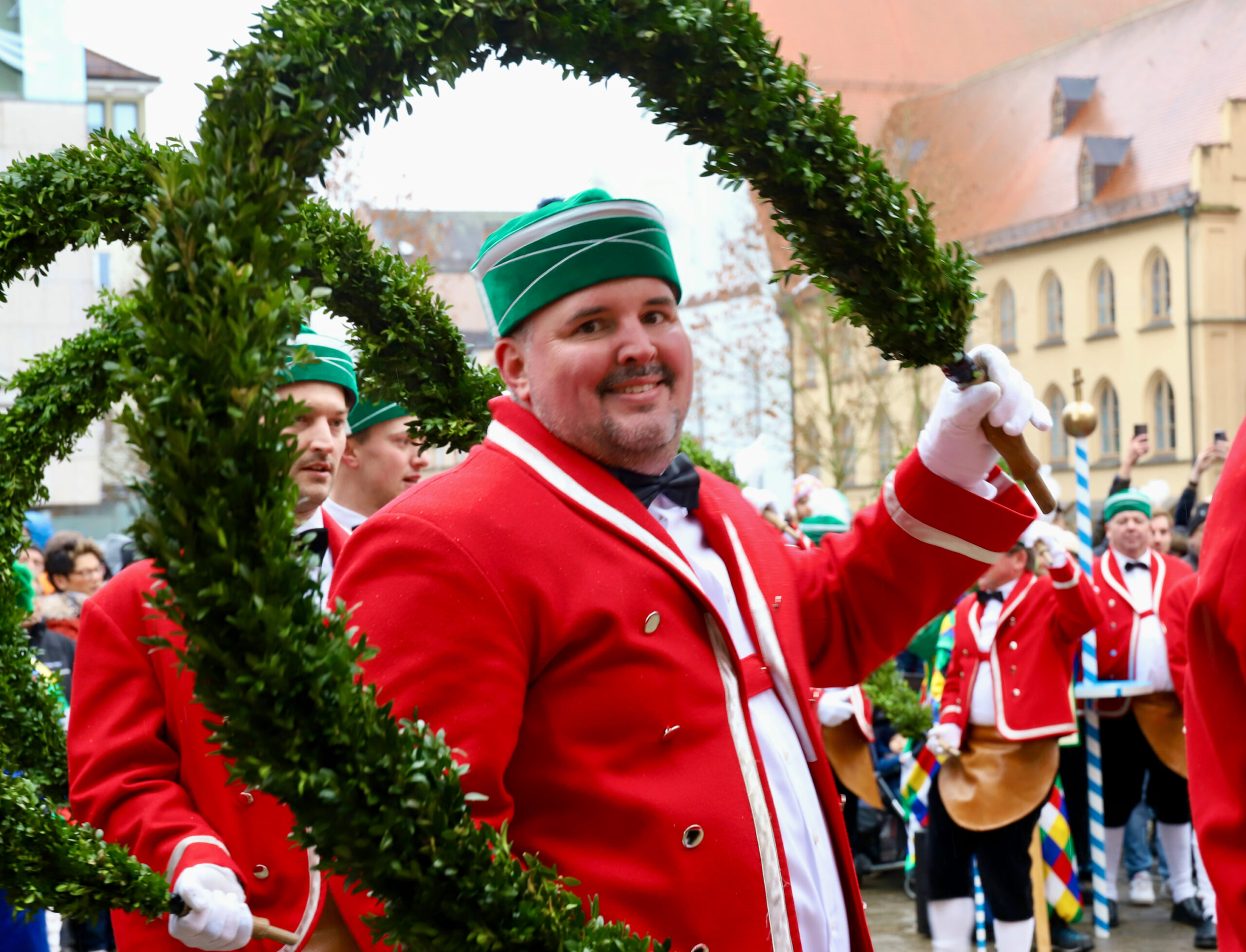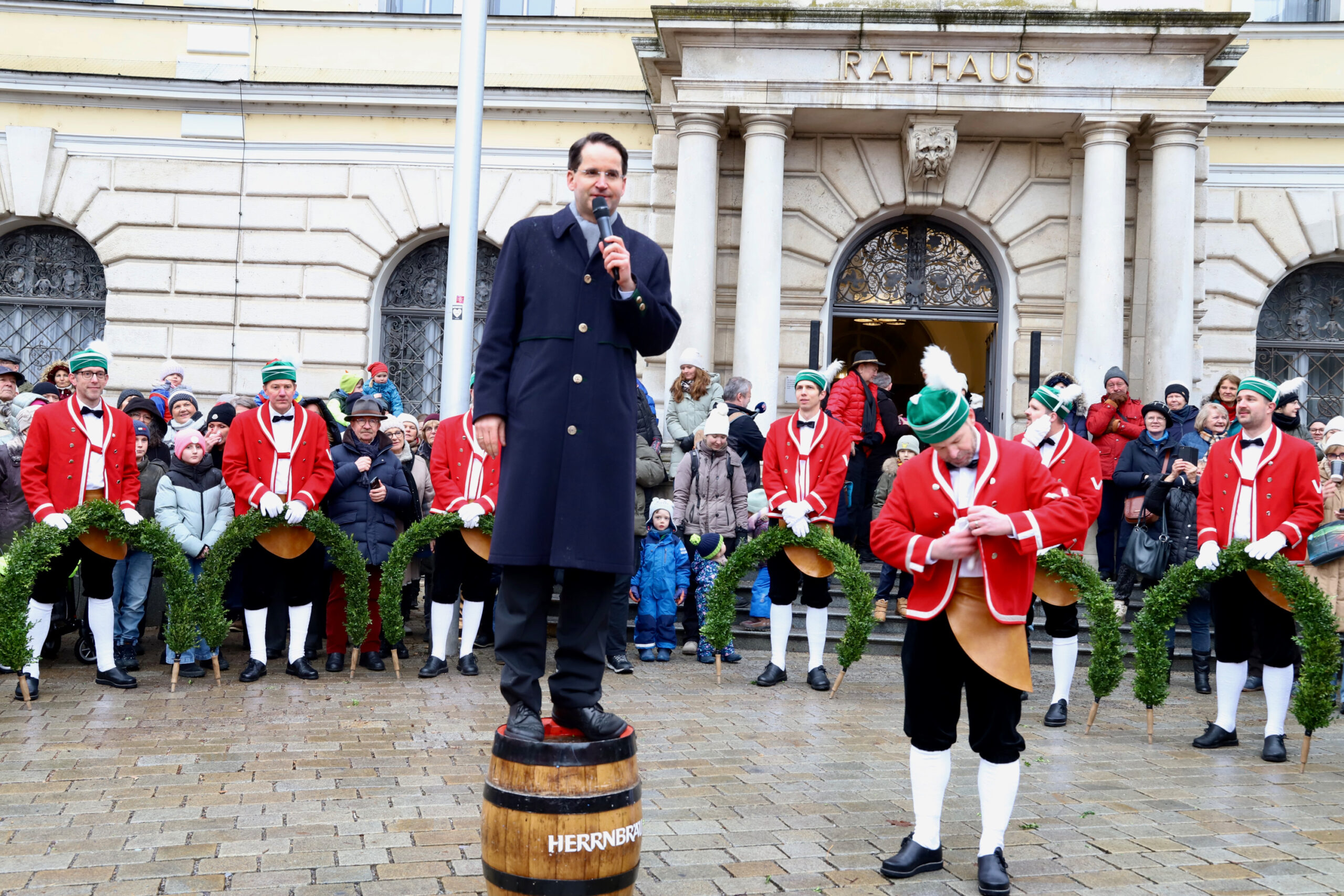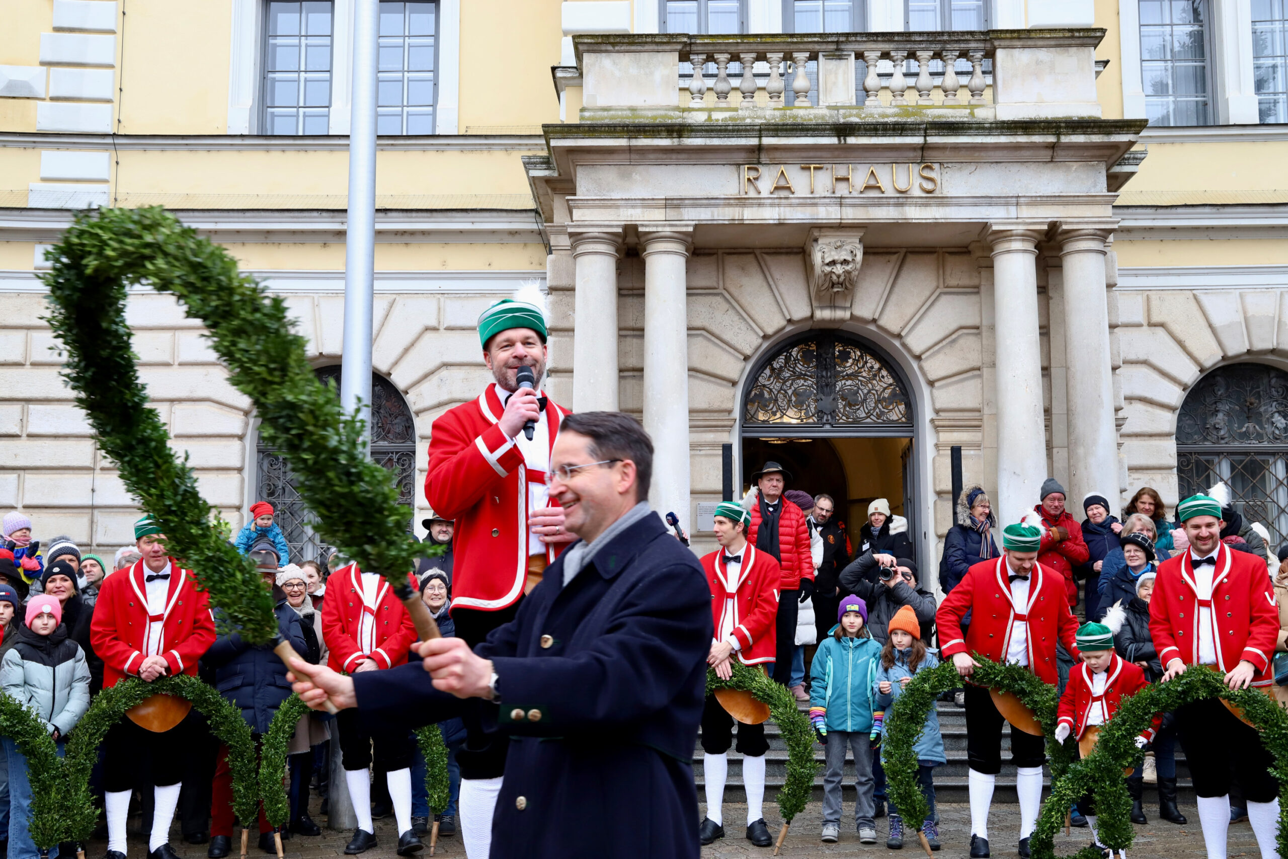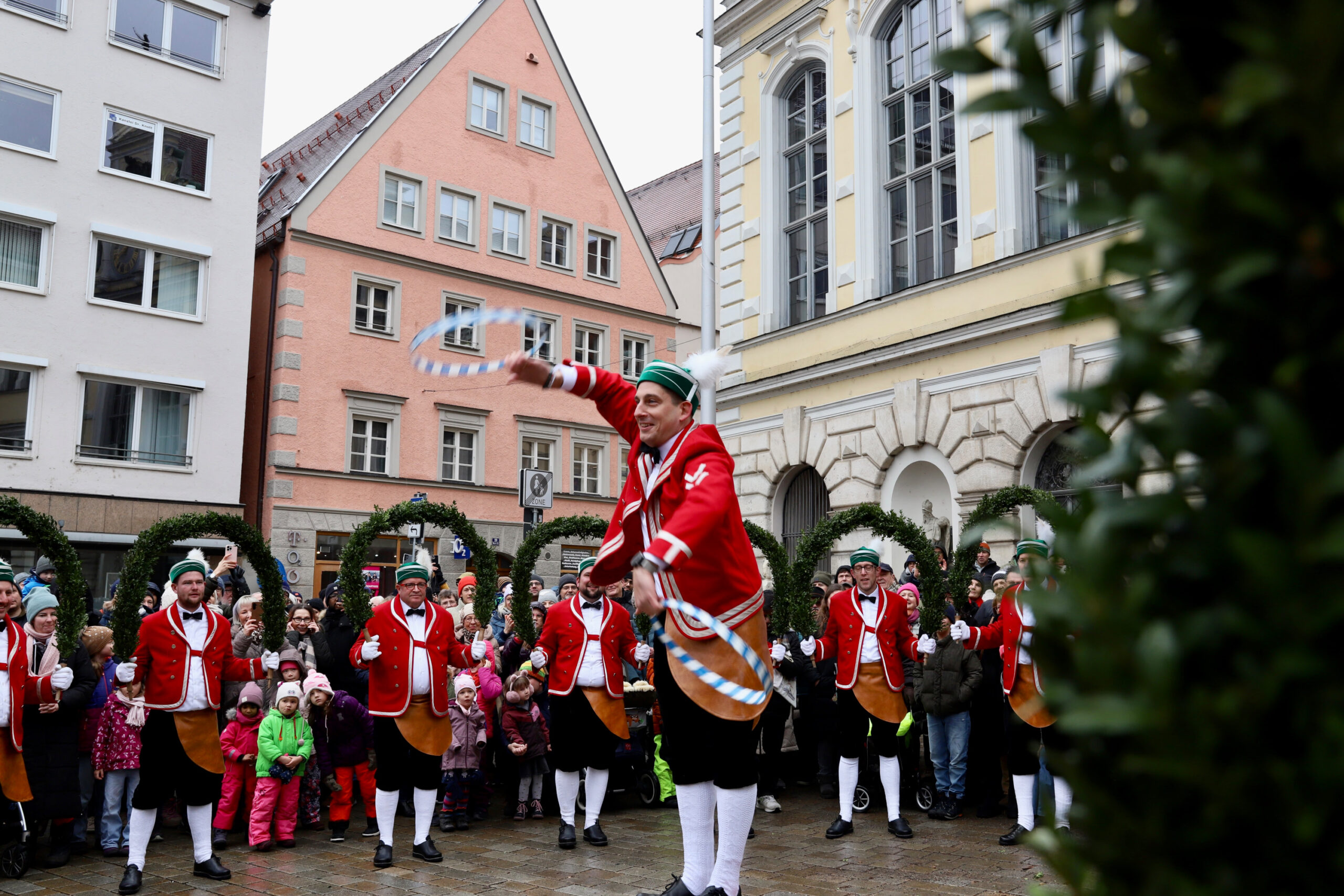 Mit dem Gottesdienst um 10 Uhr im Liebfrauenmünster begann am Vormittag ein besonderer Tag für die Stadt. Um 11 Uhr zogen die Ingolstädter Schäffler auf den Rathausplatz und eröffneten dort ihre Saison. Vor dicht gedrängtem Publikum erfüllten Musik, Reifen und Tracht die Innenstadt – ein seltenes Schauspiel, das Ingolstadt nur alle sieben Jahre erlebt.
