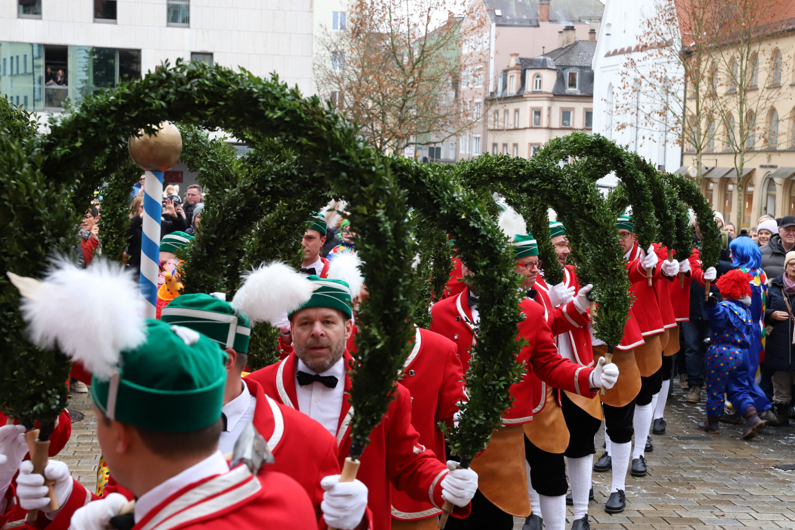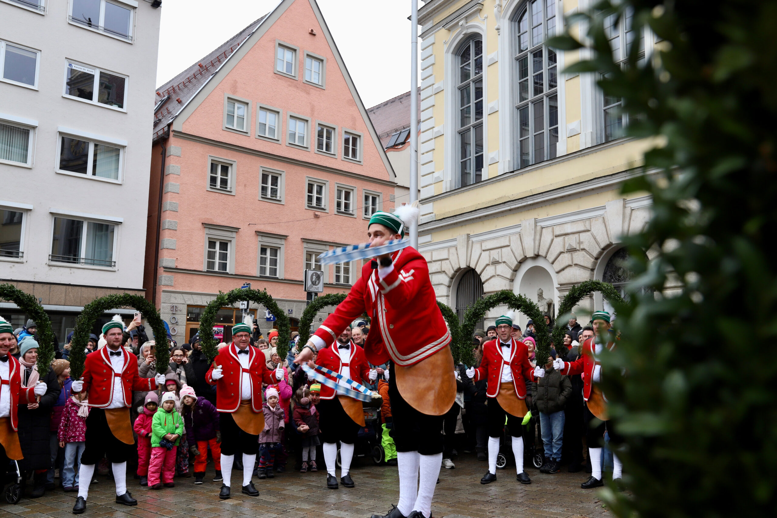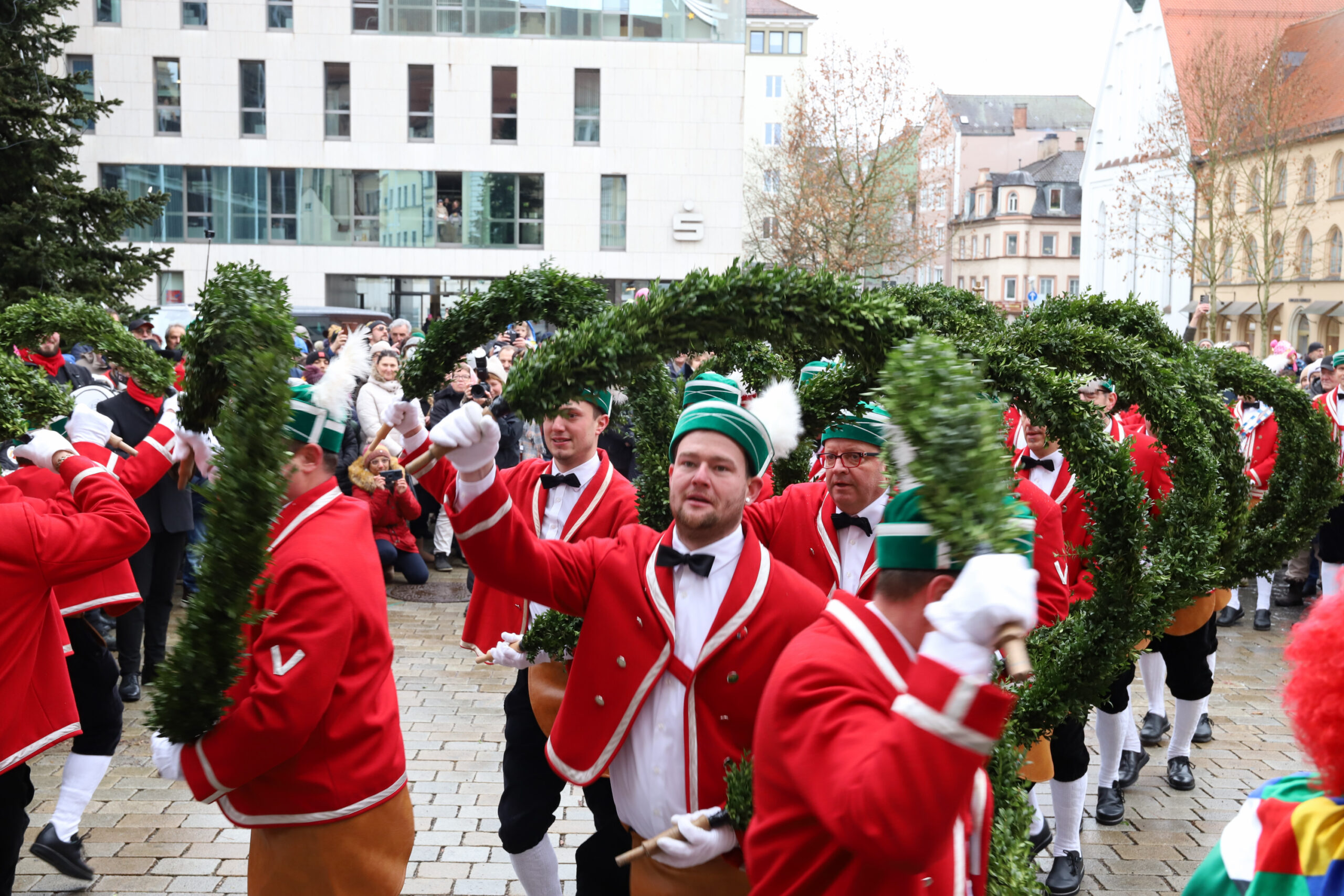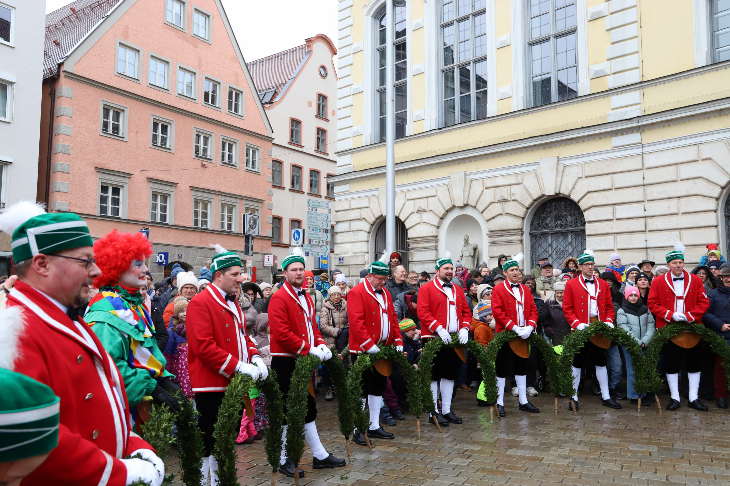 Mit dem Gottesdienst um 10 Uhr im Liebfrauenmünster begann am Vormittag ein besonderer Tag für die Stadt. Um 11 Uhr zogen die Ingolstädter Schäffler auf den Rathausplatz und eröffneten dort ihre Saison. Vor dicht gedrängtem Publikum erfüllten Musik, Reifen und Tracht die Innenstadt – ein seltenes Schauspiel, das Ingolstadt nur alle sieben Jahre erlebt.