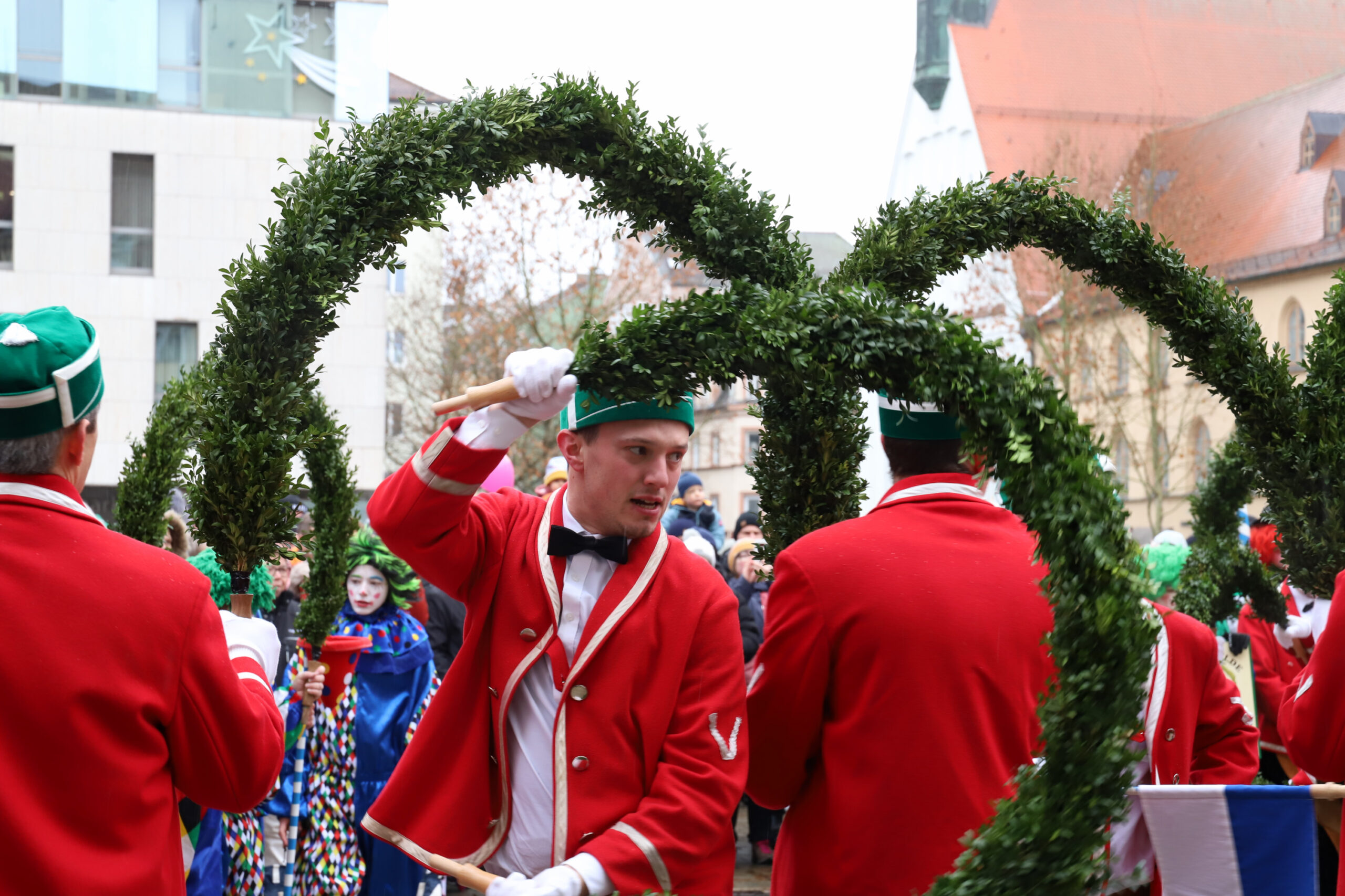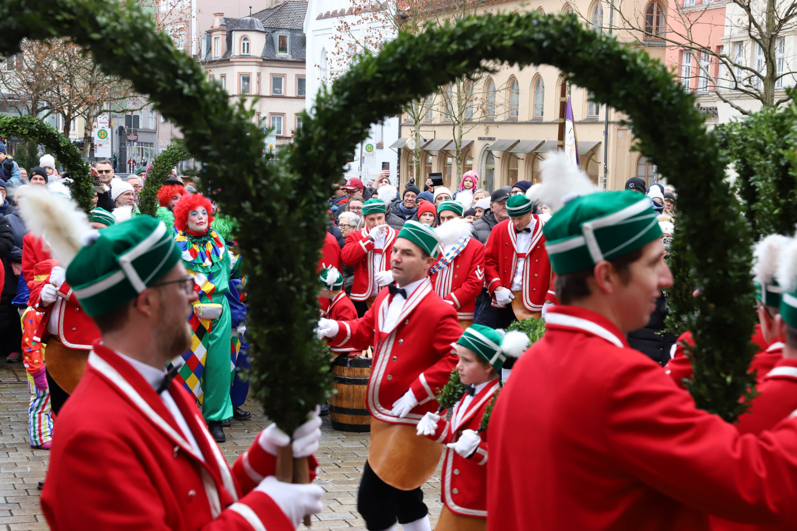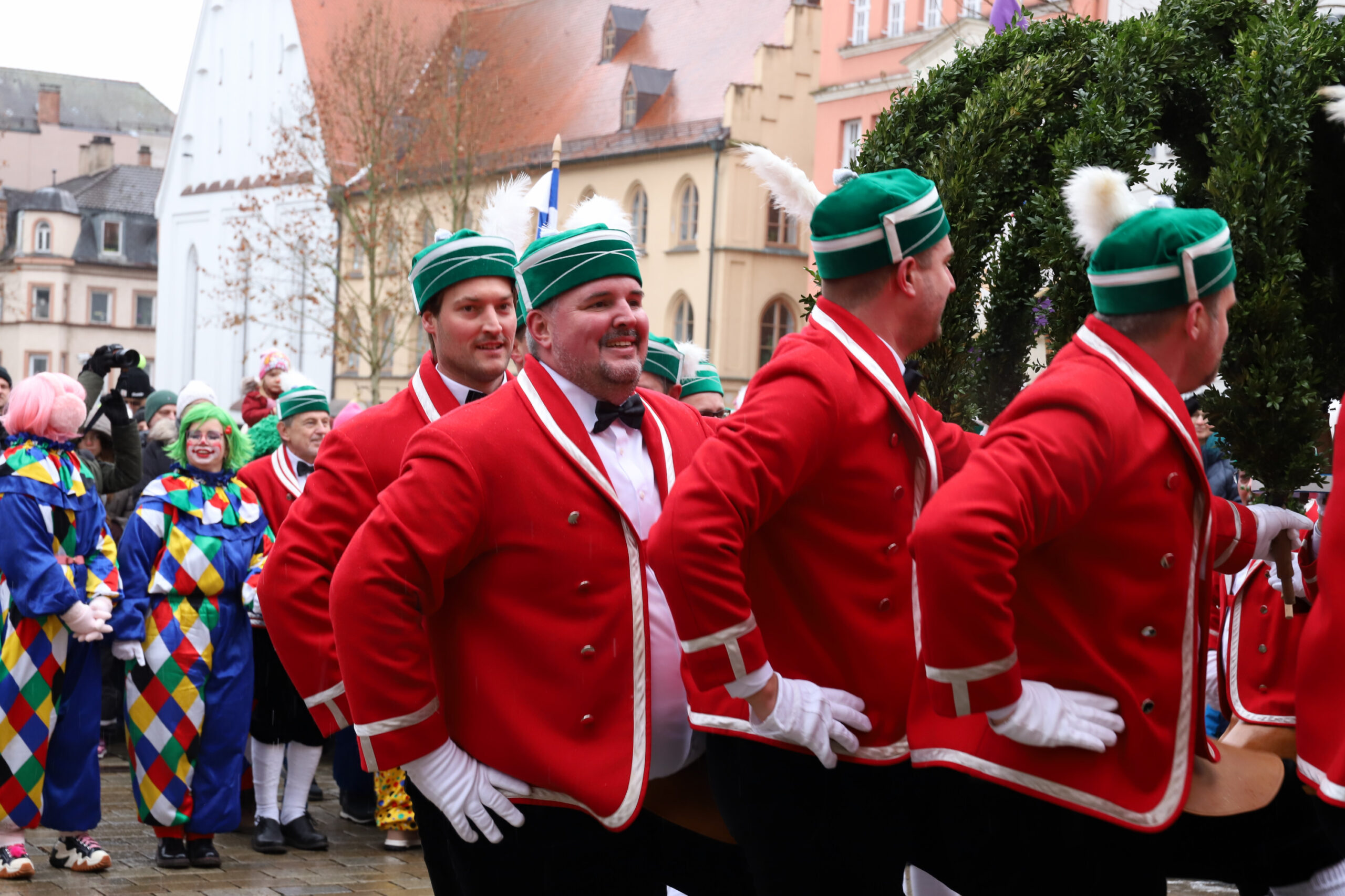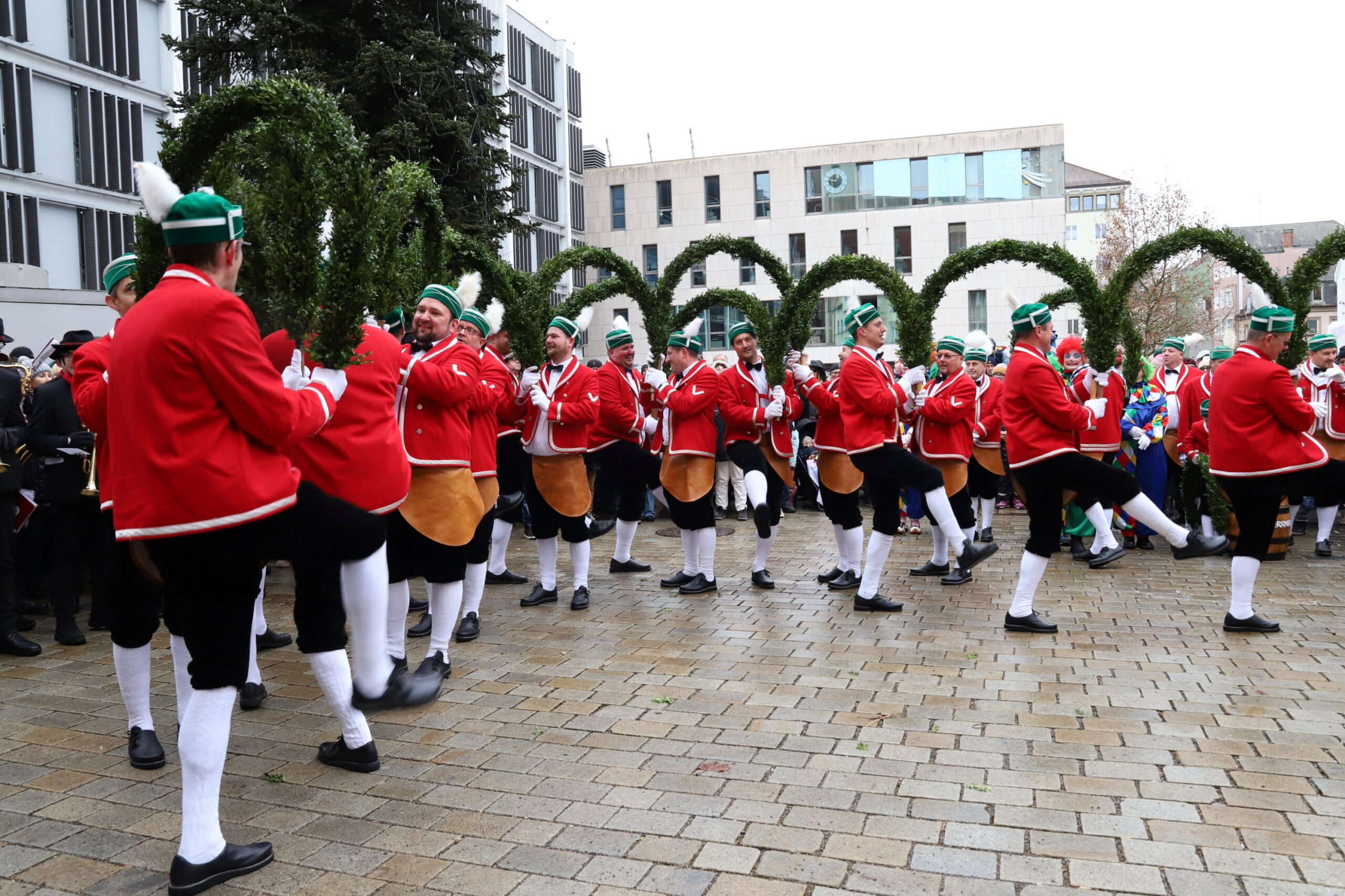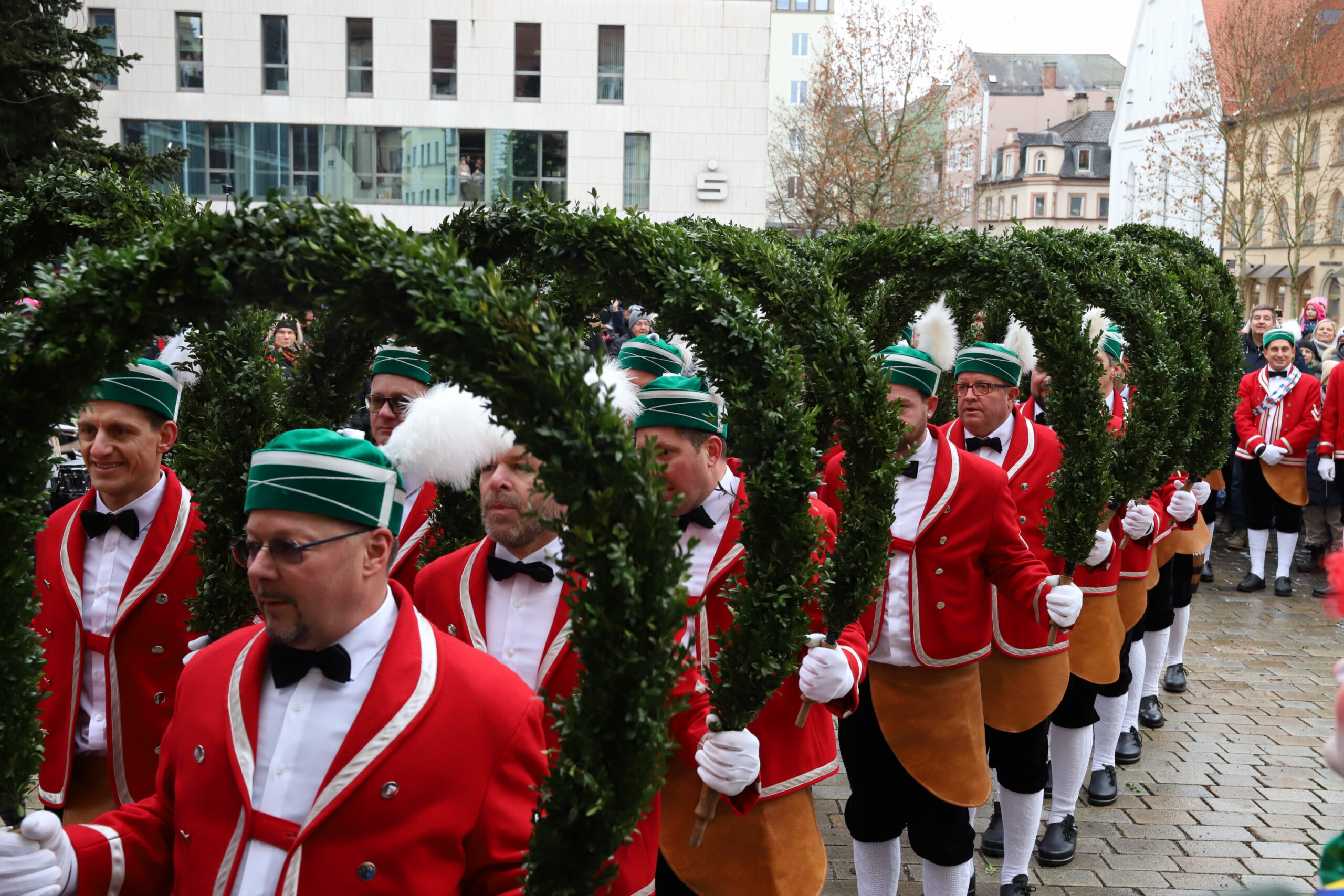 Mit dem Gottesdienst um 10 Uhr im Liebfrauenmünster begann am Vormittag ein besonderer Tag für die Stadt. Um 11 Uhr zogen die Ingolstädter Schäffler auf den Rathausplatz und eröffneten dort ihre Saison. Vor dicht gedrängtem Publikum erfüllten Musik, Reifen und Tracht die Innenstadt – ein seltenes Schauspiel, das Ingolstadt nur alle sieben Jahre erlebt.