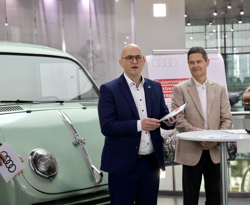 Vorgestellt wurde die Broschüre im Audi museum mobile – bewusst an einem Ort, an dem Unternehmensgeschichte greifbar wird. Jörg Schlagbauer, Vorsitzender des Betriebsrats Audi Ingolstadt, dankte zum Auftakt dem Team und würdigte besonders Ralf Mattes, Sprecher Kommunikation Gesamtbetriebsrat, der die Publikation mit historischen Bildern und einer archivisch angelegten Chronik erarbeitet hat. Als Beispiel für die Kraft der Bildsprache nannte Schlagbauer das Titelmotiv: eine Aufnahme von einer Betriebsversammlung aus dem Jahr 1965, die einen markanten Moment der Unternehmensentwicklung dokumentiert.