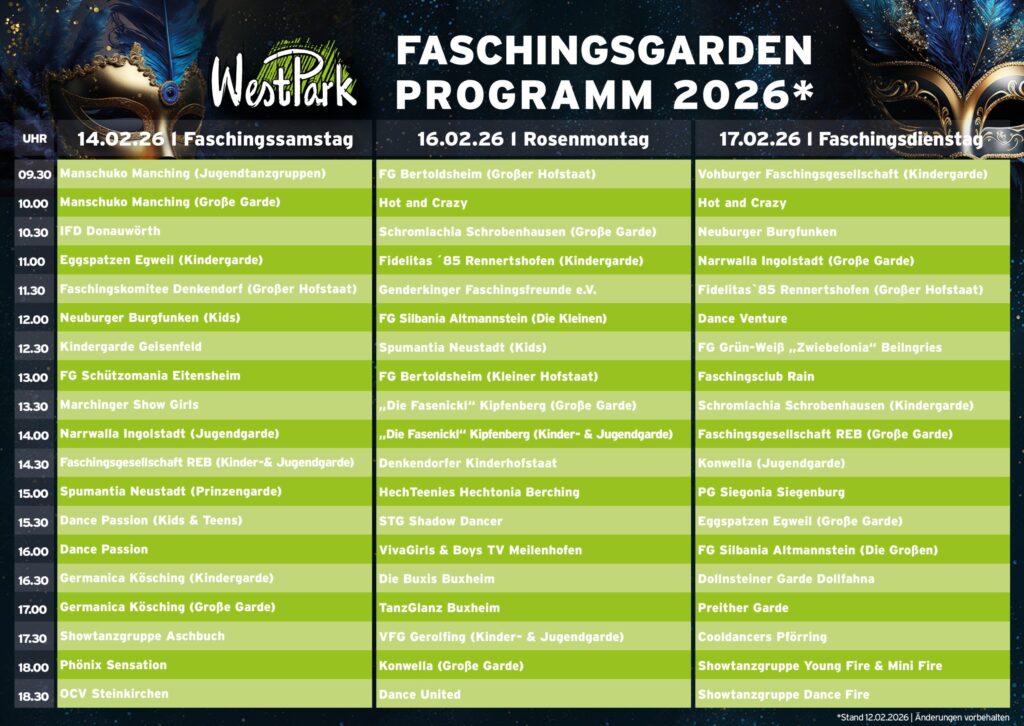 Am Samstag den 14. Februar beginnt das große Gardetreffen in der WestPark PLAZA. Drei Tage lang – 14., 16., und 17. Februar – erwartet Sie ein abwechslungsreiches Programm mit beeindruckenden Auftritten regionaler Garden. Jeweils von 09:30 bis 18:30 Uhr sorgen mitreißenden Choreografien, funkelnde Kostüme und jede Menge Stimmung für echtes Faschingsfeeling. Erleben Sie die fünfte Jahreszeit mitten im WestPark. Ob jung oder alt, verkleidet oder nicht, hier kommt jeder Faschingsfan auf seine Kosten.