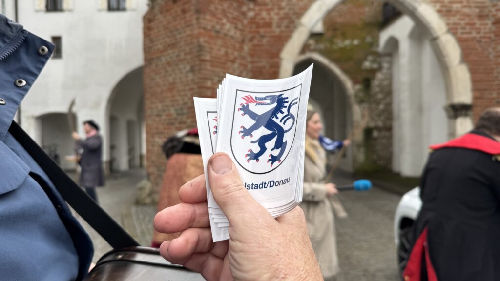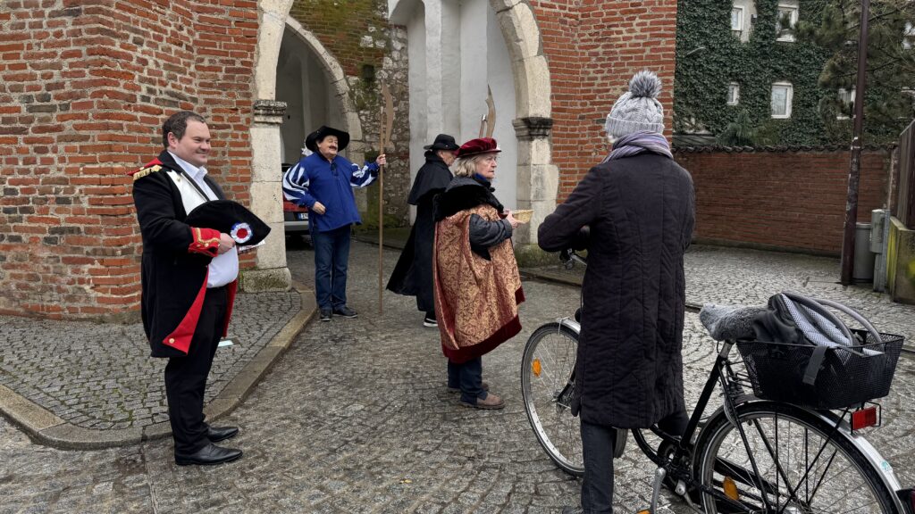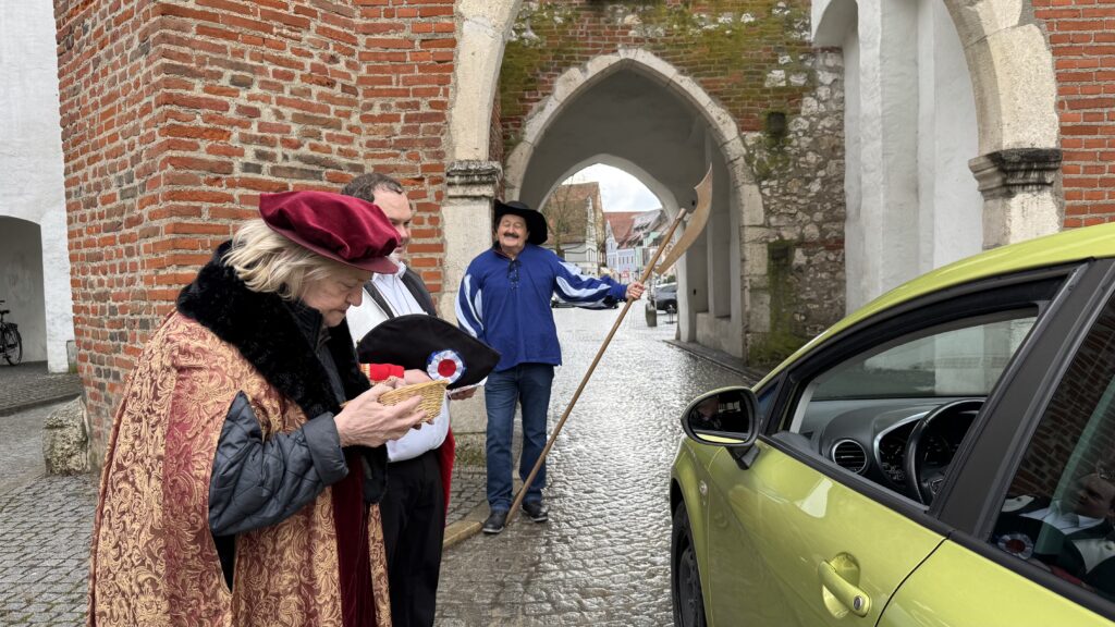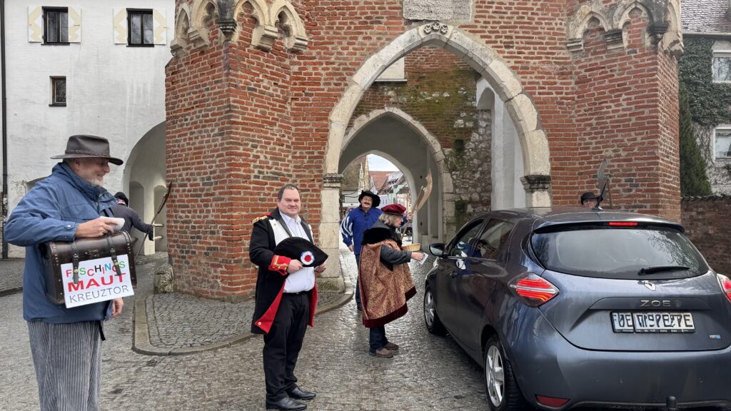 Brigitte Fuchs vom Förderverein erklärte augenzwinkernd, heute werde von „allen Schönen“ Pflasterzoll verlangt – gemeint seien damit alle, die durchs Kreuztor wollen. Entsprechend richtete sich die humorvolle „Faschingsmaut“ nicht nur an Autofahrer: Auch Fußgänger und Radfahrer wurden gebeten, einen symbolischen Zoll zu zahlen, um durch das historische Stadttor zu kommen.