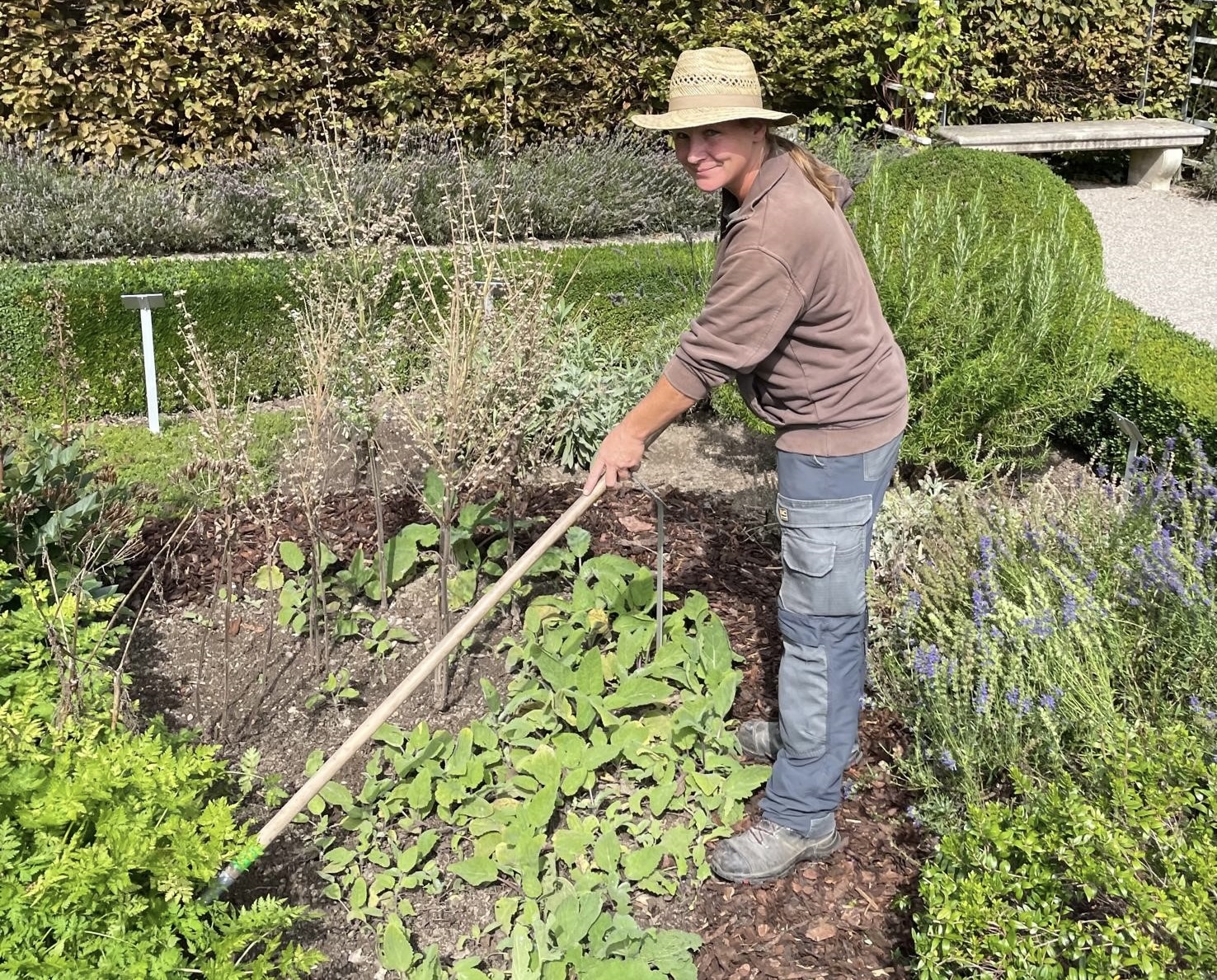Wer zuhause einen Garten hat, der weiß, wieviel Arbeit hinter diesem schönen Bild steckt und wieviel Wissen nötig ist, um jeder Pflanze die für sie idealen Wachstumsbedingungen zu bieten. „Wer kümmert sich hier um den Garten?“ gehört daher auch zu den am häufigsten gestellten Fragen der Gartenbesucher. Die Antwort lautet: Sabine Duschek. Sie ist als Mitarbeiterin des Städtischen Gartenamtes für den Arzneipflanzengarten verantwortlich. Wenn sie im Garten arbeitet, suchen immer wieder Gartenfreunde das Gespräch mit ihr: „Wann setzen Sie die einjährigen Pflanzen?“; „Wann schneiden Sie die Lavendelhecke?“; und vor allem: „Was machen Sie gegen den Buchsbaumzünsler?“