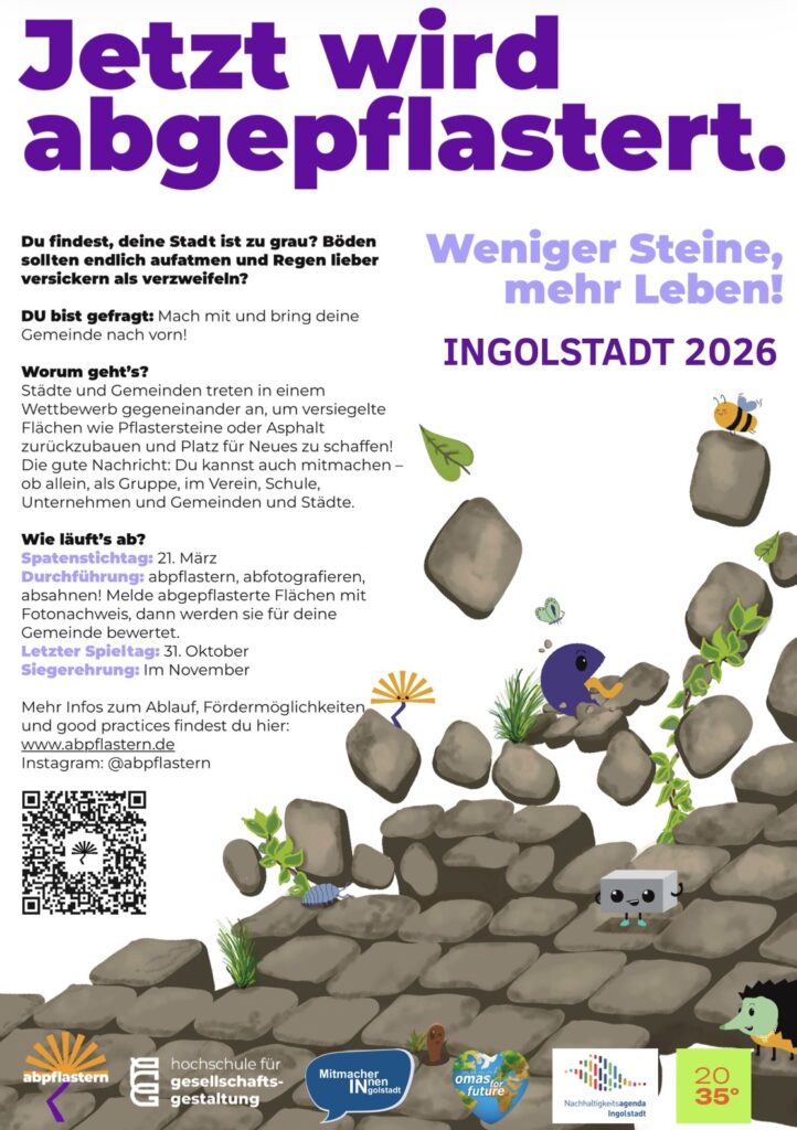 Die Omas for Future (O4F) Ingolstadt gehen in die Offensive und beteiligen sich am deutschlandweiten Entsiegelungs-Wettbewerb „abpflastern“. Sie starten damit ein neues Projekt im Rahmen der MitmacherINnen der Stabsstelle Nachhaltigkeit.