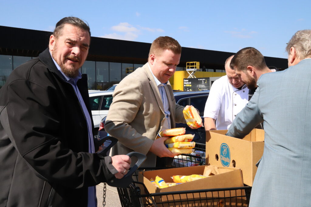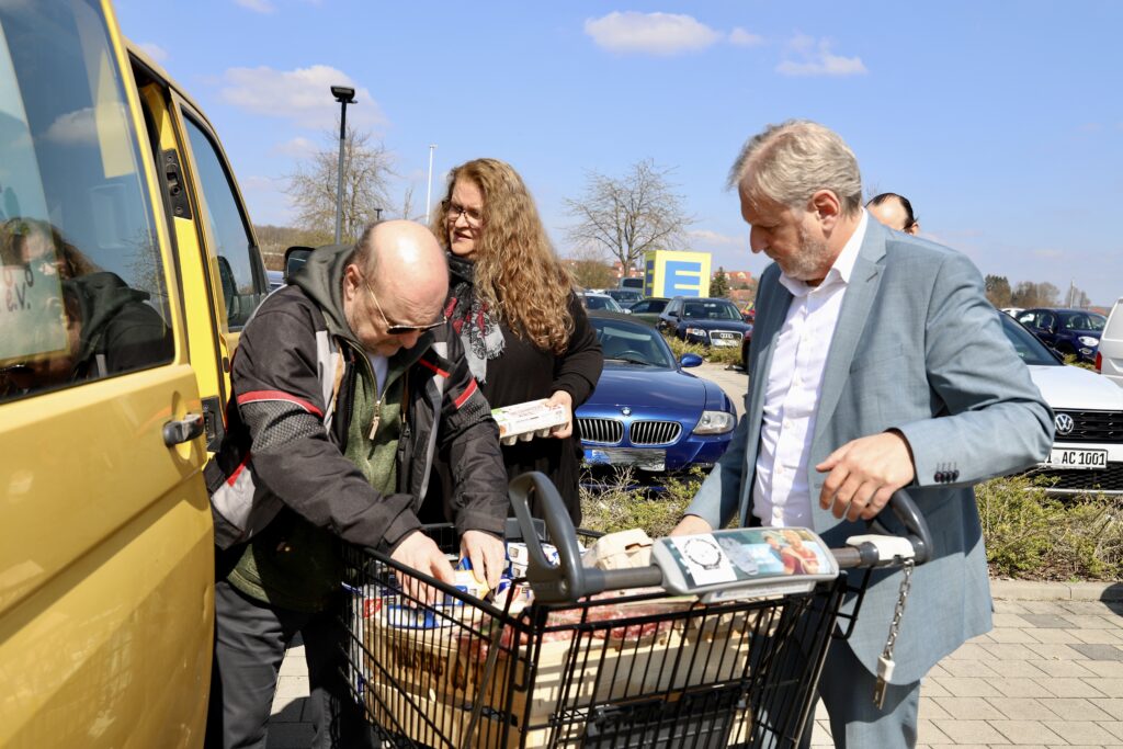 Auf dem Speiseplan stehen Schweinebraten mit zweierlei Knödeln, Spätzle, Blaukraut und Gemüse. Gestern bei der Übergabe blieb es nicht bei einem symbolischen Termin: Die Verantwortlichen packten auch beim Einladen der Waren selbst mit an.